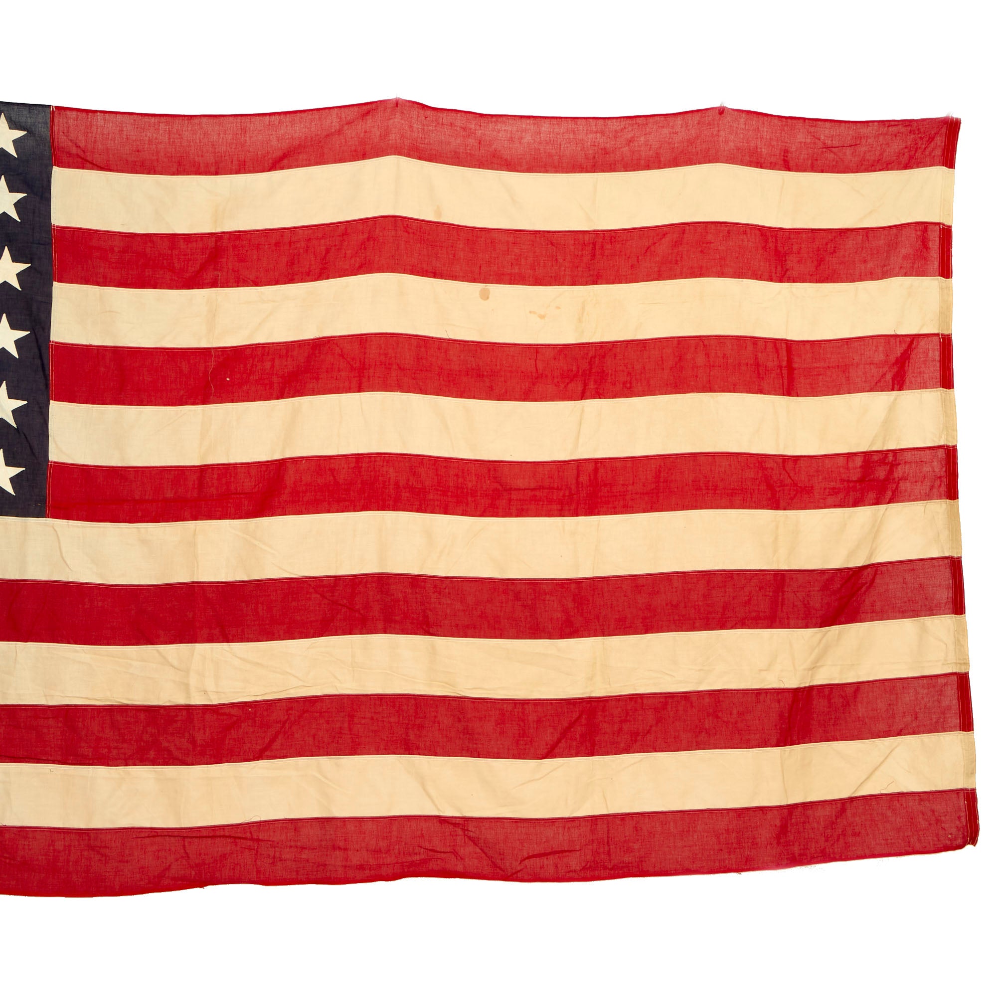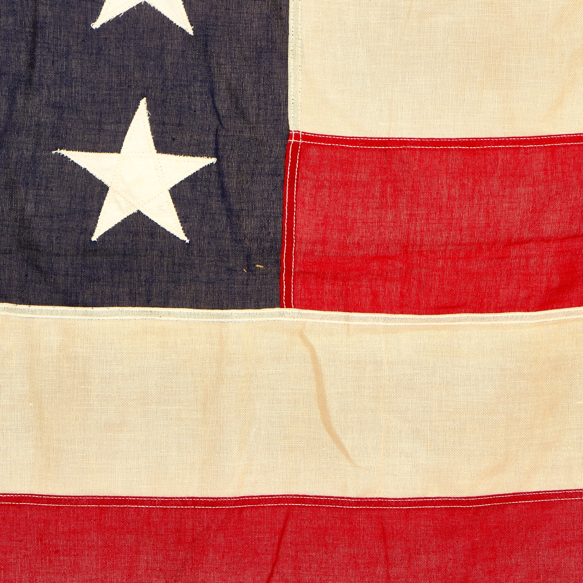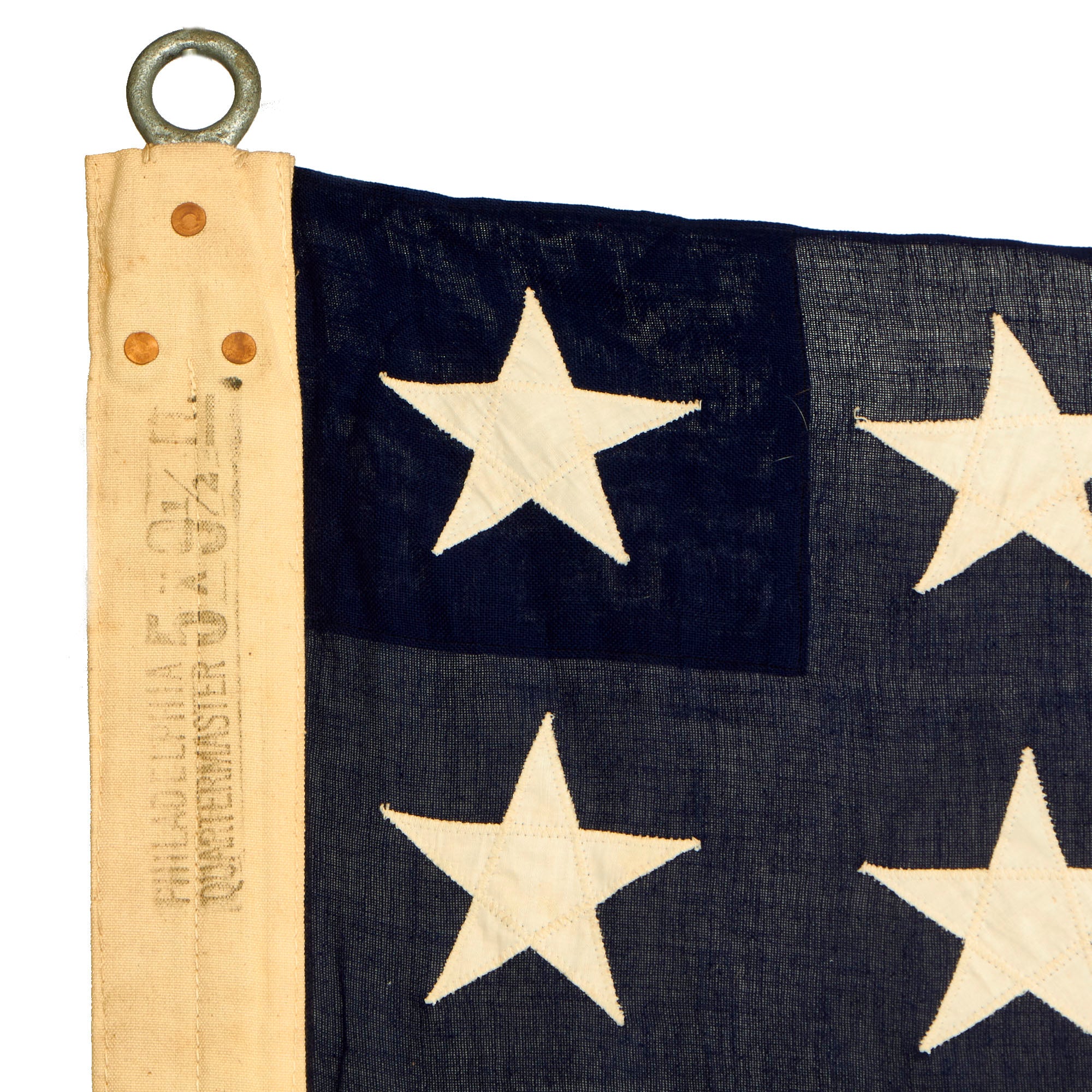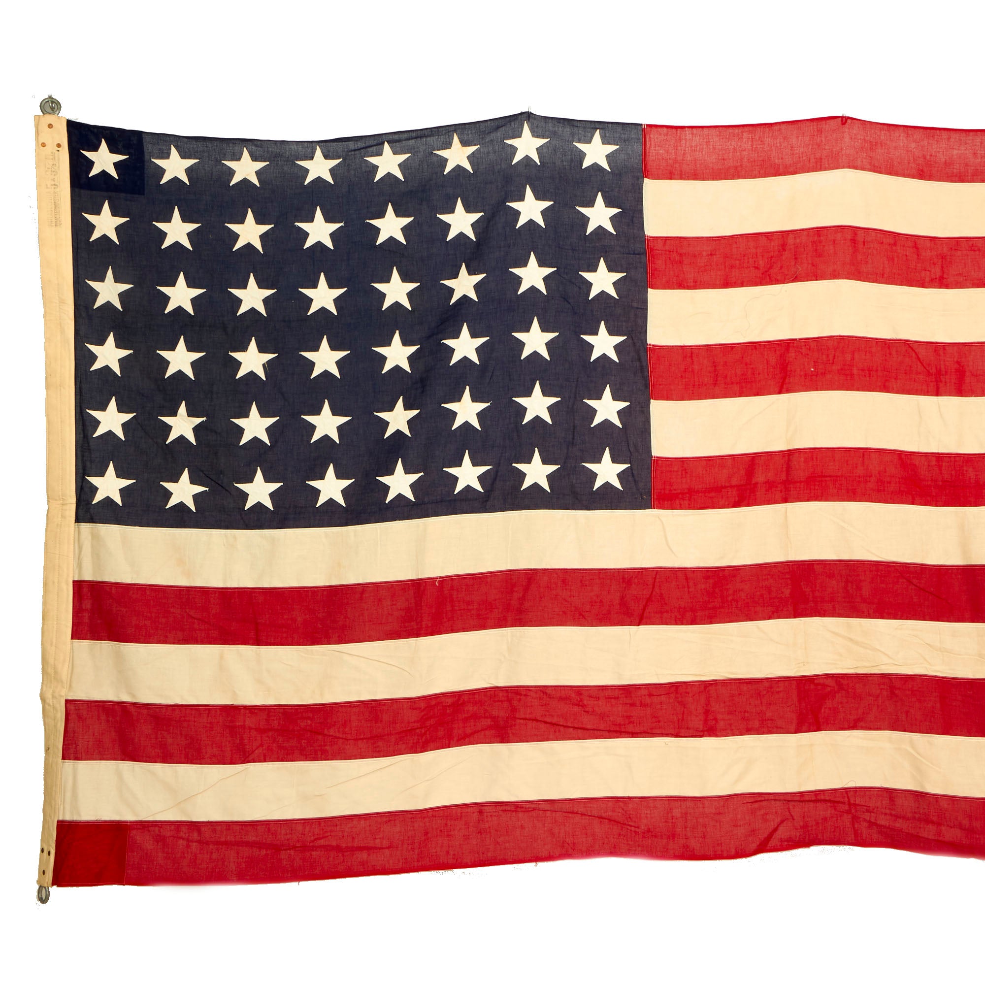 Original Item: Only One Available. This is a very nice World War Two Era 48 Star American Flag, in a nice displayable 115 ½” x 58”. The flag body is of multi-piece construction, with each stripe a separate piece of fabric. It looks to be made of cotton or linen bunting, with a heavy canvas header bearing sturdy steel eyelets on the top and bottom secured by 3 brass rivets each. The stars are separate pieces of cotton, sewn onto both sides of the blue canton. Over the size the flag header is marked with PHILA QM DEPOT.