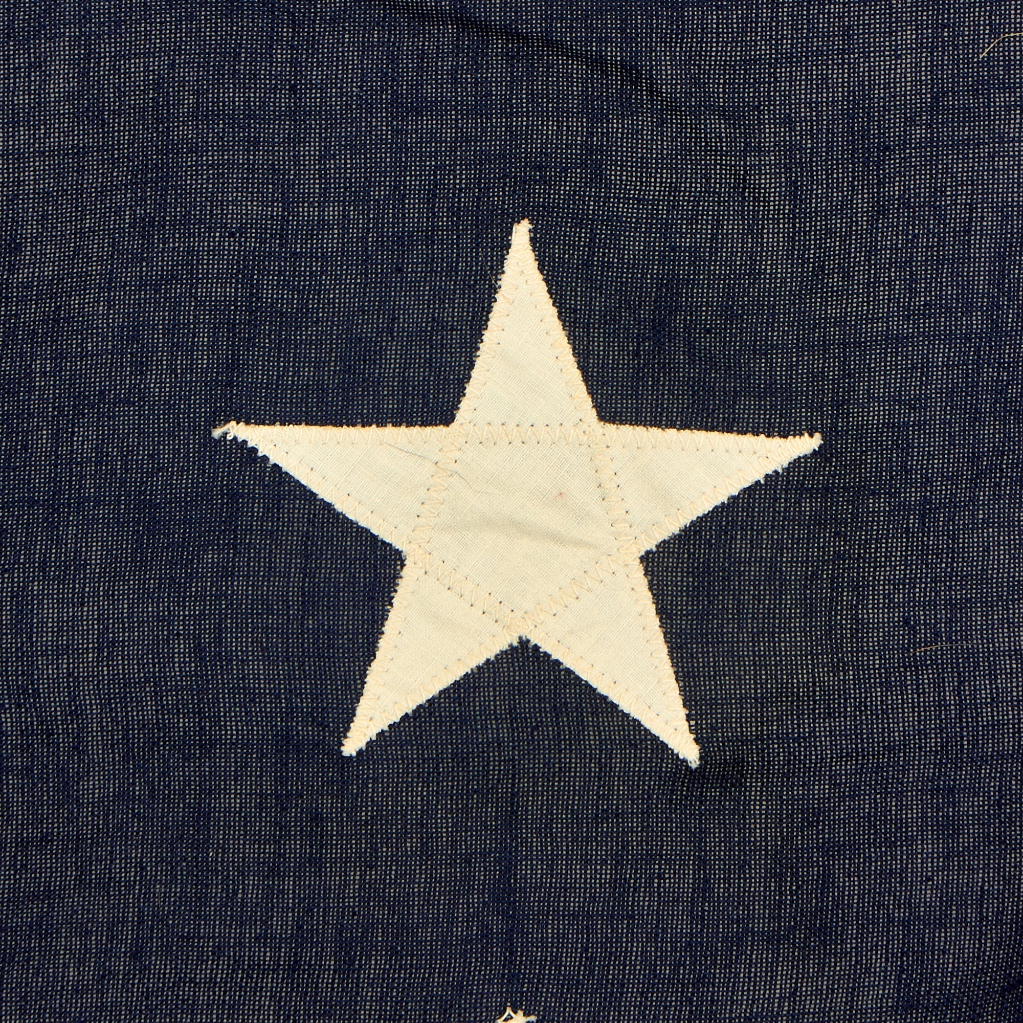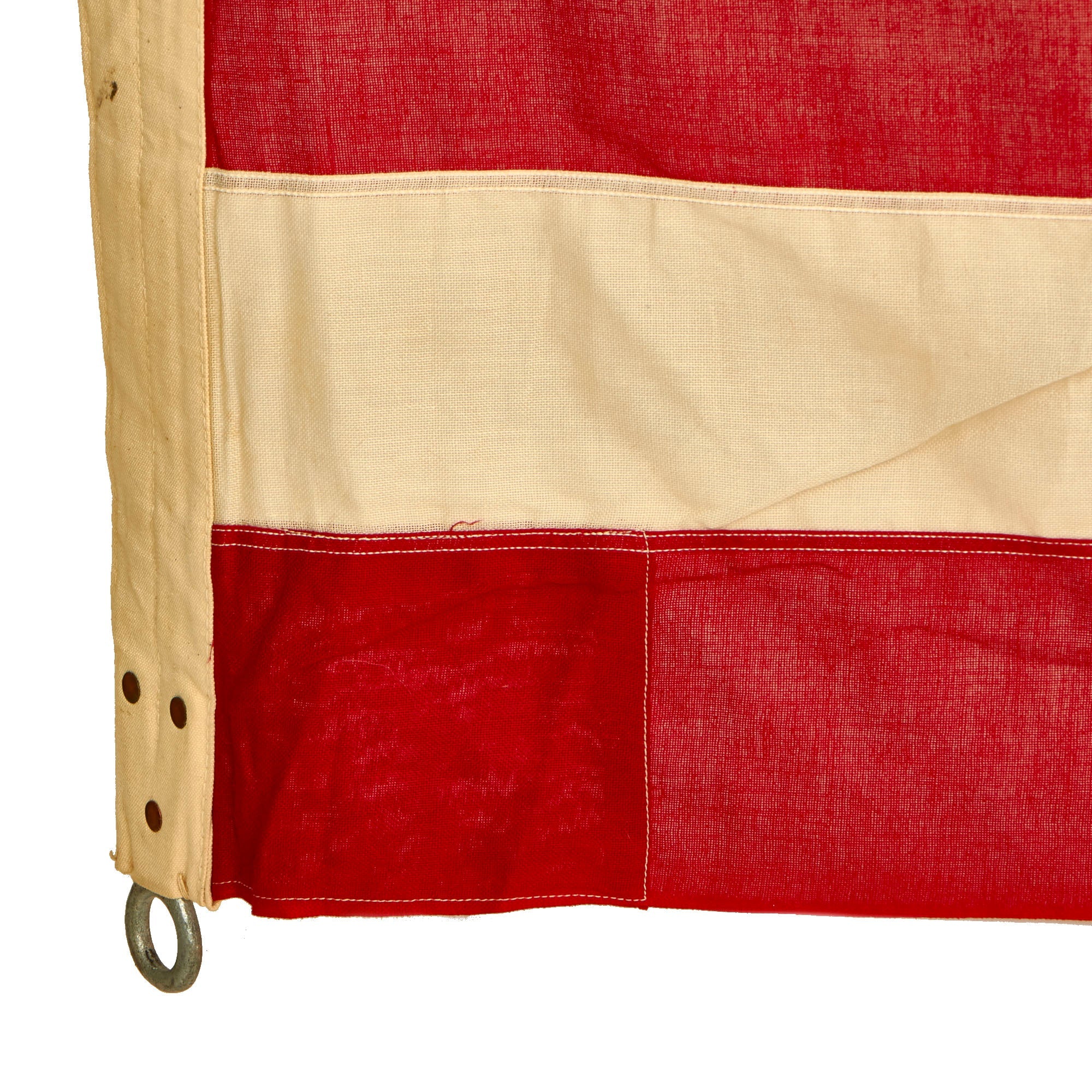 The general rule of thumb is that cotton flags were issued during WWII and nylon flags were issued during the Korean War. Flags made prior to WWII were made of a wool blend. This flag is made from multiple pieces of fabric, with sewn on white stars and zinc grommets. Condition is very good, with the expected age toning and wear from service, as shown.