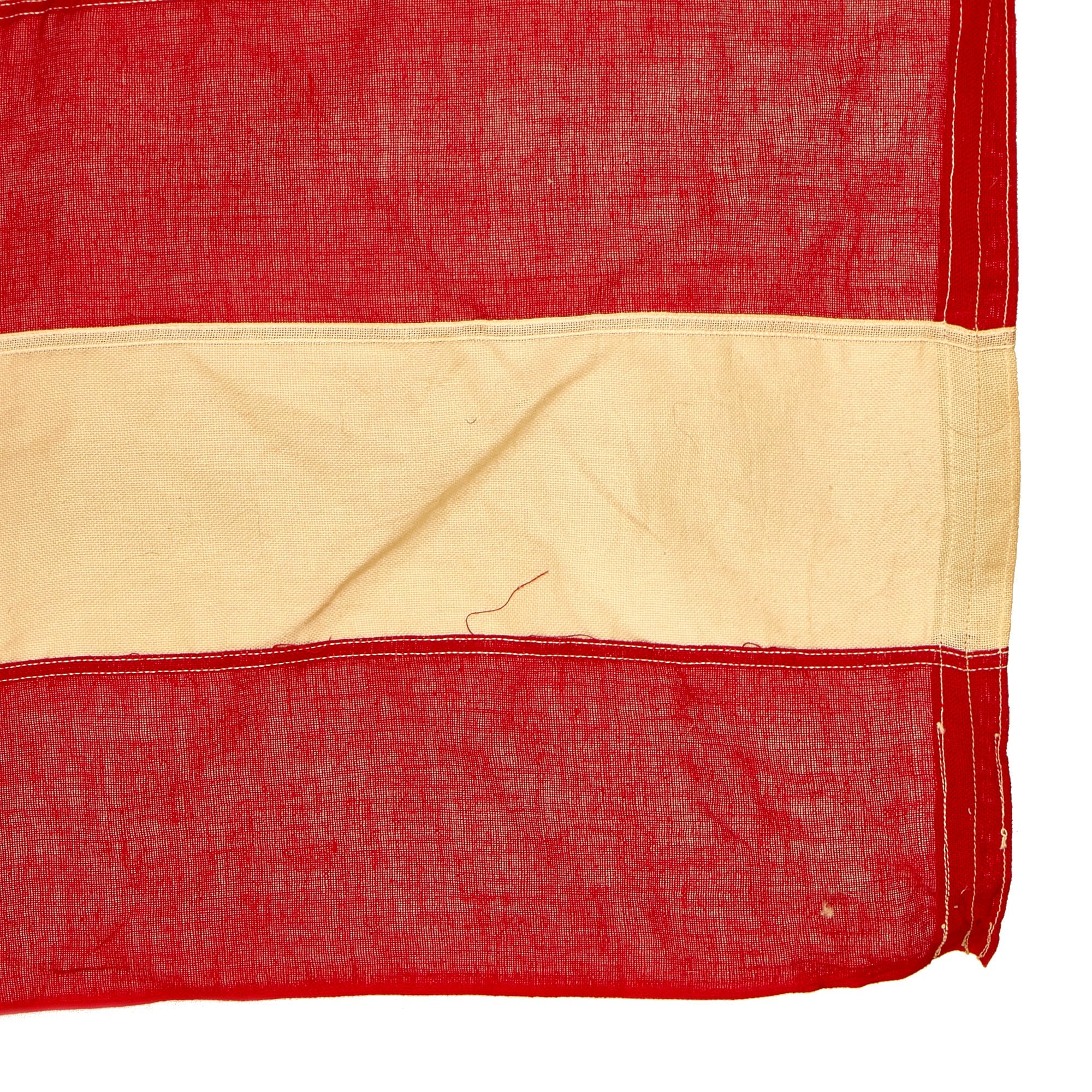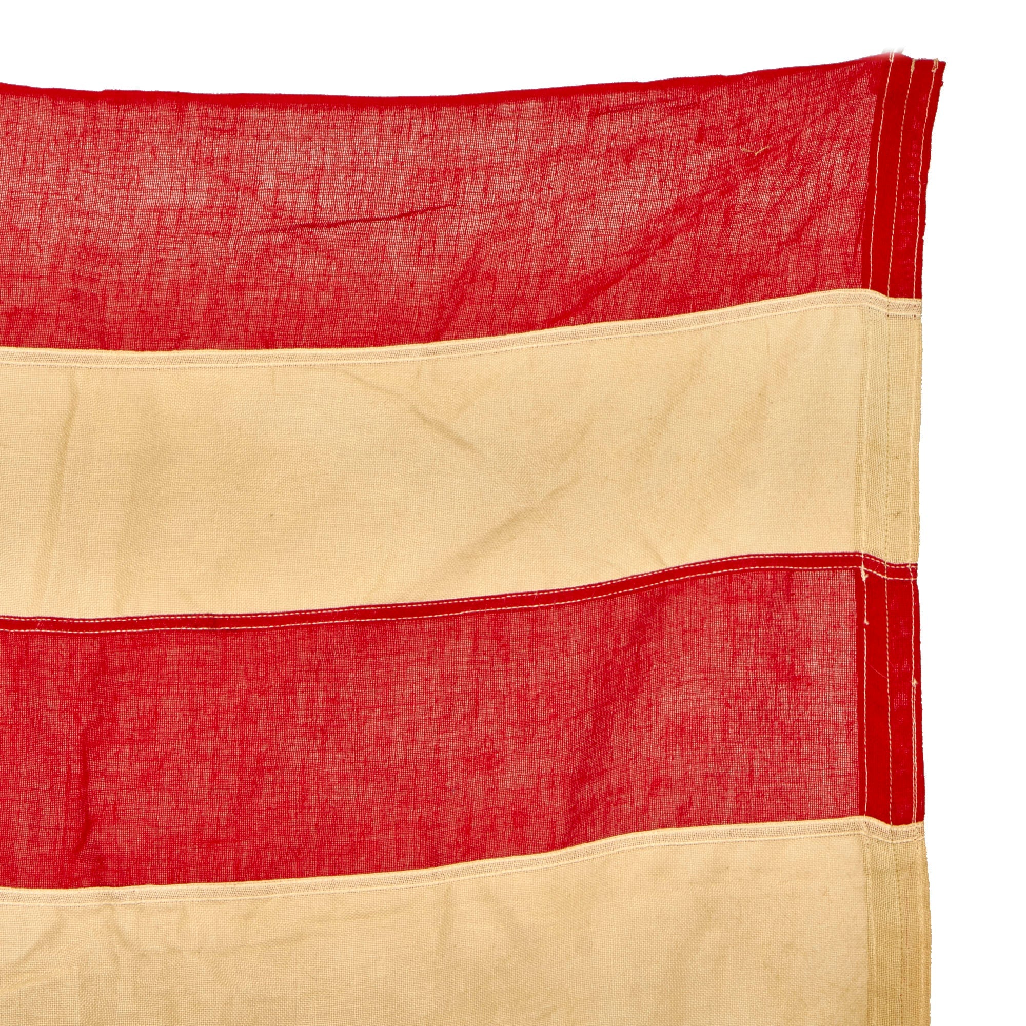 The flag does show some wear, with scattered small tears and pulls. There are also some areas on the edge that show fraying / wear, most likely from rubbing on a sharp edge. The flag has the usual age toning, so the white is now somewhat beige. Very nice example, ready to be properly displayed!