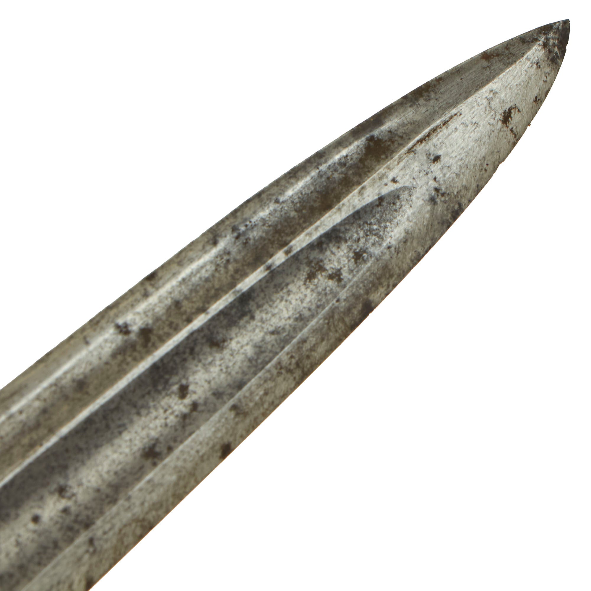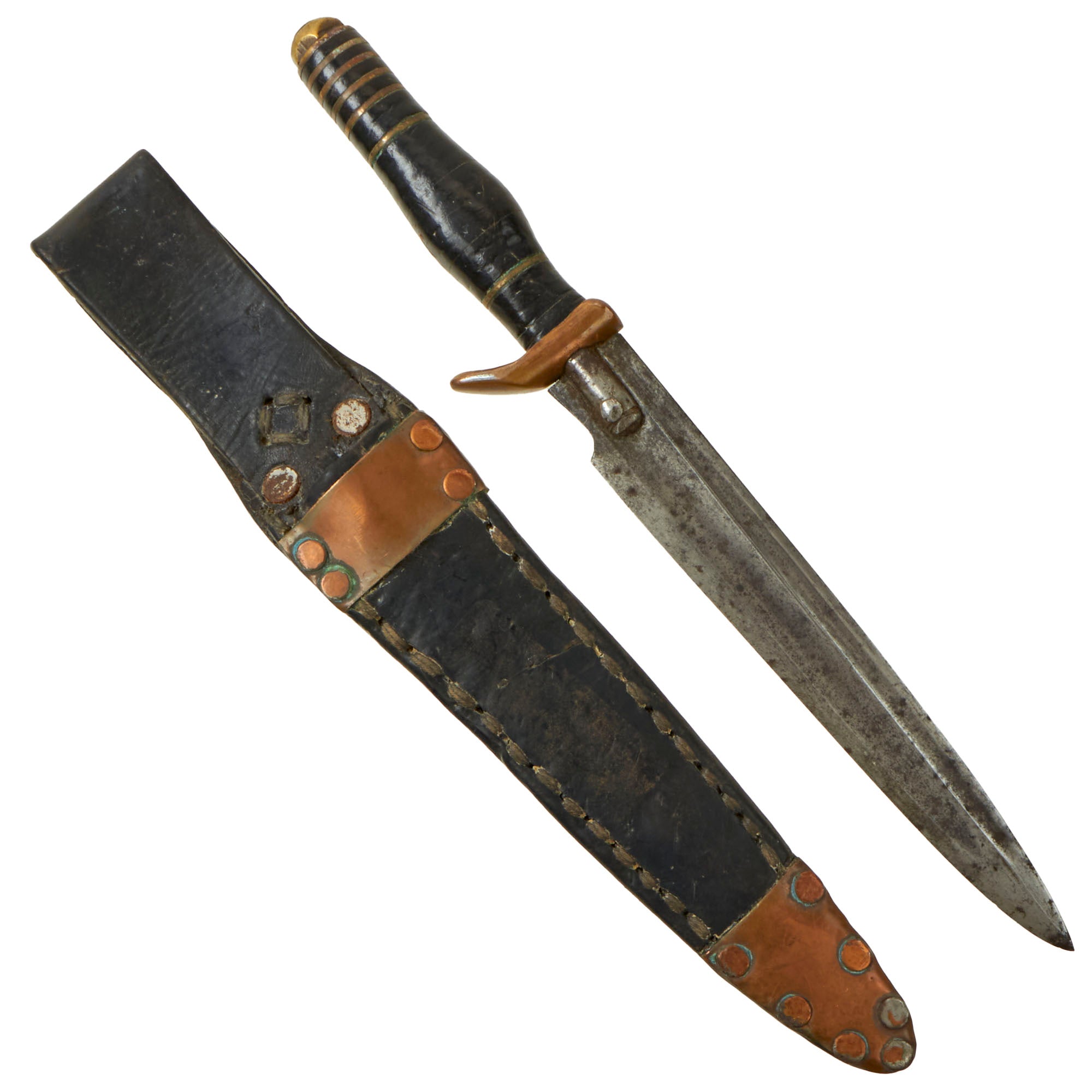 Usually the blades were made from existing weapons or from steel components, and the hilts were cast from metals such as aluminum or zinc. This knife however, was made from an old sword, possibly WWI era or earlier.