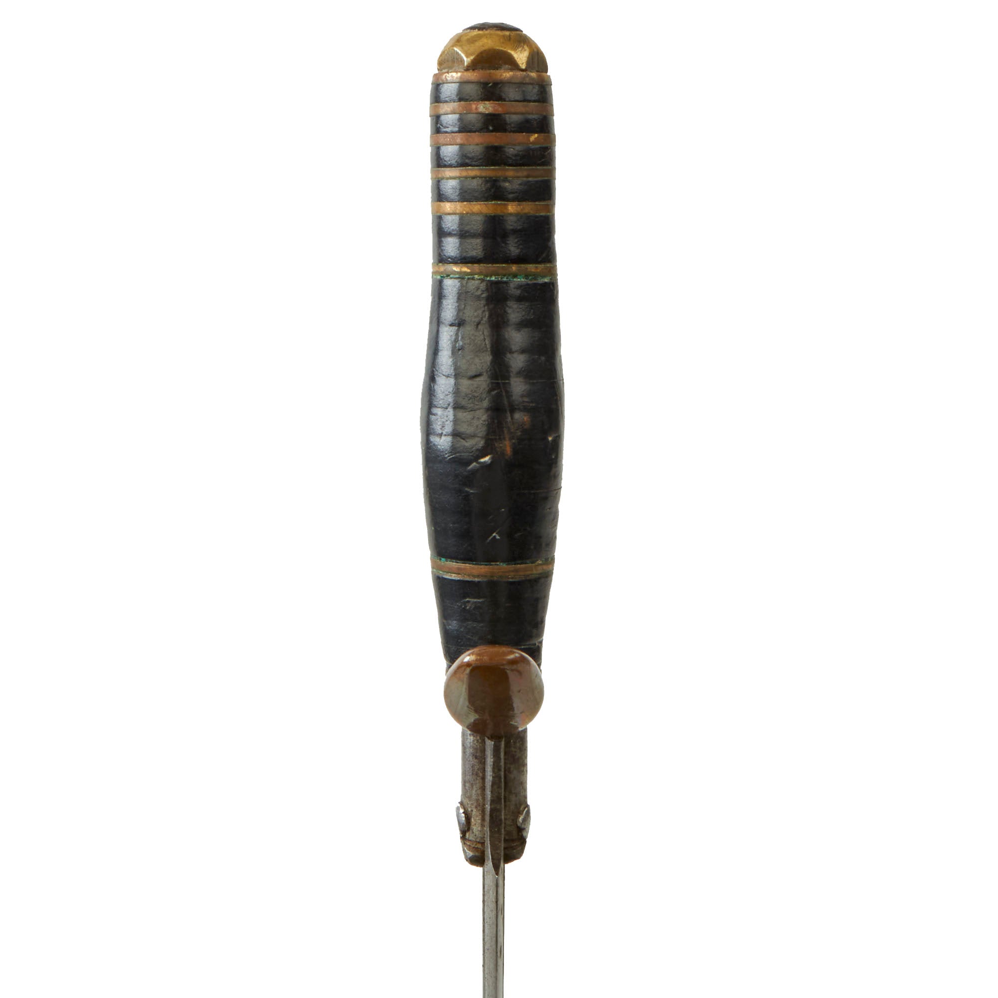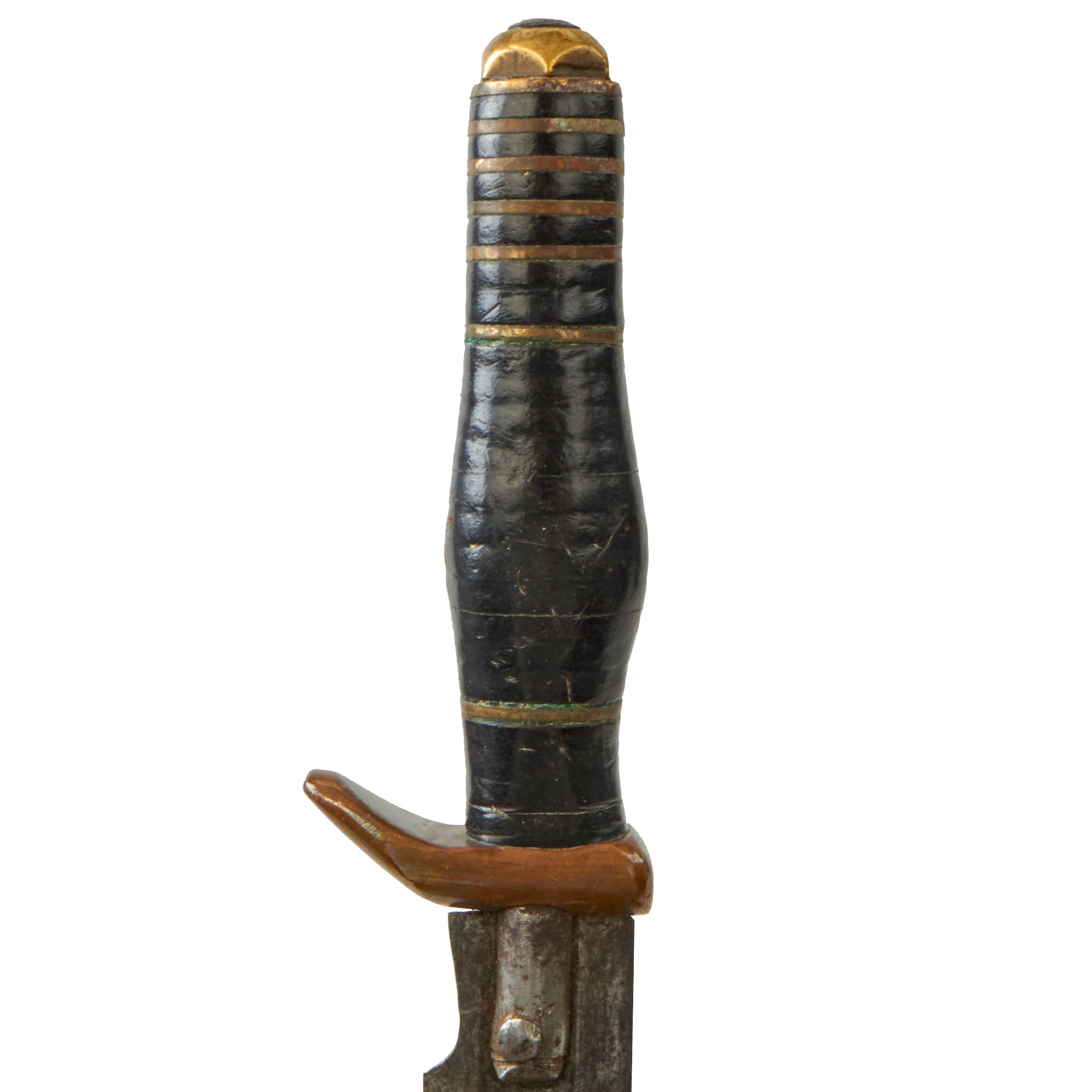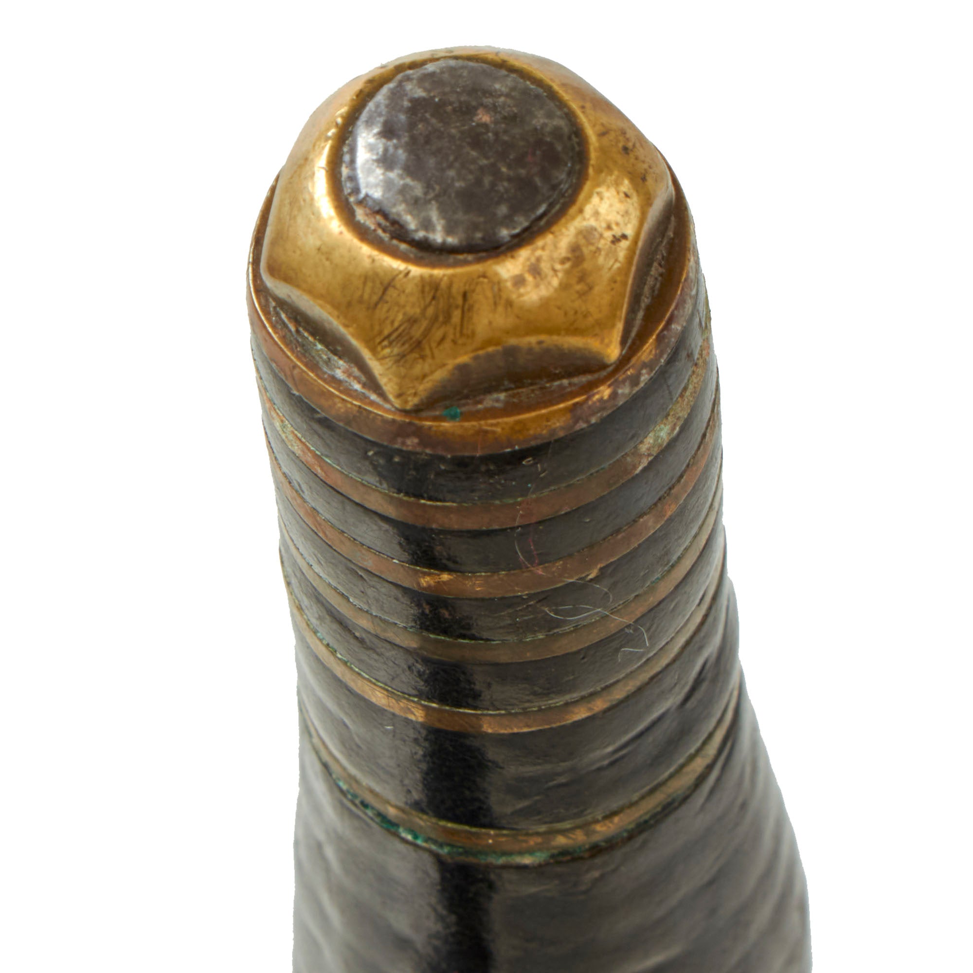 The handle of this knife is made from layers of stacked black leather with brass washers. Both the pommel and crossguard are made from scrap pieces of brass. Condition is quite good, though the blade definitely suffered minor corrosion at some point, which was then cleaned away, probably before it was made into a custom knife.