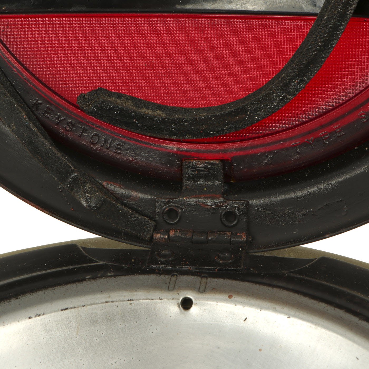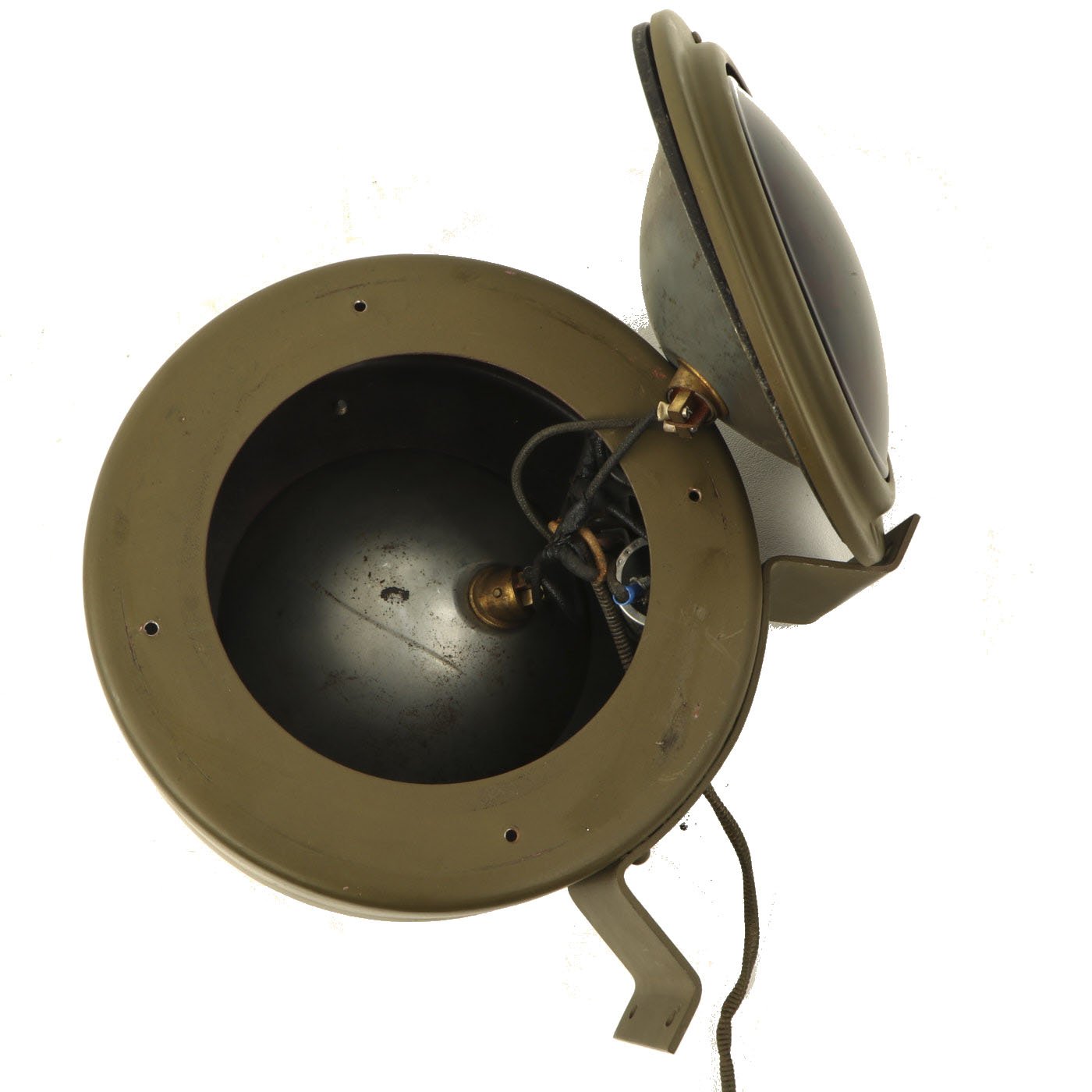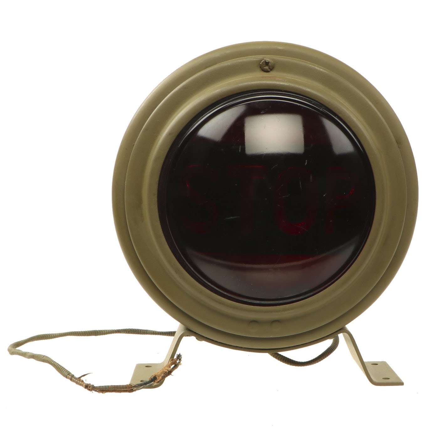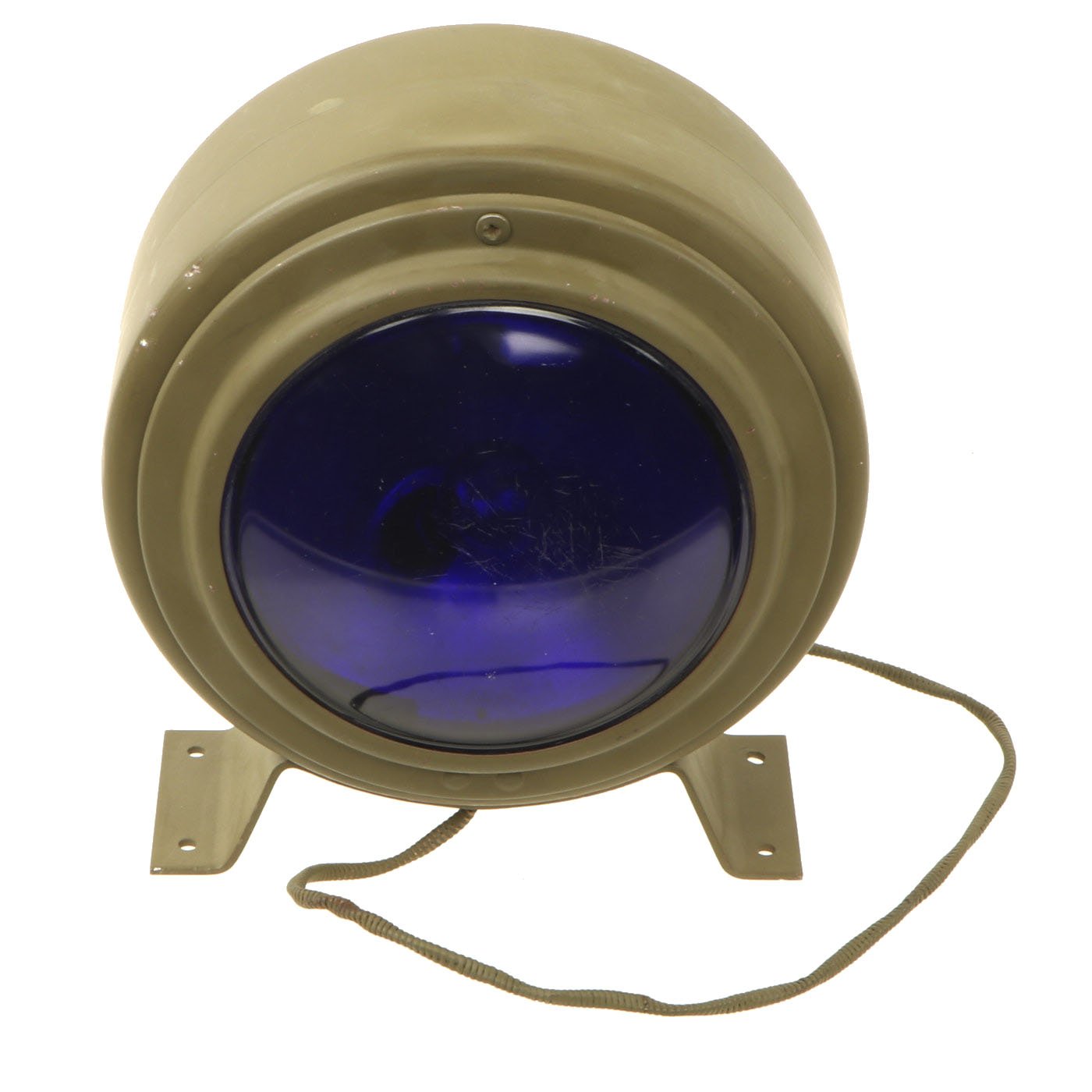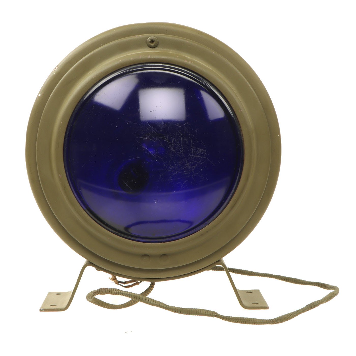 Original Item: Only One Available. We acquired this with a large Army Air Force collection and were told this was a runway airfield light. However, after further research we think it was more likely a flashing emergency vehicle stop light, perhaps for a military Ambulance, medical jeep, or firetruck. The light has a diameter 9". One side features a red glass lens with STOP etched to the interior, the other side has a plain blue glass lens. The red lens is marked "Keystone Type SH". Inside the light are two Tung-Sol flasher units, indicating that this light was designed to flash. There is a steel frame mount to the bottom of the instrument. Based on the wiring and internals this light appears to be from the World War Two era or perhaps just after the was until the 1950s and Korea. Light is offered in very good condition, but we do not know if it still functions. Undoubtedly can be made to work either as is or with replacement parts and a skilled electrician.