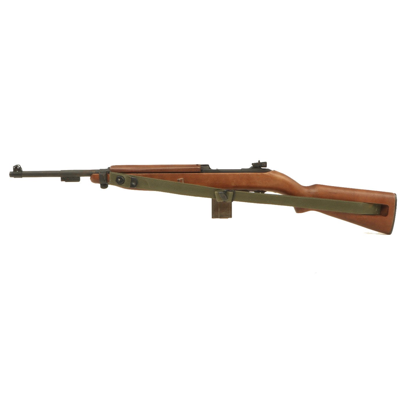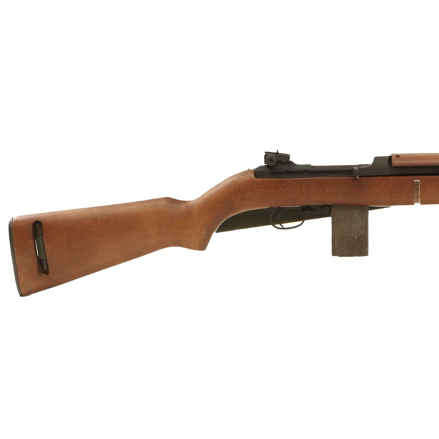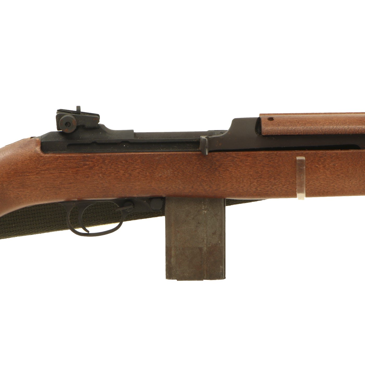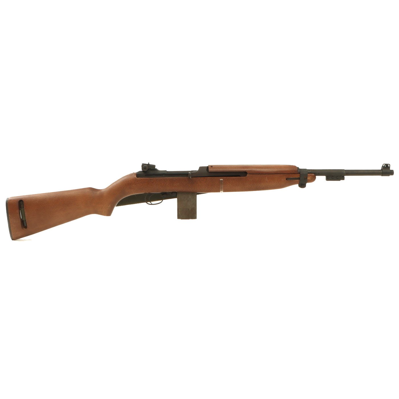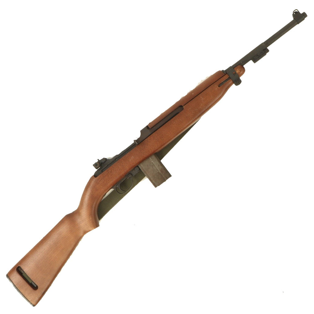 Original Item: Only One Available. This is something that we have not had before! This is a WWII Era M1A2 carbine, which has been constructed using some original parts, attached to a BATF approved dummy receiver. From what we can tell, the barrel, front sight, bayonet lug, magazine & trigger housing, butt plate, barrel band, and adjustable rear sight look to be original. The stock looks to be a surplus original, but we have not disassembled it to find out. The parade display gun comes with an original oiler, sling, and 15 round magazine (deactivated where required). The sling and oiler have been installed in the stock for sometime, so they currently need to be tapped out with a wooden dowel and hammer if you want to remove them.