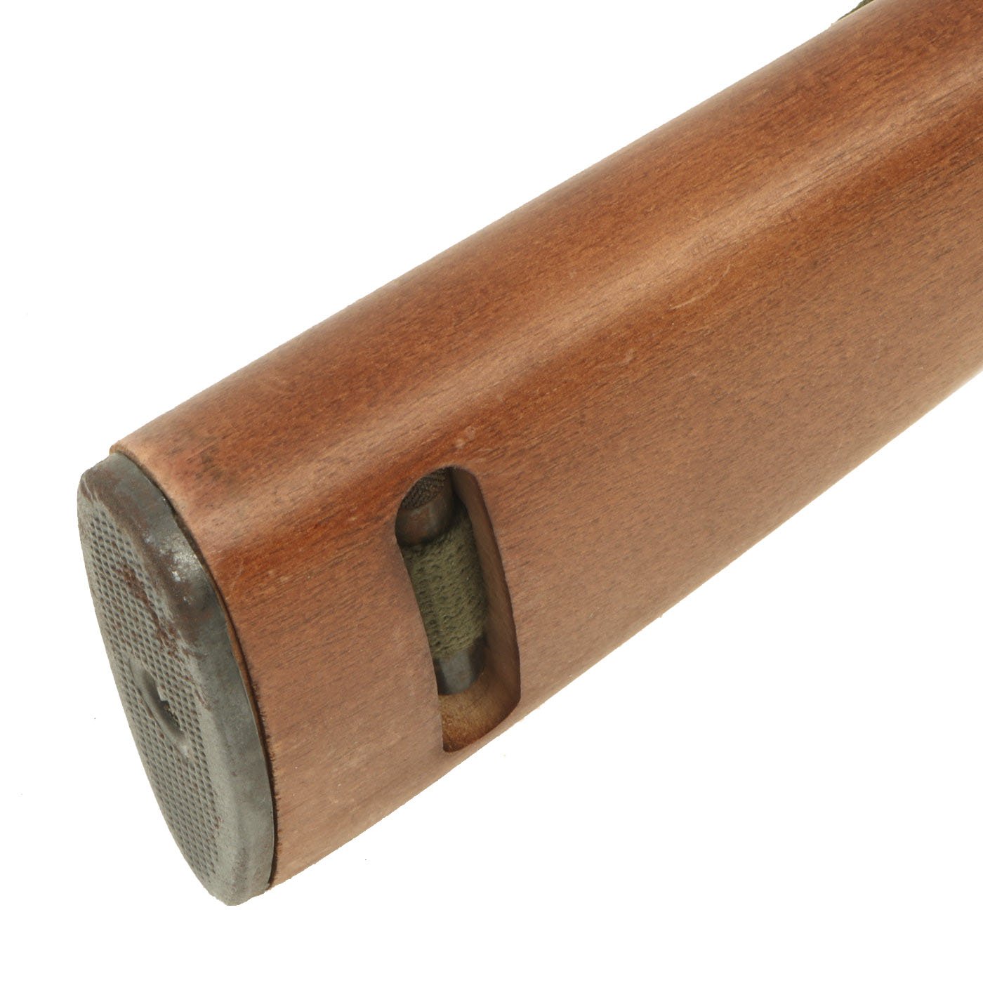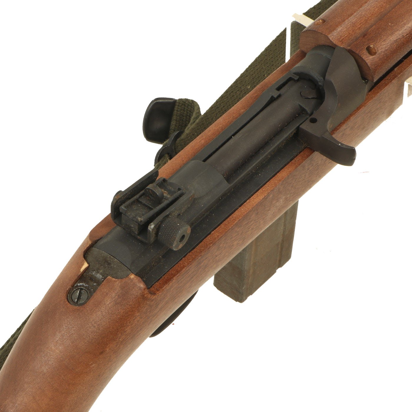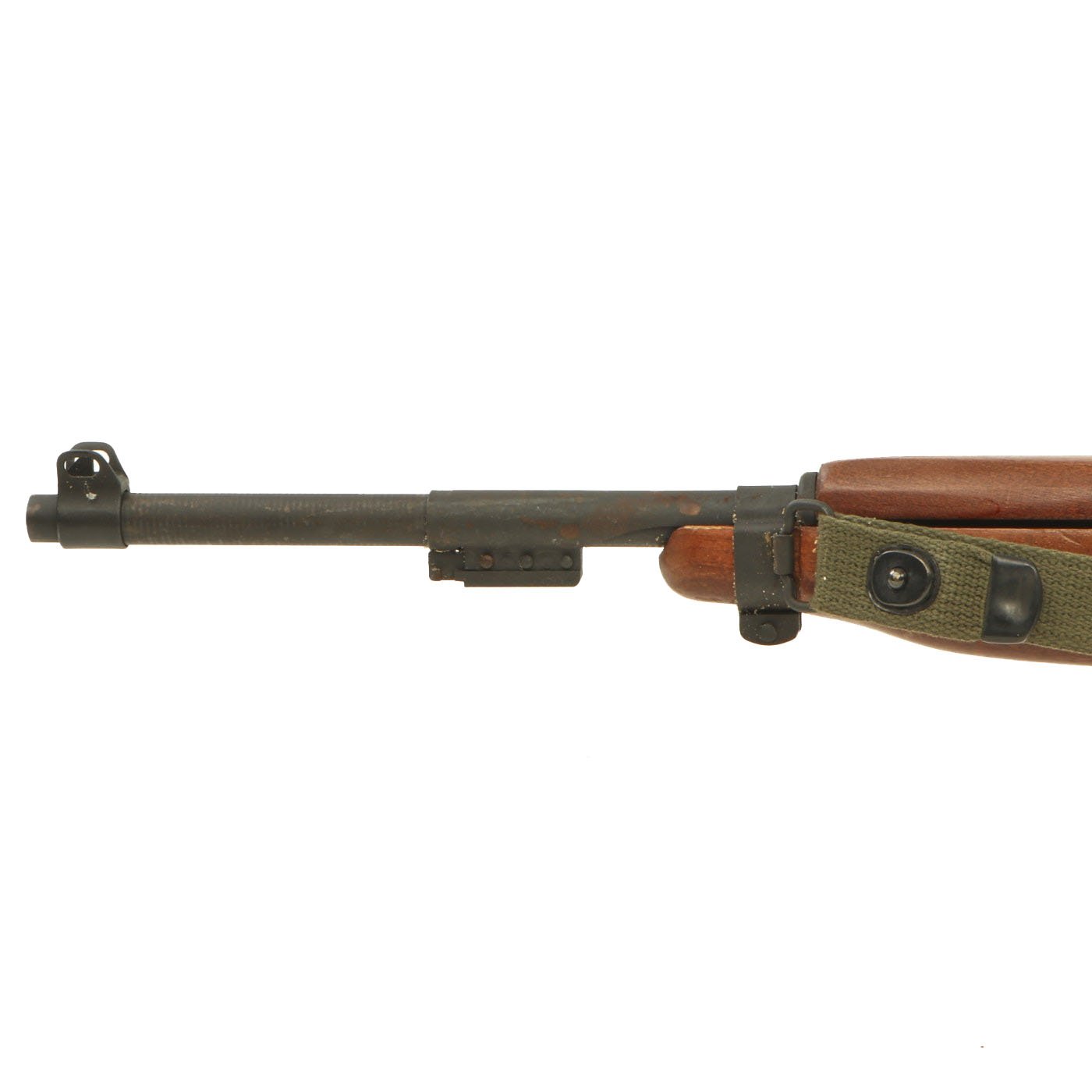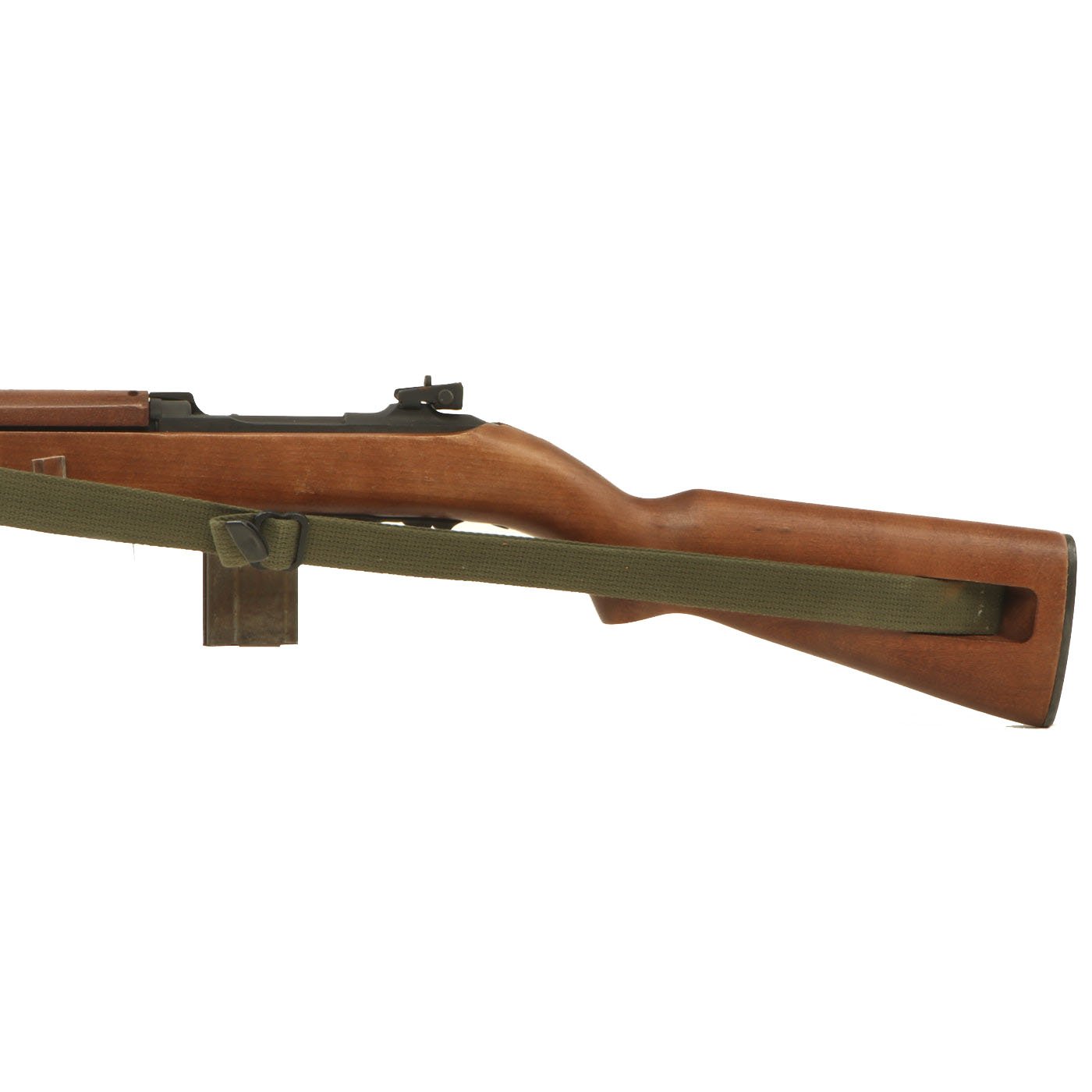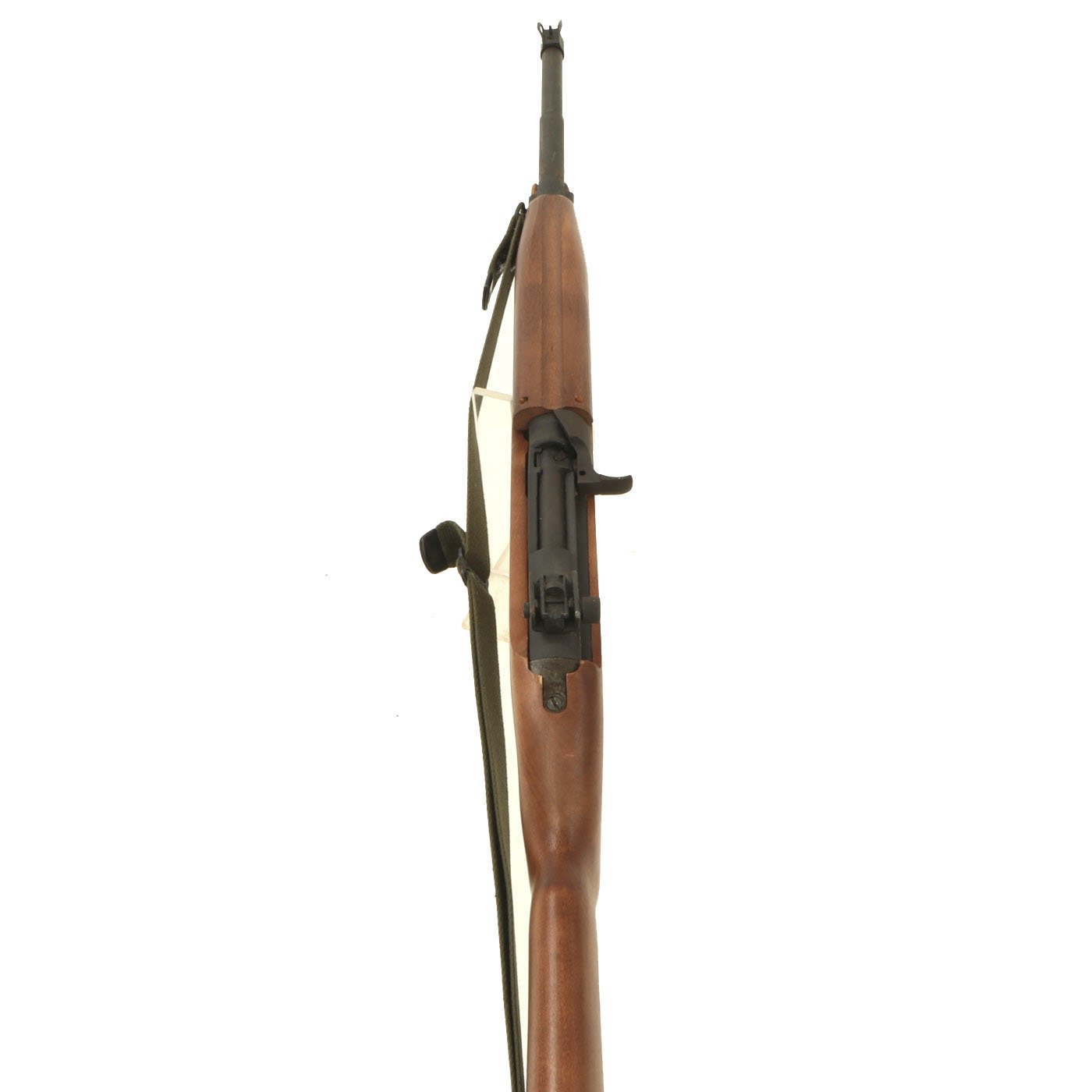 Original Item: Only One Available. This is something that we have not had before! This is a WWII Era M1A2 carbine, which has been constructed using some original parts, attached to a BATF approved dummy receiver. From what we can tell, the barrel, front sight, bayonet lug, magazine & trigger housing, butt plate, barrel band, and adjustable rear sight look to be original. The stock looks to be a surplus original, but we have not disassembled it to find out. The parade display gun comes with an original oiler, sling, and 15 round magazine (deactivated where required). The sling and oiler have been installed in the stock for sometime, so they currently need to be tapped out with a wooden dowel and hammer if you want to remove them.