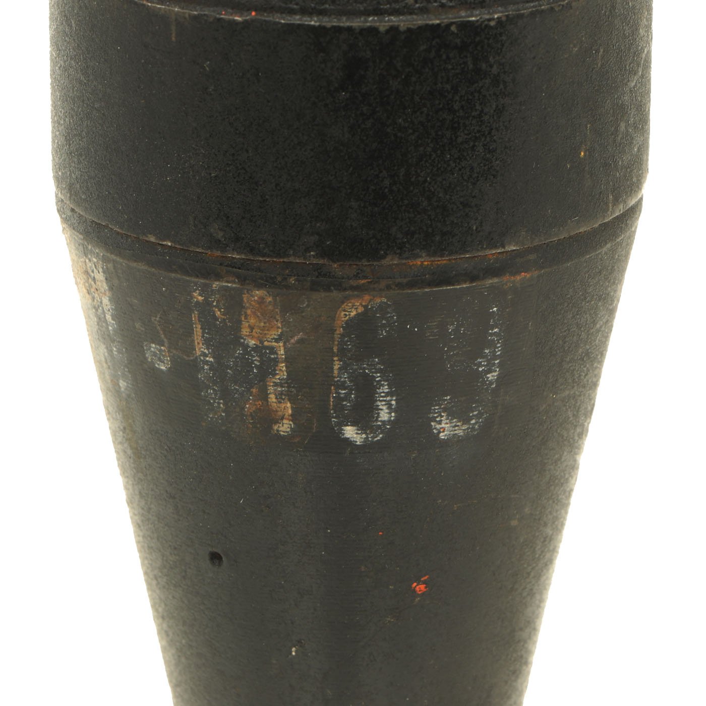 These are hard to find WWII Era M69 Training / Practice Cartridges, as used with the U.S. WWII issue M2 60 Mortar. This mortar also continued to be used during the Korean war, and into the Vietnam era. The training cartridge itself is a shell with a cast iron body, inert filler, and detachable fin assembly used to train recruits in firing. The cast iron body is reusable and the fin assembly can be replaced if damaged.