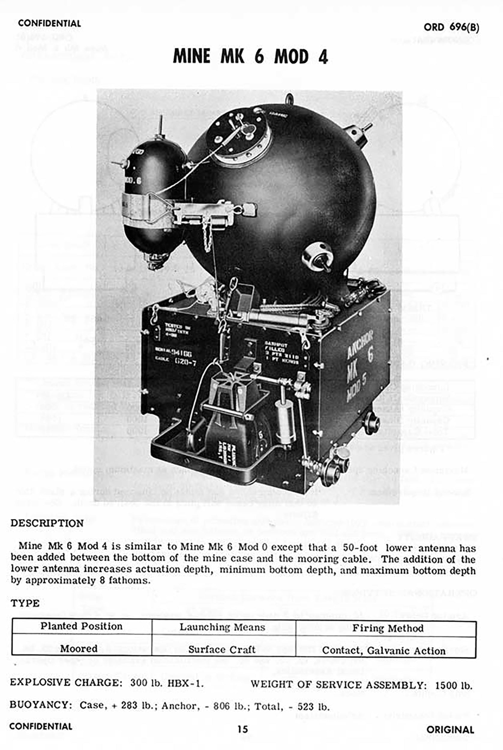 The Mark 6 was very successful and remained in US inventories until about 1985, making it the USA's longest-lived mine. 1,400 lbs. (635 kg) total, charge of 300 lbs. (136 kg) TNT. Could be moored in waters up to 3,000 feet (914 m) deep. Three safety devices were employed, one a time delay, one a hydrostatic which held a switch open until the mine had sunk several feet underwater and the third to keep the explosive steps open until the mine had reached a considerable depth. Mod 2 was a rising type, Mod 3 had a Mark 9 case with a 100 foot (30 m) lower antenna. Mod 4 had a Mark 6 case with a 50 foot (15 m) lower antenna. All of these had a few Hertz (acid) horns as a backup firing mechanism. Early units used in the North Sea Barrage had reliability problems, with 4 to 8 percent firing shortly after being planted.