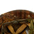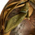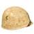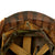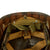 This true US WWII M-1 helmet liner can be identified through the frontal eyelet hole. Other correct WWII features include OD Green #3 cotton herringbone twill (HBT) cloth suspension liner, with the webbing in poor shape. This HBT suspension is still held tightly within the M-1 helmet liner by rivets and a series of triangular "A" washers. The three upper suspension bands are joined together with a string but one of the webbing straps is unfortunately torn away. This way the wearer could adjust the fit. The sweatband is still partially present, showing extensive material loss and cracking The leather liner chin strap is present and in a delicate state.