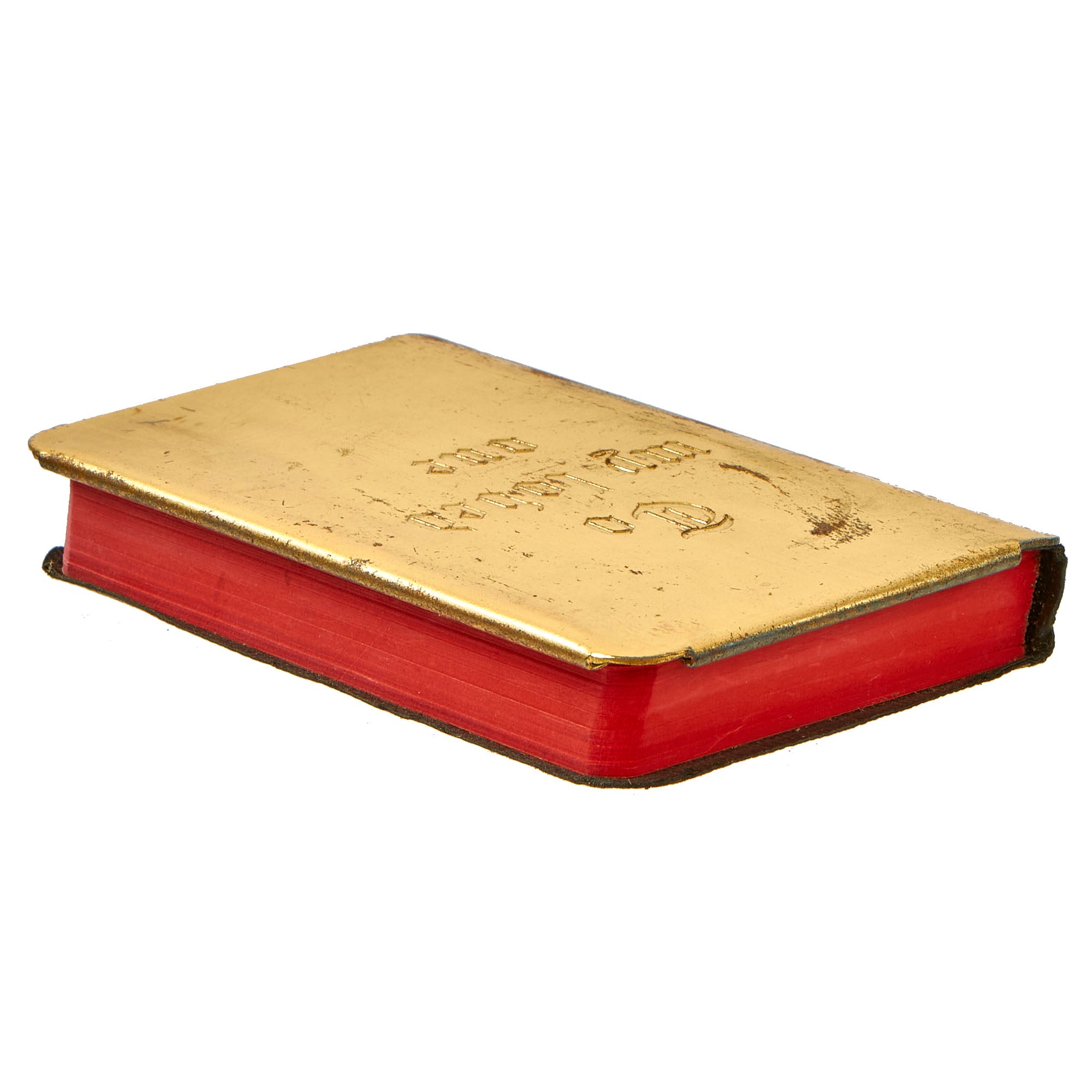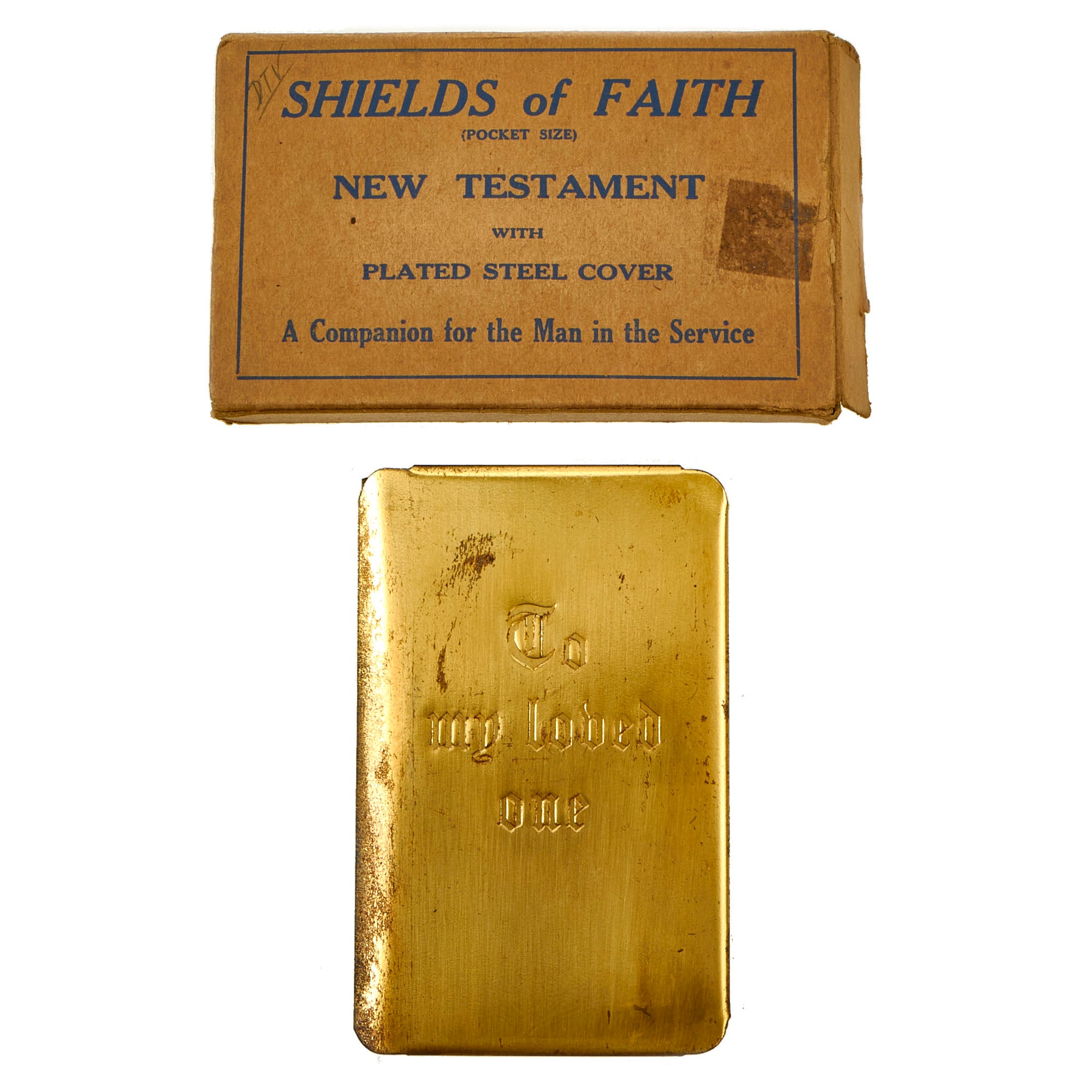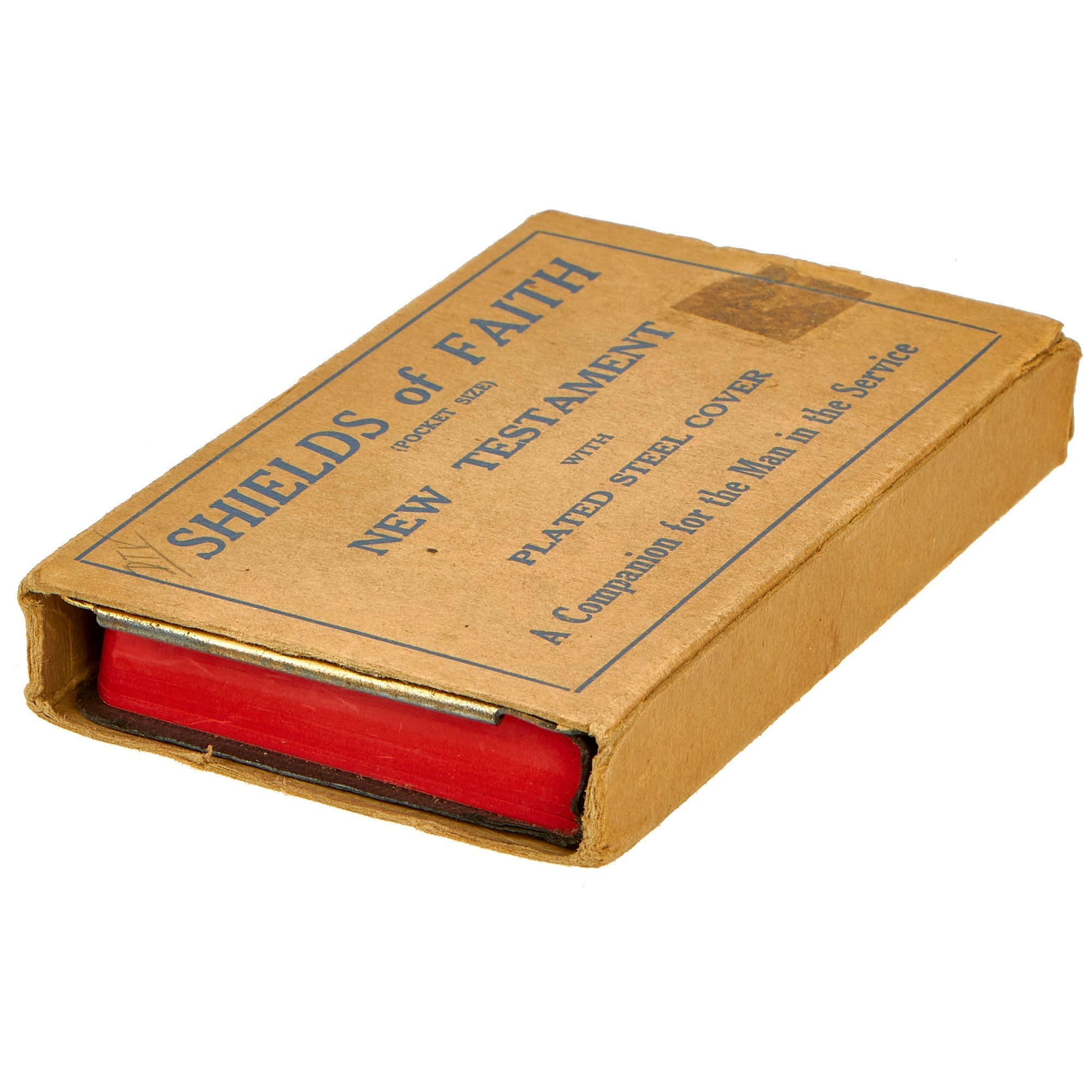 This example is in wonderful condition and does not show evidence of having been carried and comes with the original Shield of Faith mailing box. Unfortunately this example is not named but that does not take away from the beauty and historical significance. The bible measures approximately 4 ½” x 3” and is offered in wonderful condition.