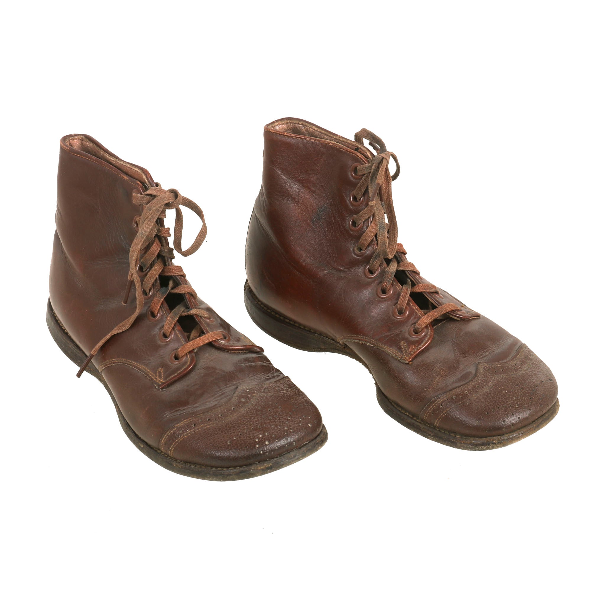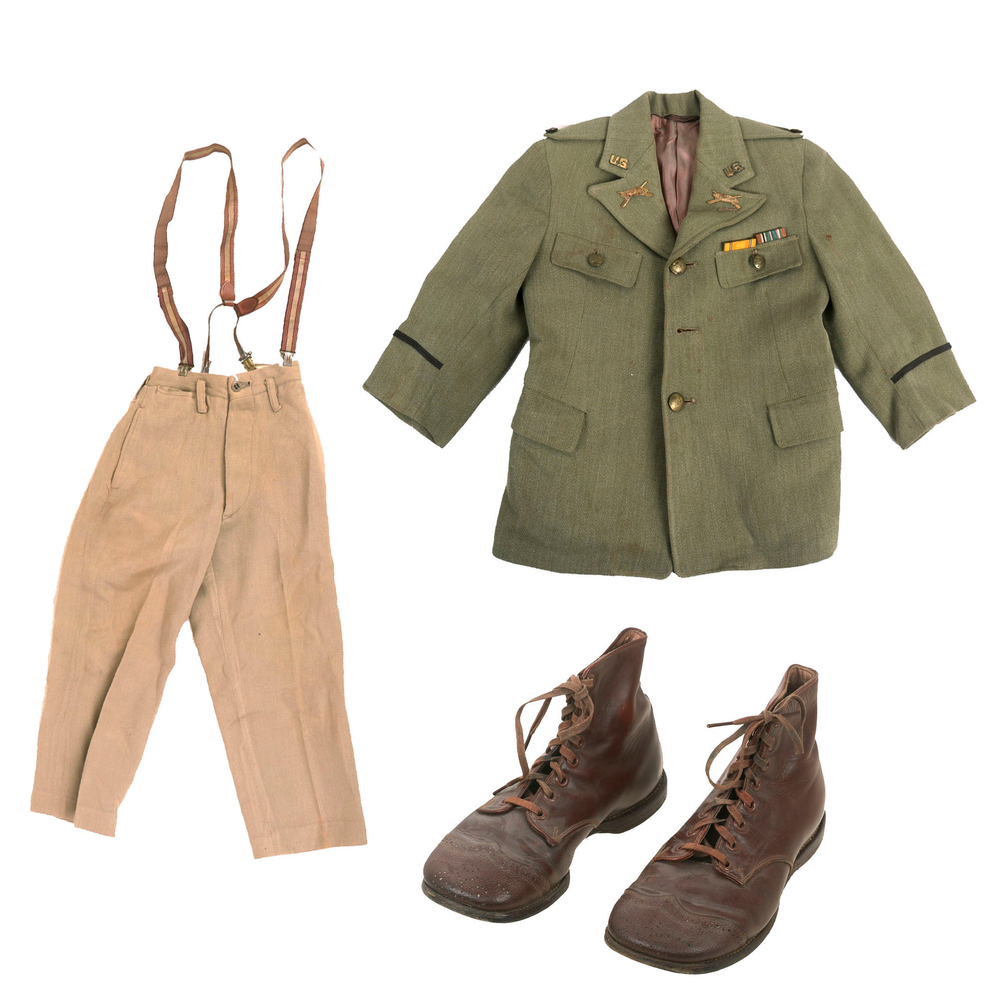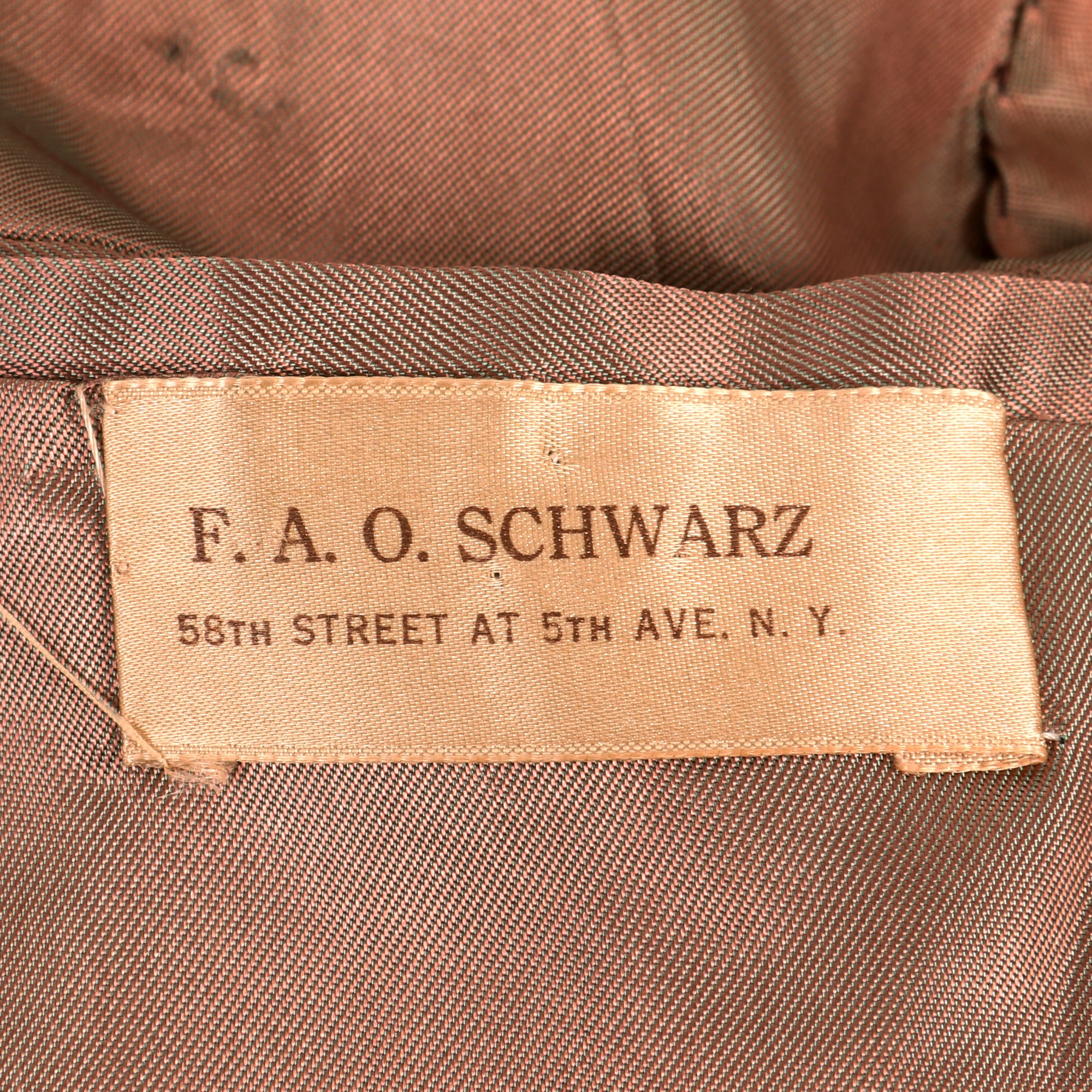 The set is in wonderful condition and even comes complete with a set of trousers, suspenders, and a pair of boots. The jacket has gilt Tank Corps collar insignia and U.S. officer’s collar insignia. There are two ribbons above the left breast pocket, the American Defense Medal and the European African Middle Eastern Campaign Medal, likely belonging to the father of the wearer. The jacket is in great condition and has a tag for the famous F.A.O. SCHWARZ, the world’s most famous toy store located at 58th Street at 5th Ave in Manhattan. The jacket is well designed which makes sense given the maker. There is no maker’s tag on the trousers or suspenders but both are in great shape and go with the jacket. The boots are marked on the inside to Arrow Head, but the markings are faint. This is a fantastic child’s Tank Corps uniform set.