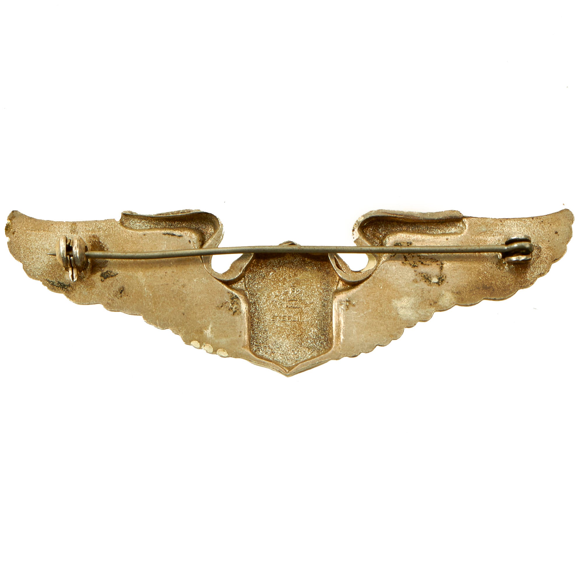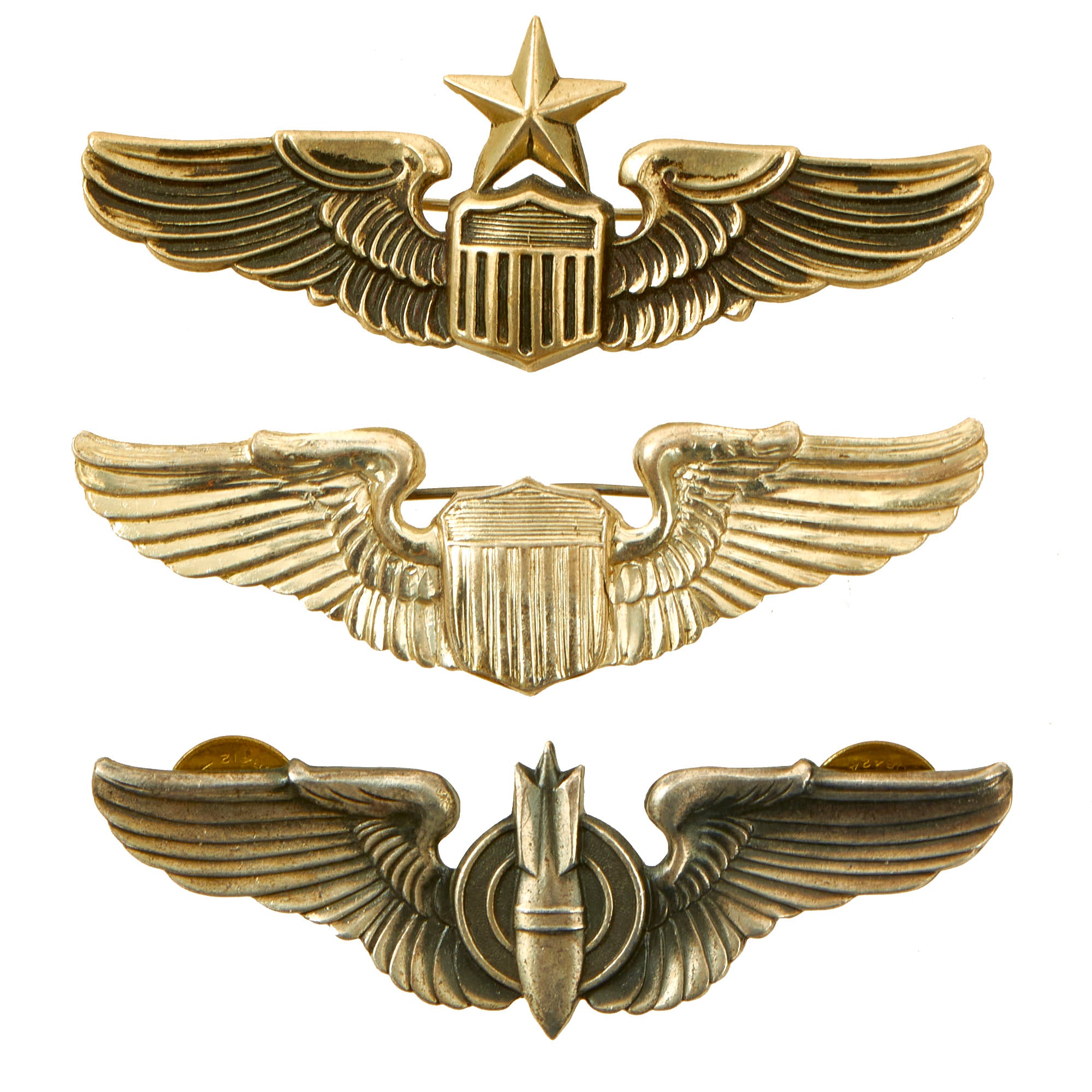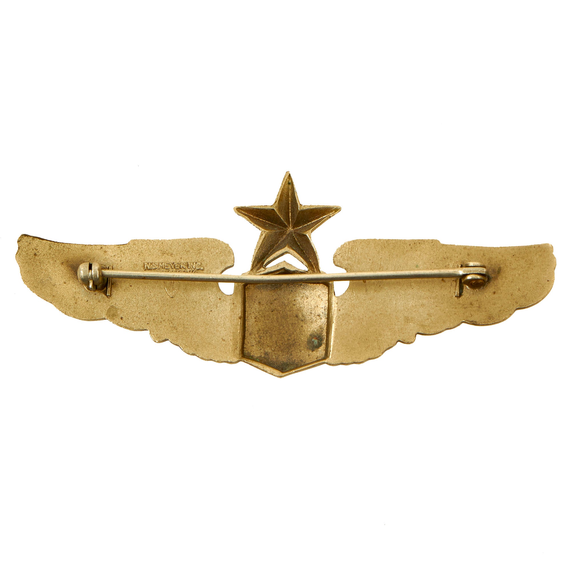 - Senior Pilot “Wings” Badge: During the Second World War, with the rise of the Army Air Forces, a second series of aviator badges was issued to include a design that has survived to the modern day. The Army Air Corps Pilot Badge was issued in three degrees, including Pilot, Senior Pilot, and Command Pilot, and this badge was the predecessor of the modern United States Air Force Pilot Badge. The Enlisted Aviator Badge was eliminated, since the new pilot corps was composed entirely of officers. The reverse is marked with NS Meyer Inc. New York.