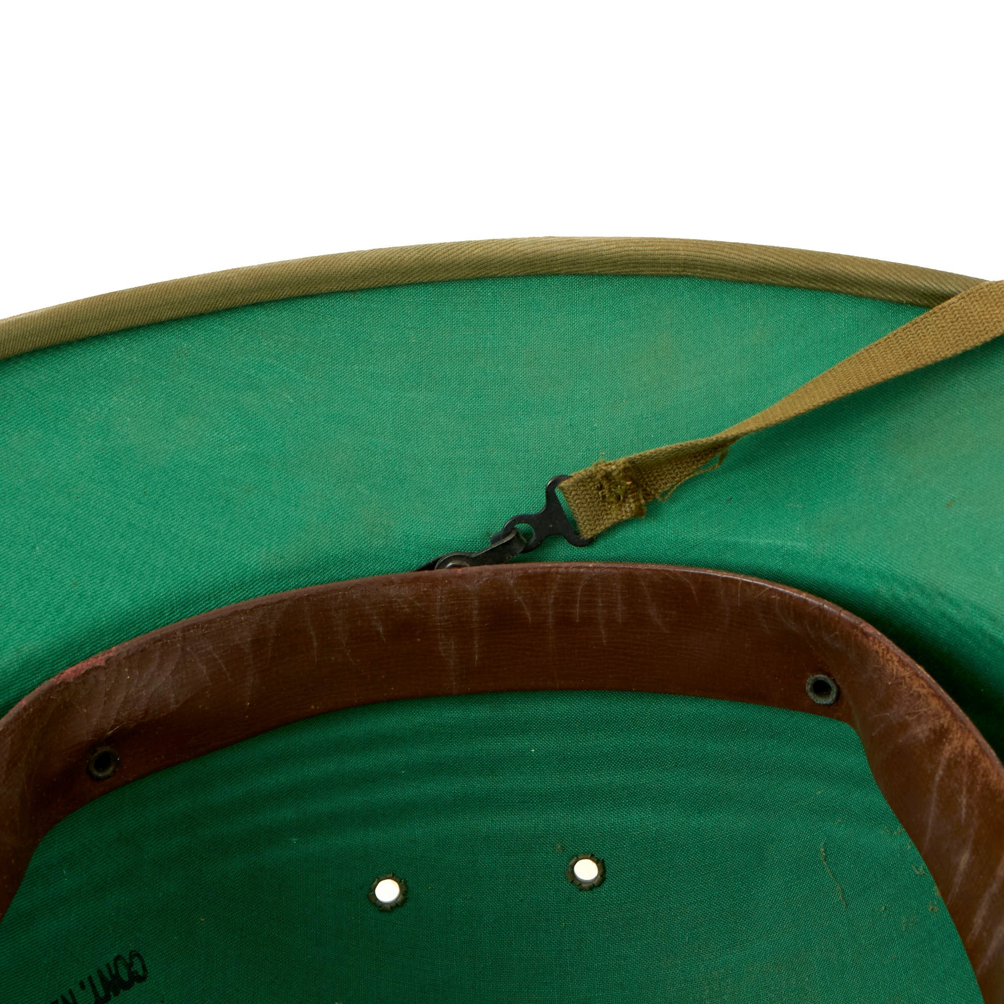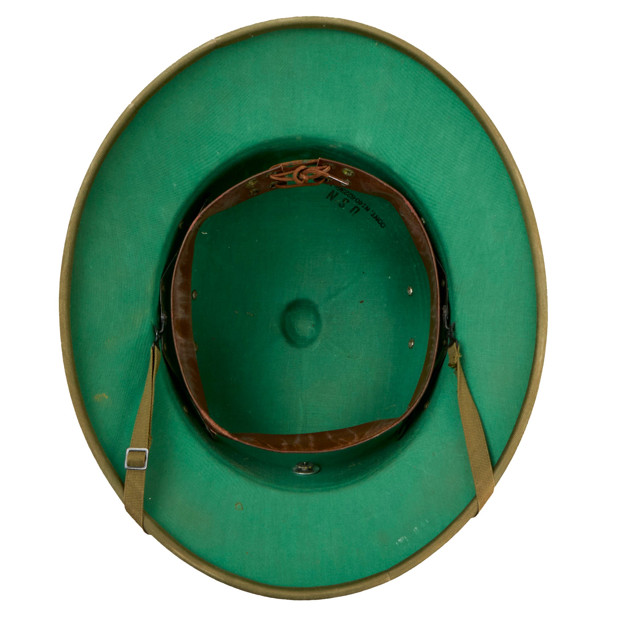 Original Item: Only One Available. This is a fantastic example of an unissued condition “American Fiber Helmet” with a USN (U.S. Navy) contract stamp on the interior. The fiber helmet was originally designed by Jesse Hawley in the early 1930s. Hawley subsequently designed the first fiber helmet liner for the original M1 steel helmet, alongside the General Fibre Company, a subsidiary of the International Hat Company. This example doesn’t have an explicit maker. The first patent for the Hawley pressed fiber sun helmet was petitioned to the U.S. government in 1935 and subsequently granted in 1938.