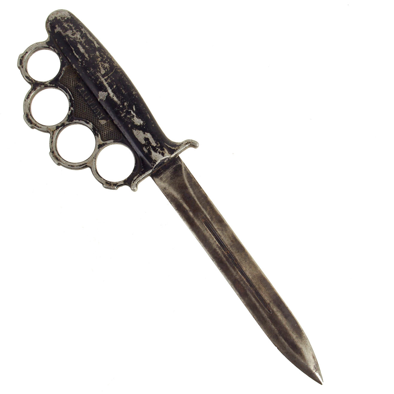 What is known is that these fighting knives were produced for use by US troops in the Pacific Theater of operations, and measure almost 12 inches in overall length. They feature a 5 inch long cast aluminum hilt, with four finger holes, which have small flat raised areas on the outside of each. The "palm" area of the grip is checkered, with a raised EVERITT marking. This is important to note, as most replicas of these have a stamped marking, and lack the proper texture. These knives came with either a black or green enamel paint on the handle. This example was painted blue over the original black paint, which was most likely done by a sailor. There is some chipping to the paint, but it is well retained. These are often found nearly devoid of paint.