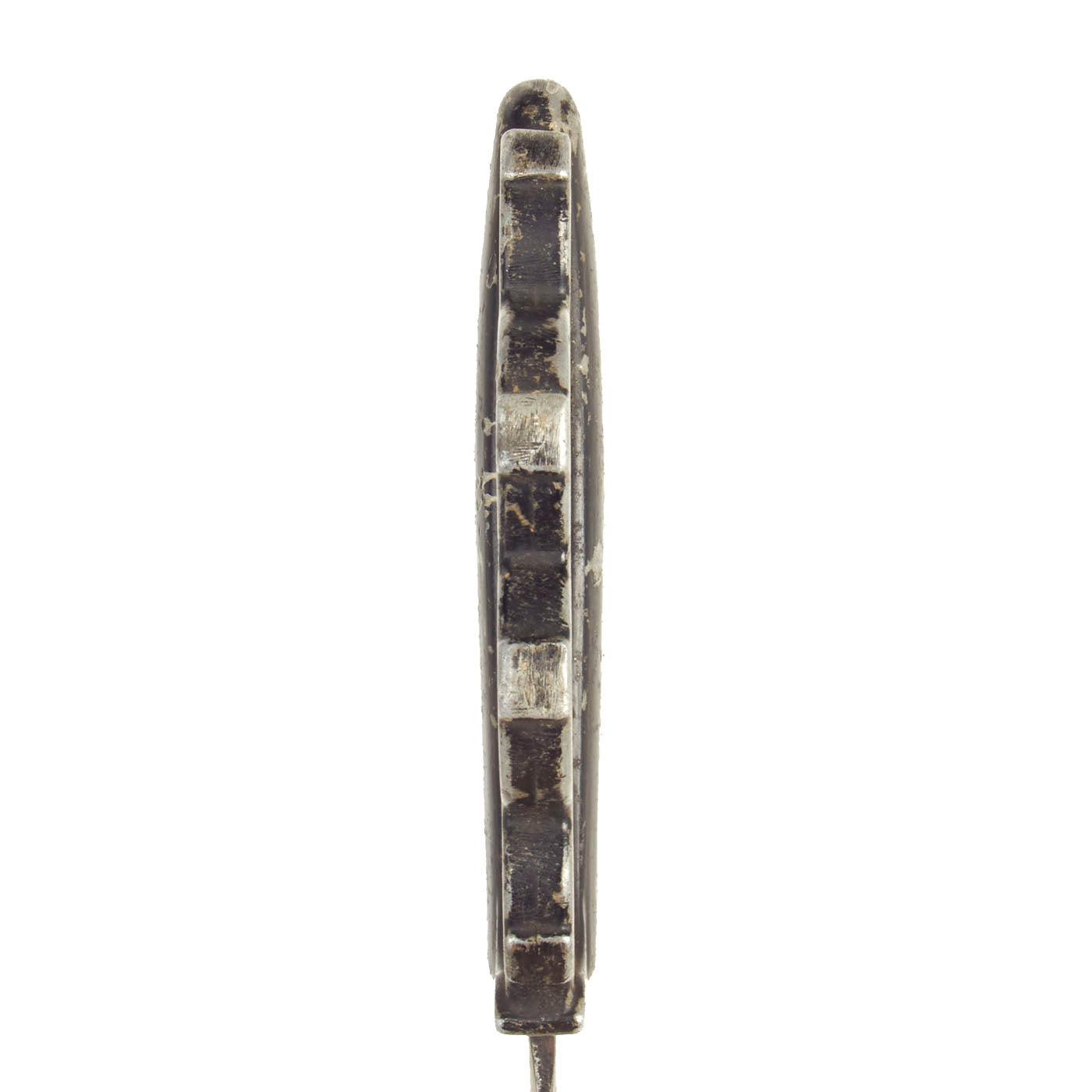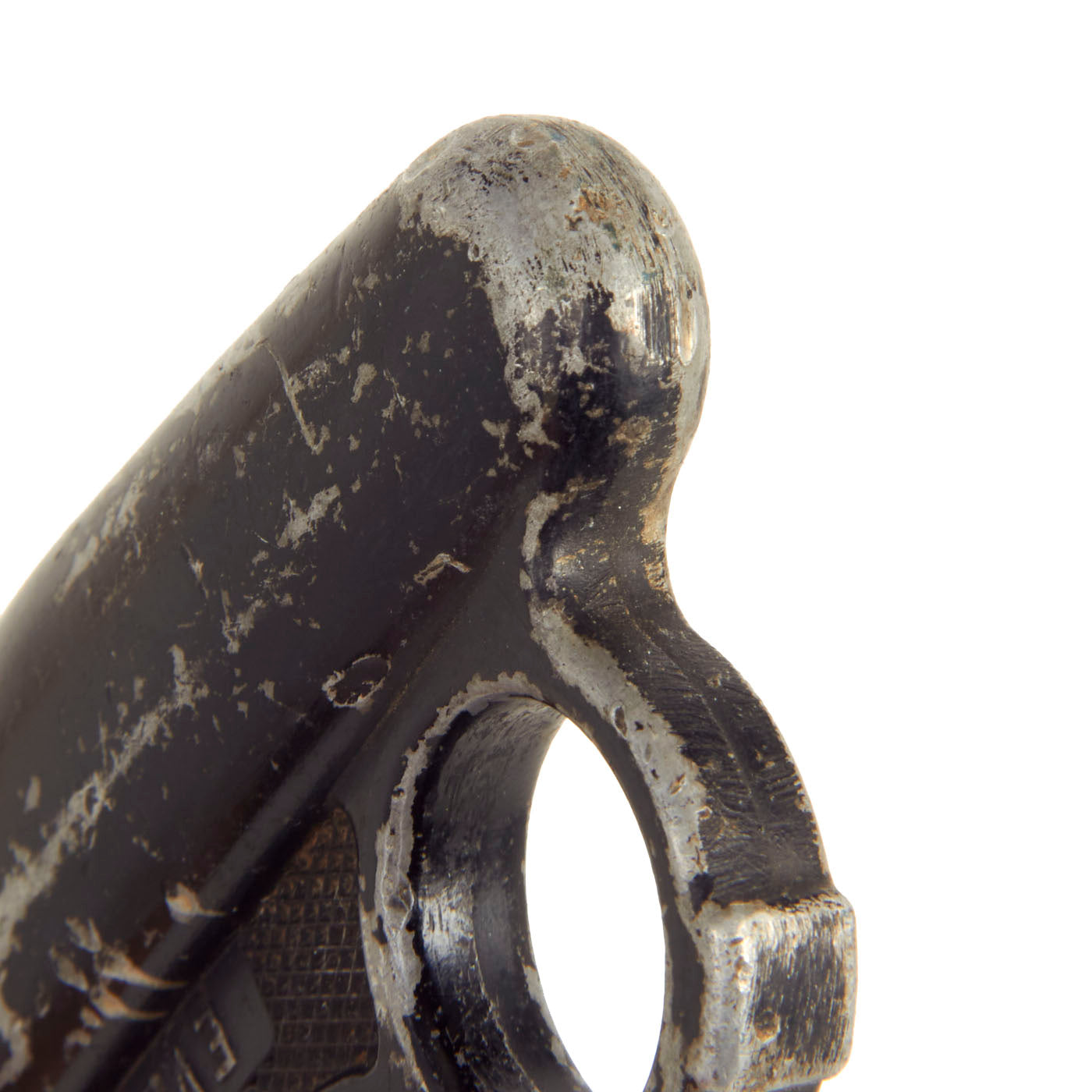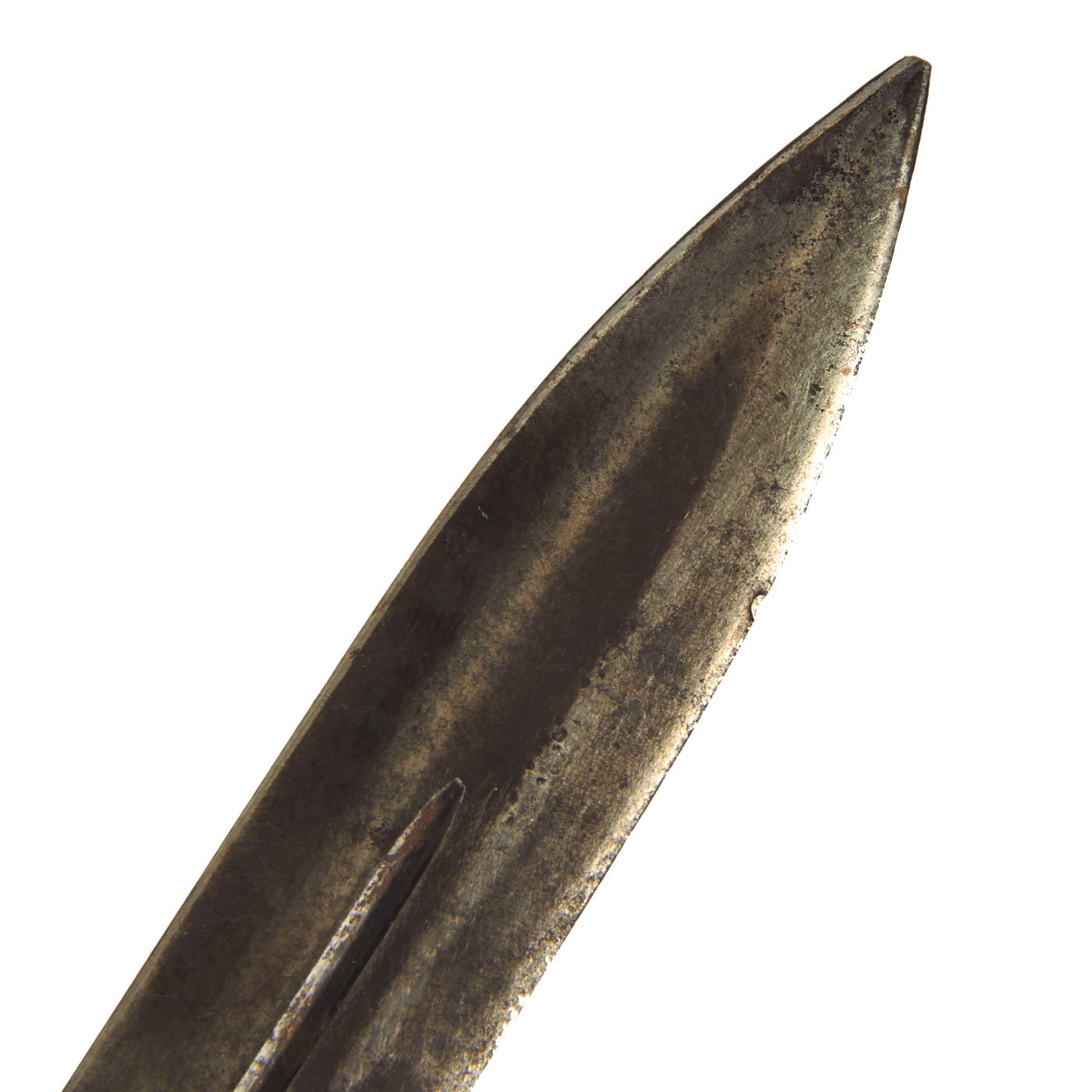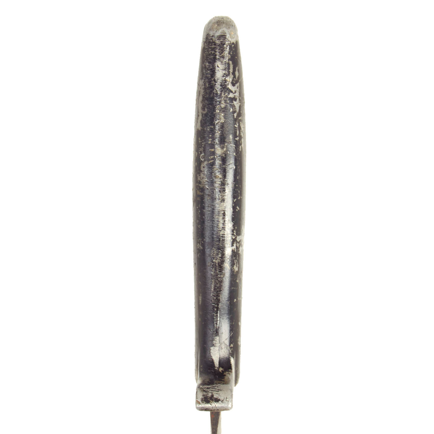 The blade is a simple double-edged spear-point design, which measures about 7 inches long with thin central fullers. The knife is clearly intended for stabbing and only offered limited utility for the other duties that a combat knife might be called upon to deliver. The blades were usually painted with black enamel, however this example is blued, and this looks to be the original finish. The blade does have some small areas of oxidation and spots of former rust on one side, with some more advanced oxidation on the other. This has resulted in the blued finish degrading on that side from attempts to remove the rust. The blade itself shows signs of honest period use.