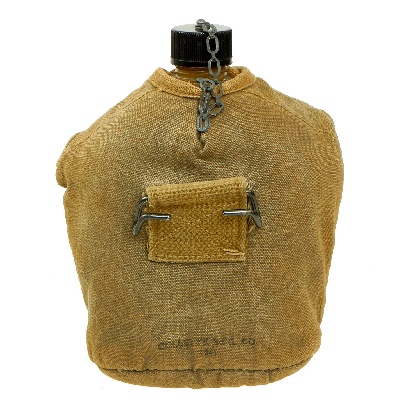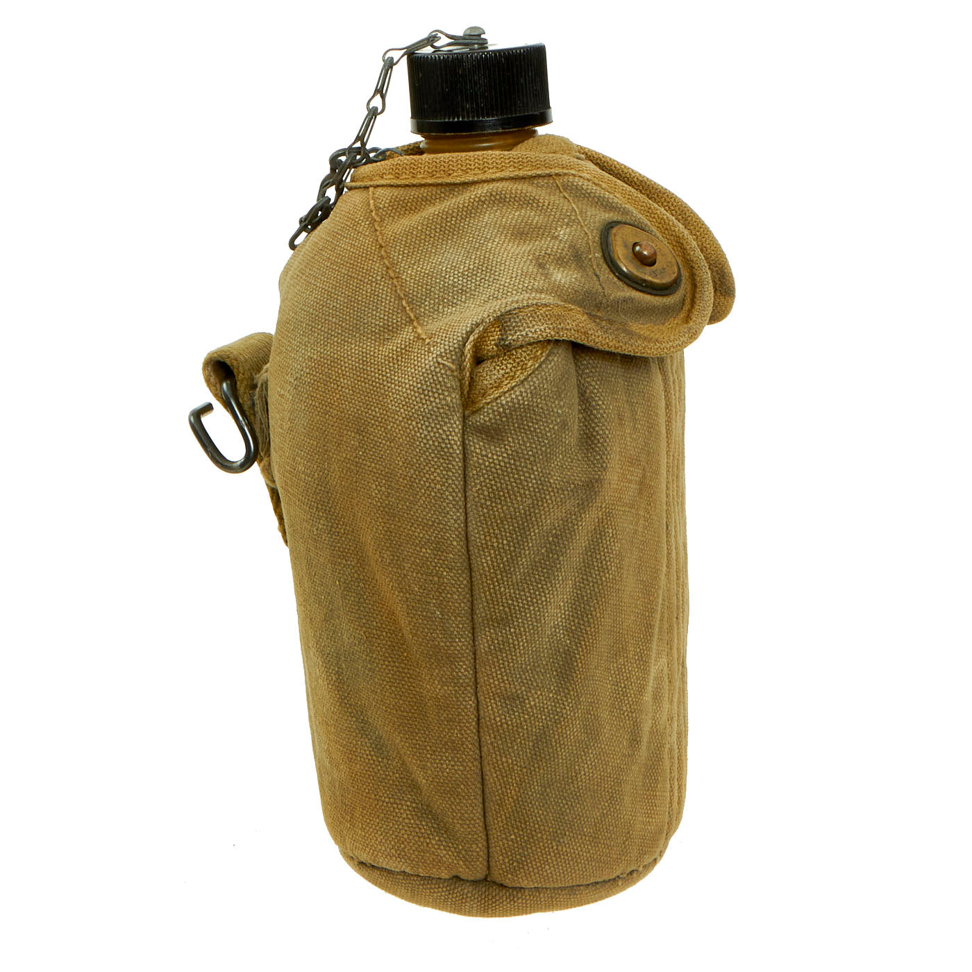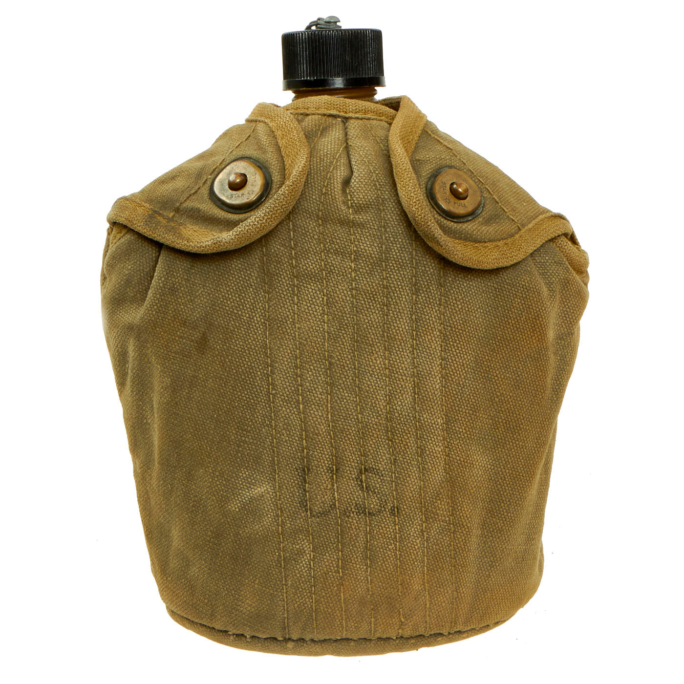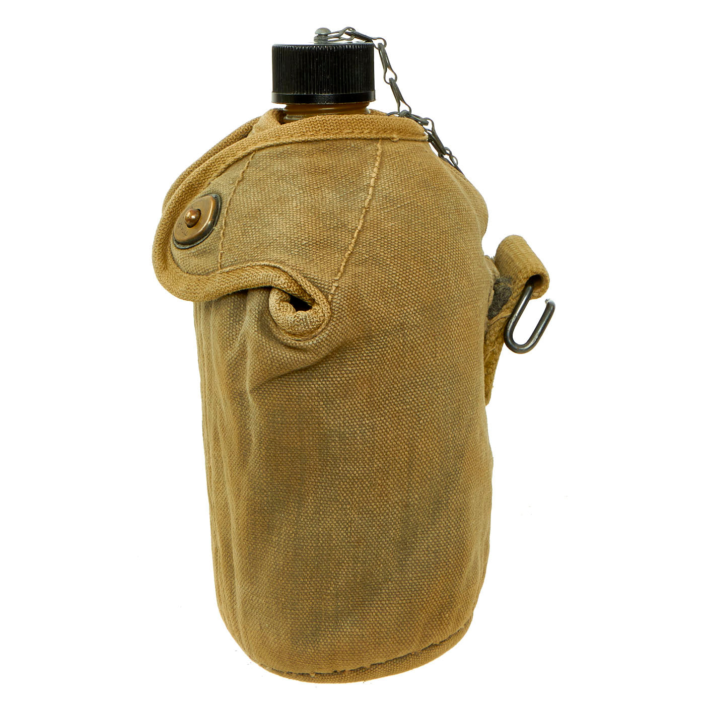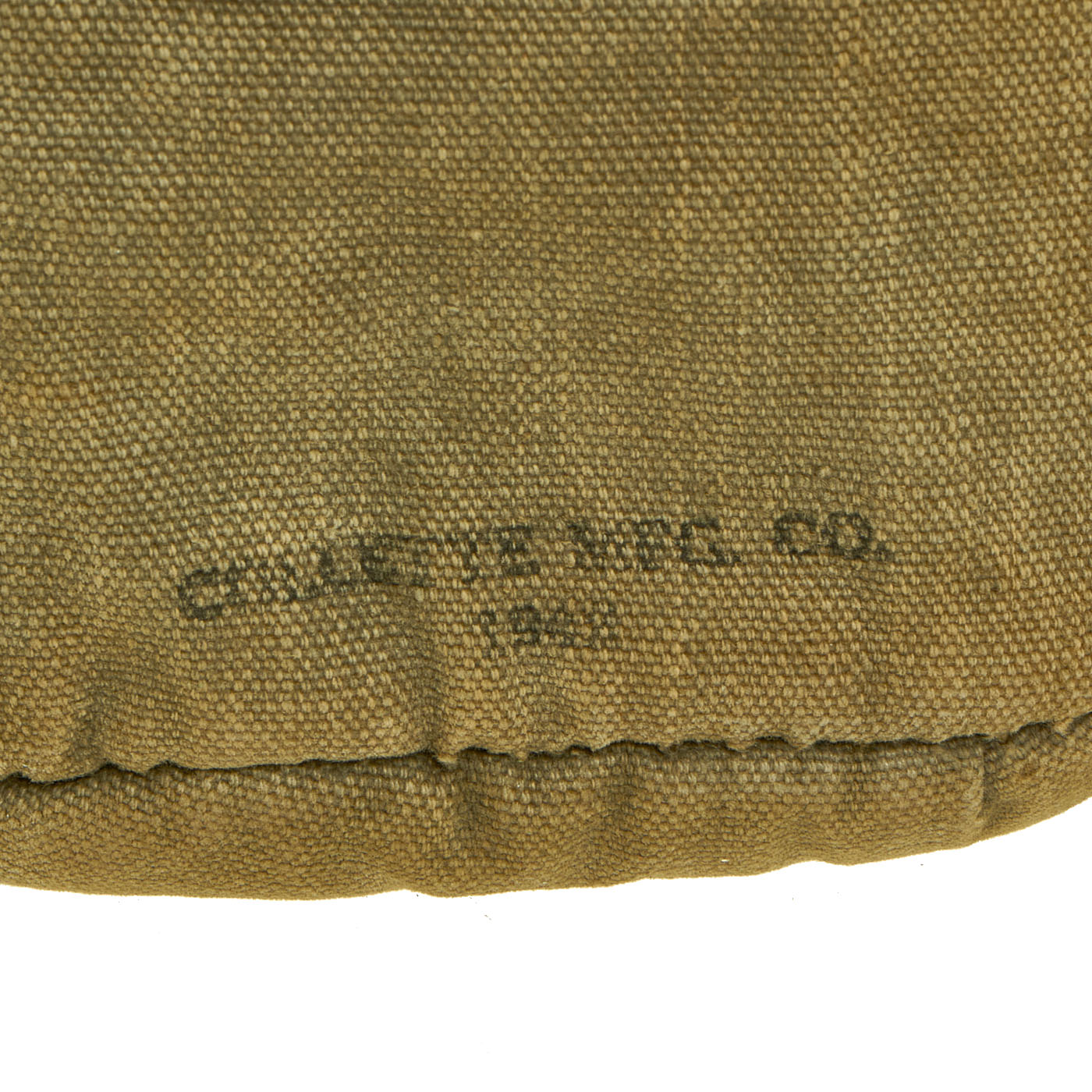 Original Item: Only One Available. This is an excellent rare example of an experimental Ethylcellulose (Ethocel) Canteen, complete with an original WWII dated infantry carrier. The canteen itself is marked on the bottom with U.S. / 1943 and a small maker logo that reads P.I. The included carrier is fully functional, and faintly marked with an illegible maker and barely legible 1942 date. These canteens are very rare, and this is only the fourth example we have had.