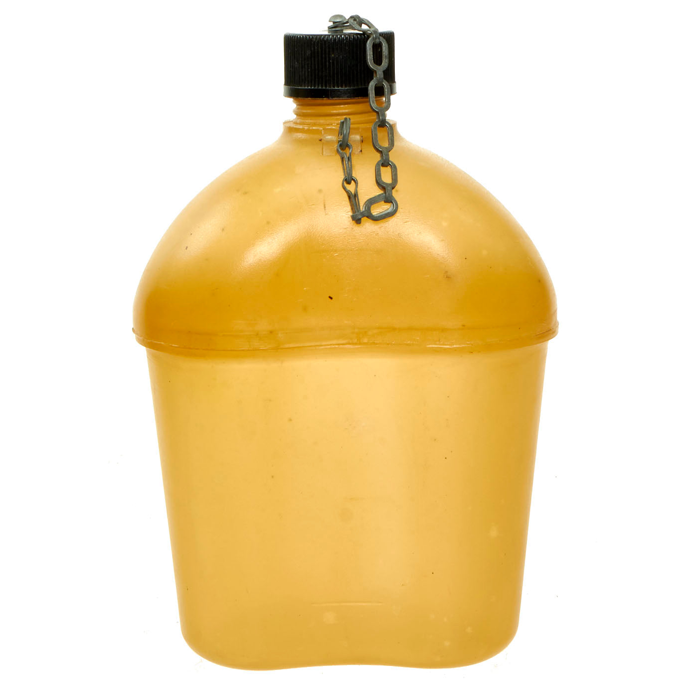 This canteen comes complete with the chain attached to the cap, and amazingly no stress cracks. The cork washer inside the cap is present. Overall condition of the canteen is very good, and from the looks of it, there are remnants of the baking powder that soldiers would put inside the canteen to combat the taste the plastic imparted.