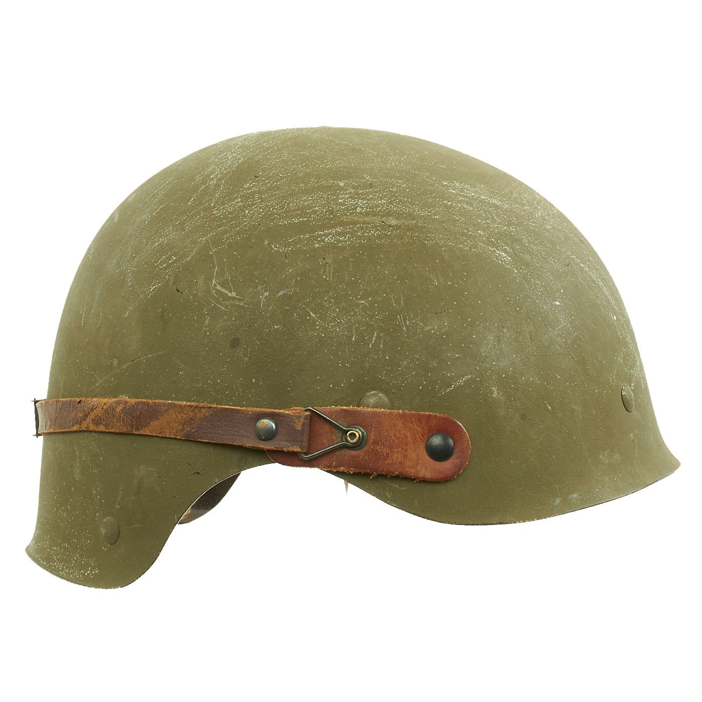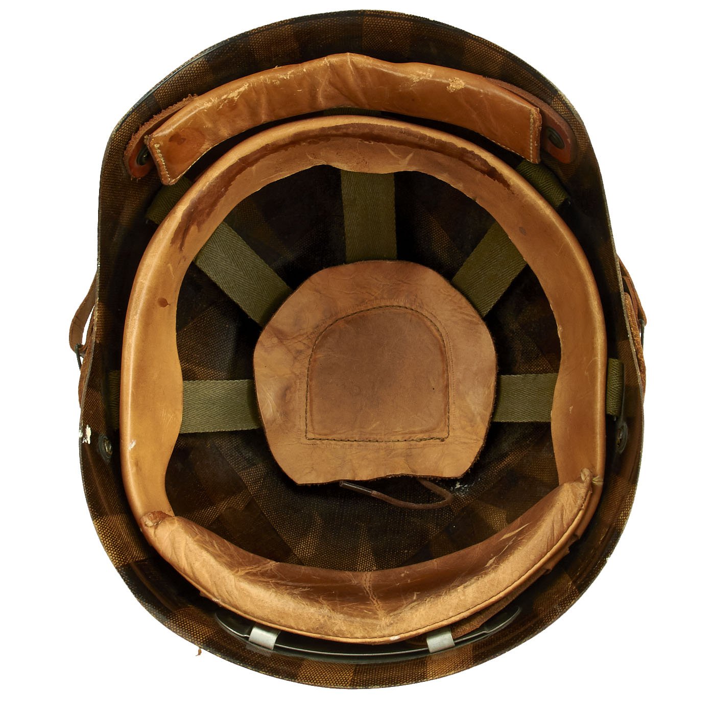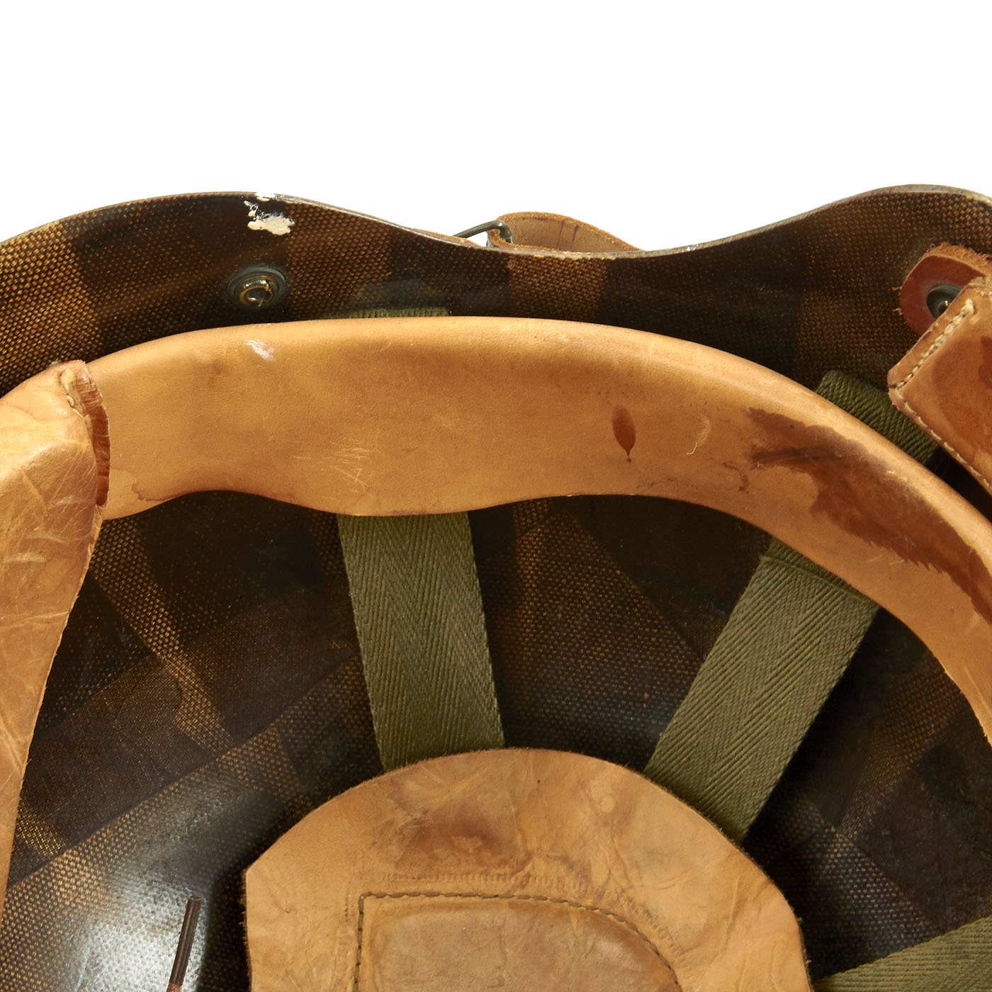 This example is in very good condition, and has the original leather chin strap mounts, as well as the M1 Helmet style liner chin strap. The interior is fully intact and shows light wear. The adjustment system is somewhat unique, using sliders that go over a metal fitting with a tab that locks into the leather of the liner.