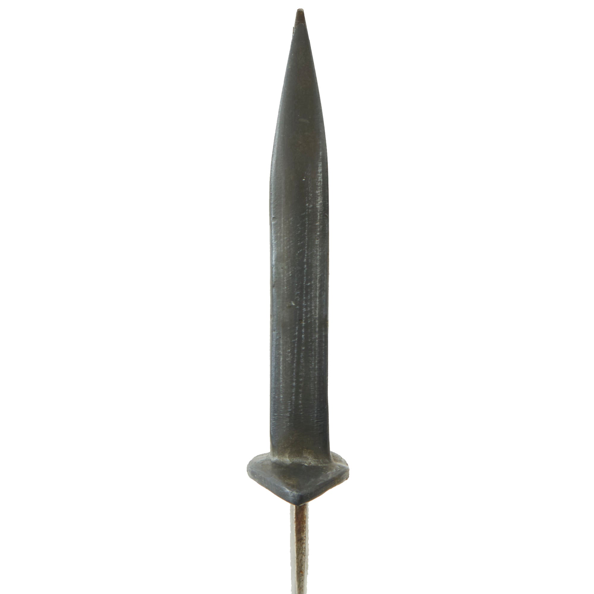 “The "Stelzig" knife is a fierce, sturdy knuckle knife with handles cast from aluminum and/or steel. They were equipped with different types of blades varying from diamond shape to double edged. There is no maker's mark on the knife itself, however, most will be found with a finely made leather sheath that is stamped "STELZIG SADDLERY CO, HOUSTON, TEXAS".