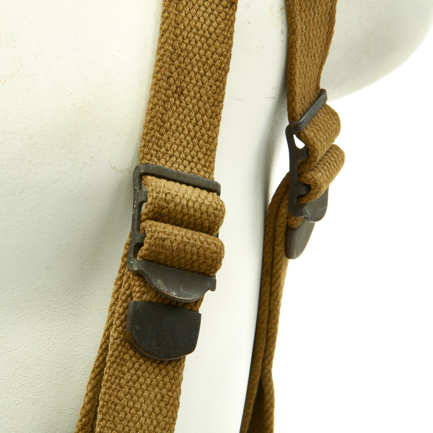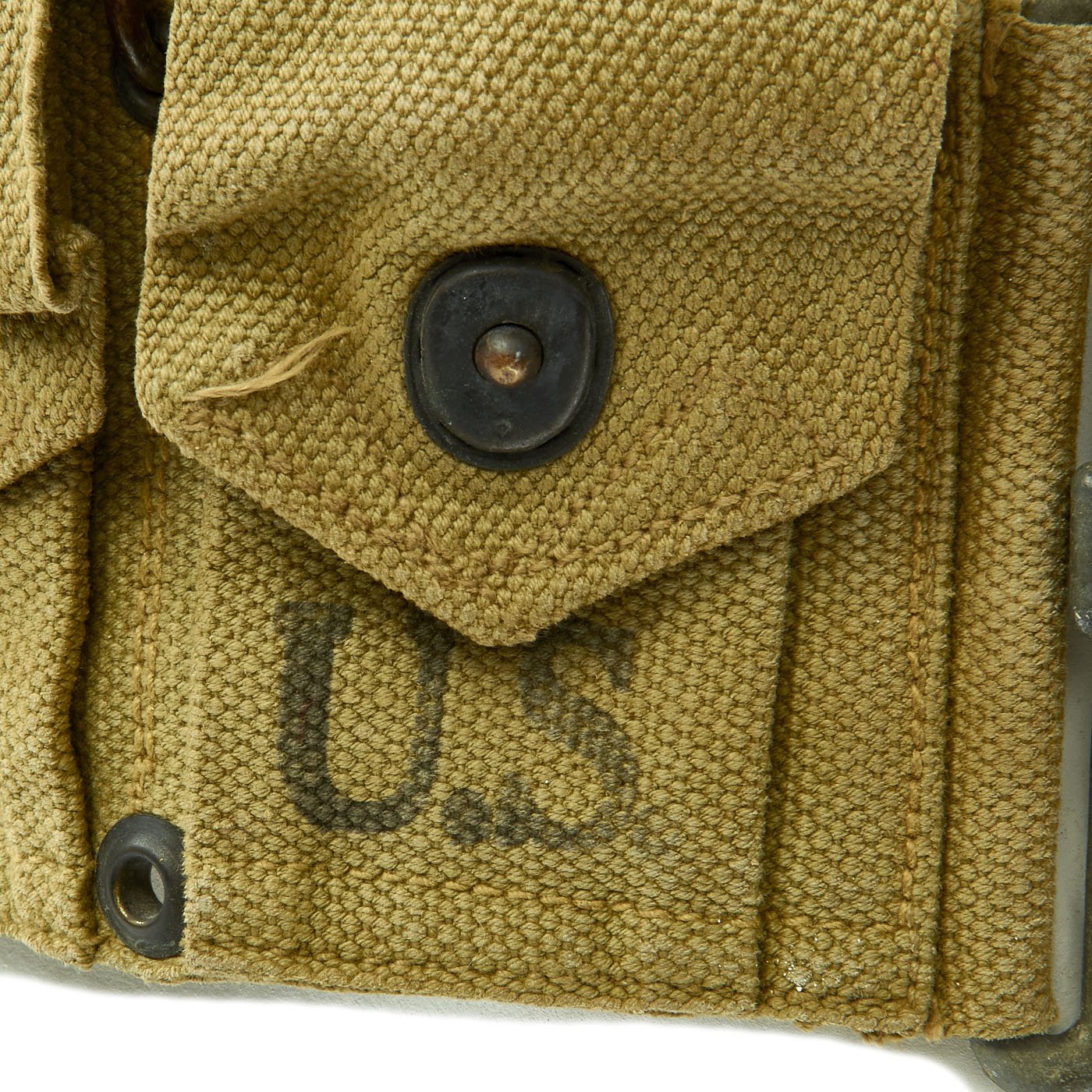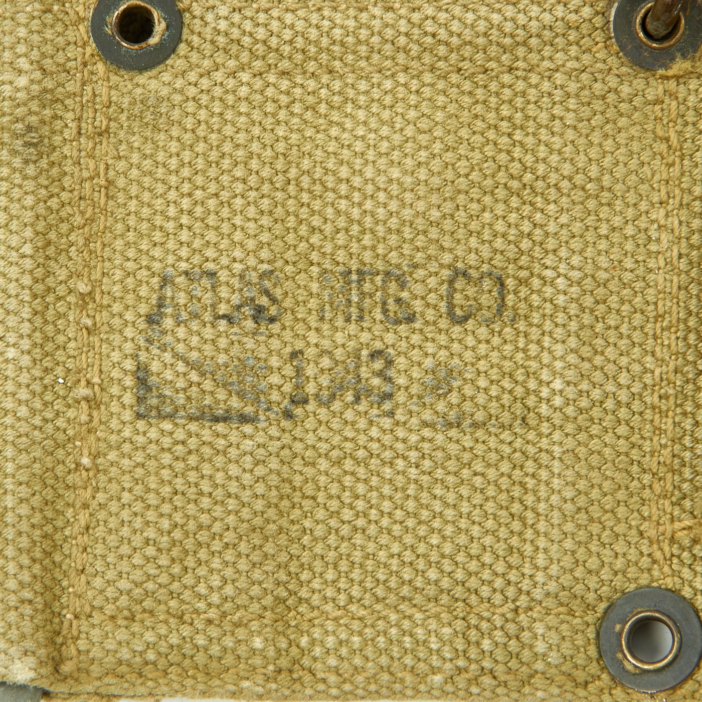 Tying this set together is a very nice 1943 dated original US Army issue OD Green canvas 10-Pocket ammunition belt for use with both Springfield and Garand Rifles. Officially designated the "Belt, Cartridge, Cal .30, Dismounted, M-1923", it was originally adopted when stocks of the M-1910 belt were exhausted after World War I. The belt was designed as part of the infantryman's load carrying system, anchoring the M-1910 haversack and later the M-1928 infantry pack. It has ten pockets for clips of .30-caliber ammunition for the M1903 Springfield, M-1917 Enfield, and later M1 Garand rifle. The M1903 and M1917 rifles using 5 round stripper clips (two per pocket, total of 100 rounds) while the M1 Garand used a single eight shot clip per pocket (total 80 rounds).