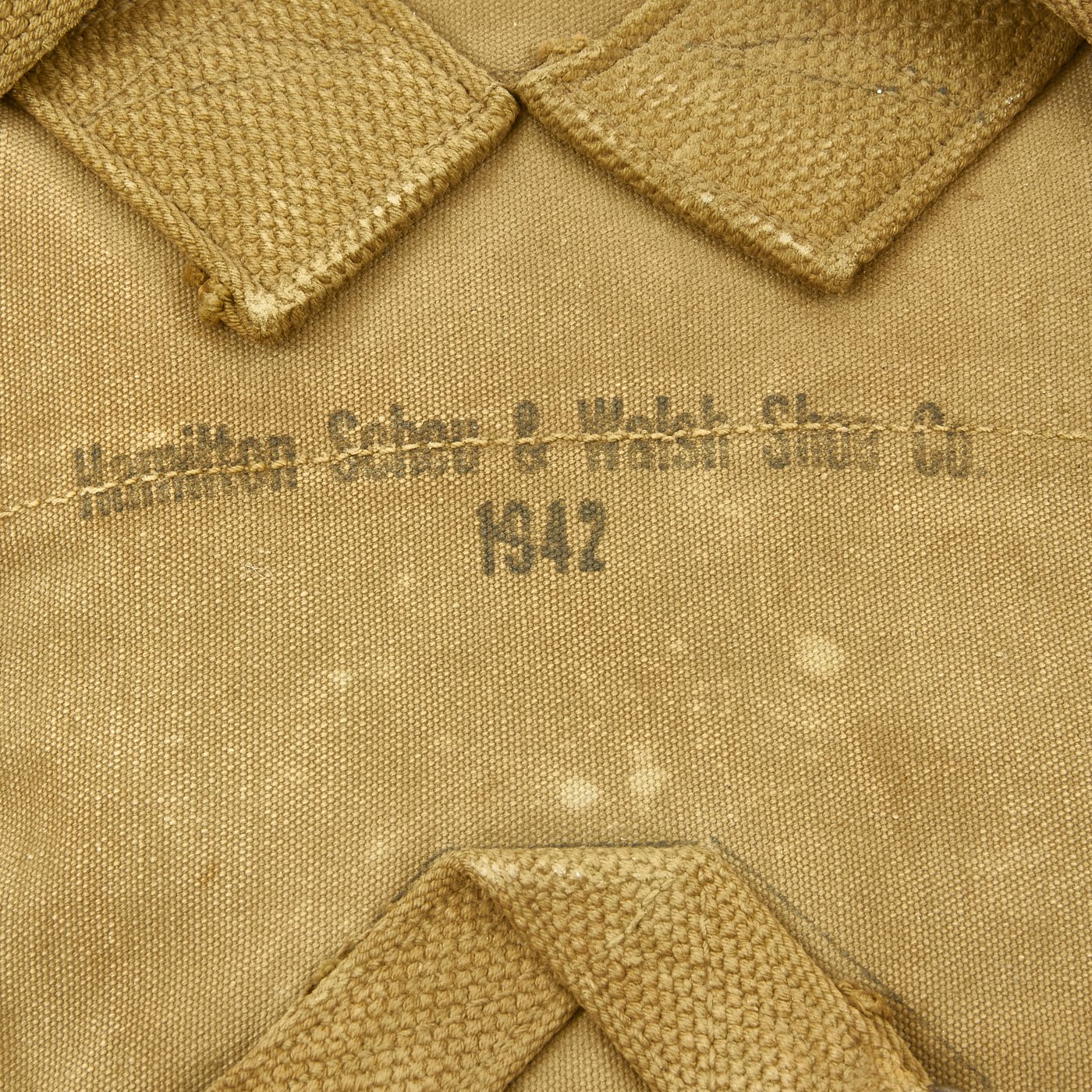 - Original U.S. WWII Issue M1928 Haversack, manufactured by the Hamilton Scheu & Walsh Shoe Co. in 1942. This design was much like the M1910 version that preceded it, however it has two bottom straps for securing to a pistol or ammunition belt. This example is in good service worn condition, and attached to the top flap is a very detachable pouch for the U.S. "Meat Can" style mess tin (not included)