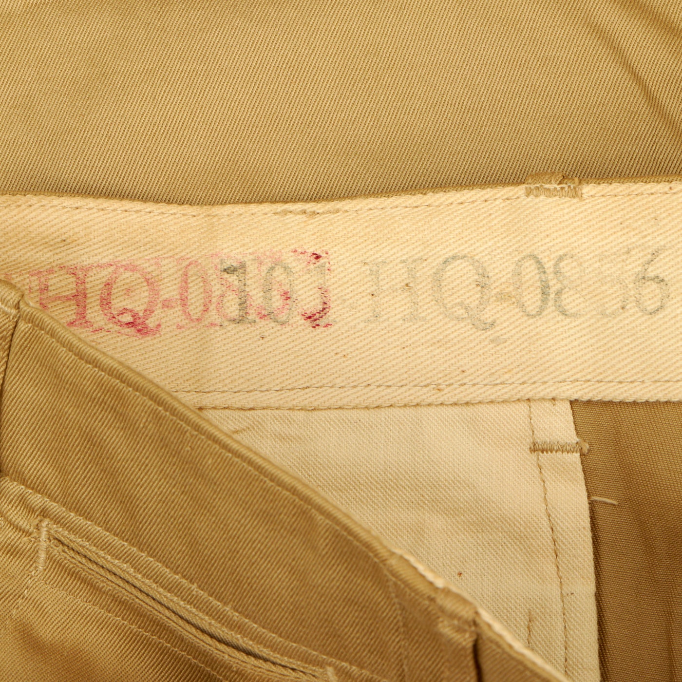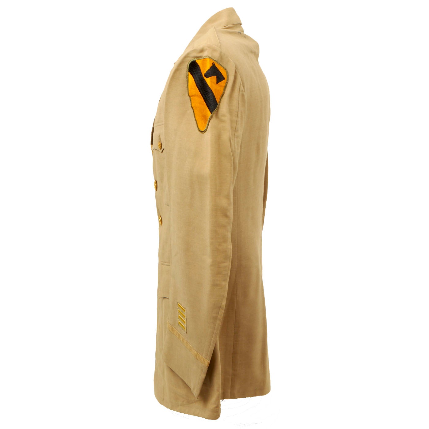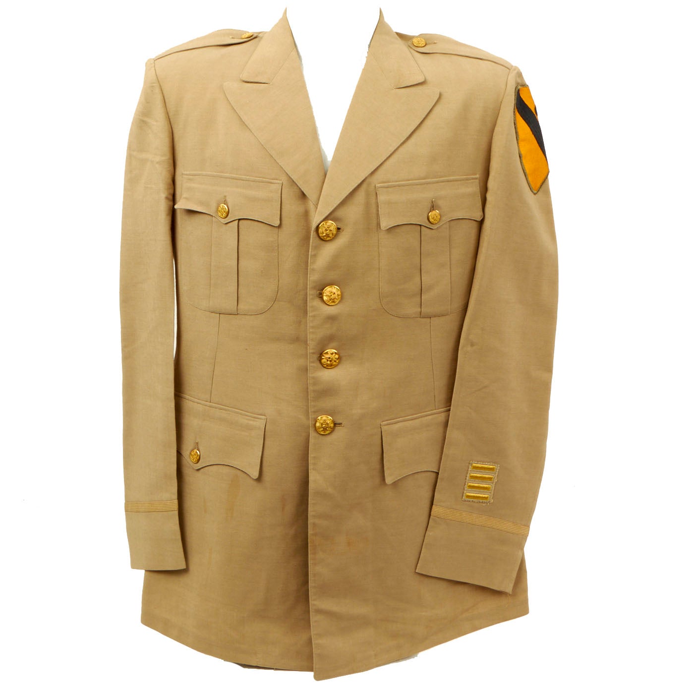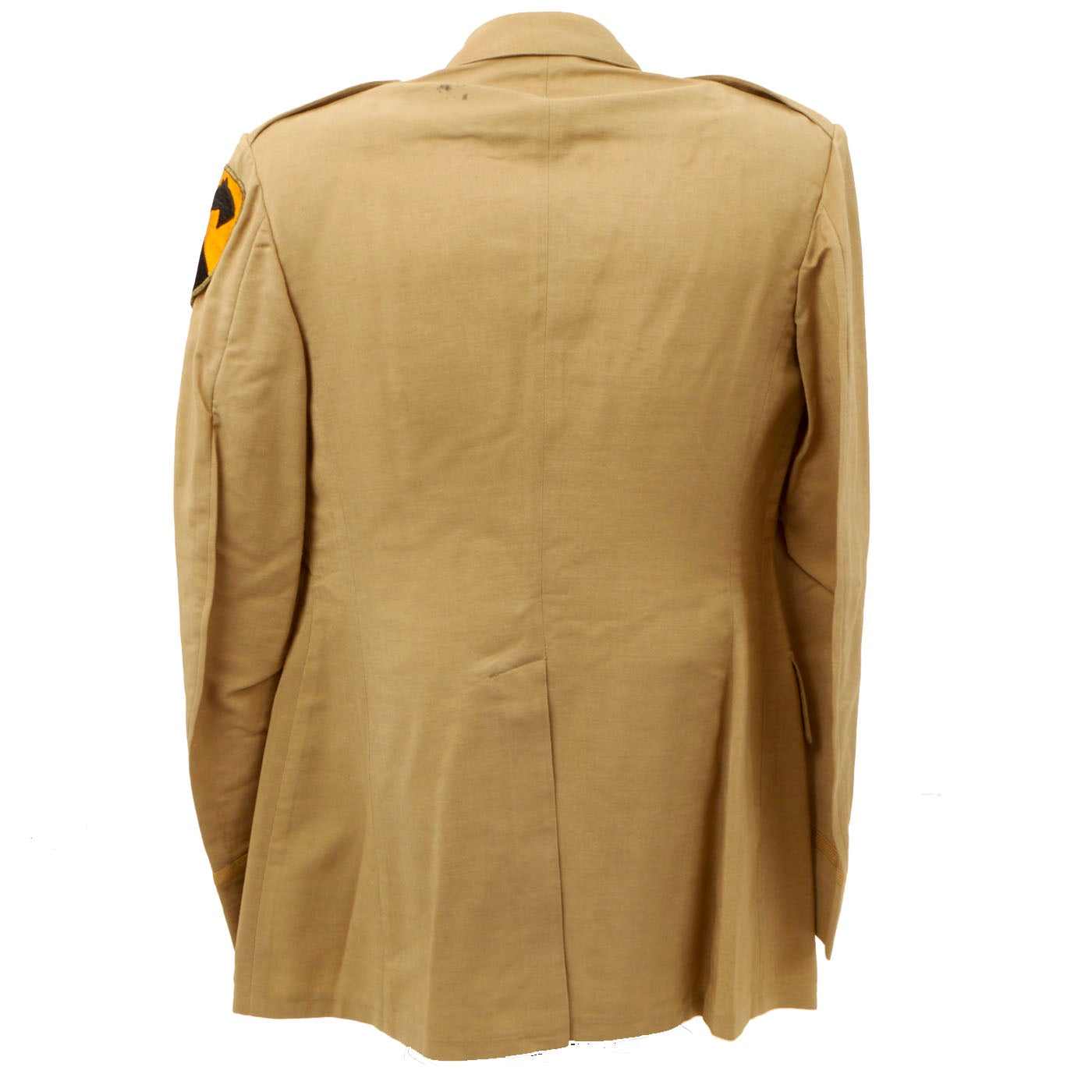 -Khaki Summer Coat: This is the coat that features the incomplete name and service number and is located on the back collar silk lining. The coat features a vibrant hand stitched 1st Cavalry Division patch on the left shoulder. Unfortunately the stitching is coming undone in spots around the patch. On the left sleeve towards the cuff there are service stripes denoting 2 years of service overseas. There is no significant damage to the coat except where the ink bled through and is shown on the backside.