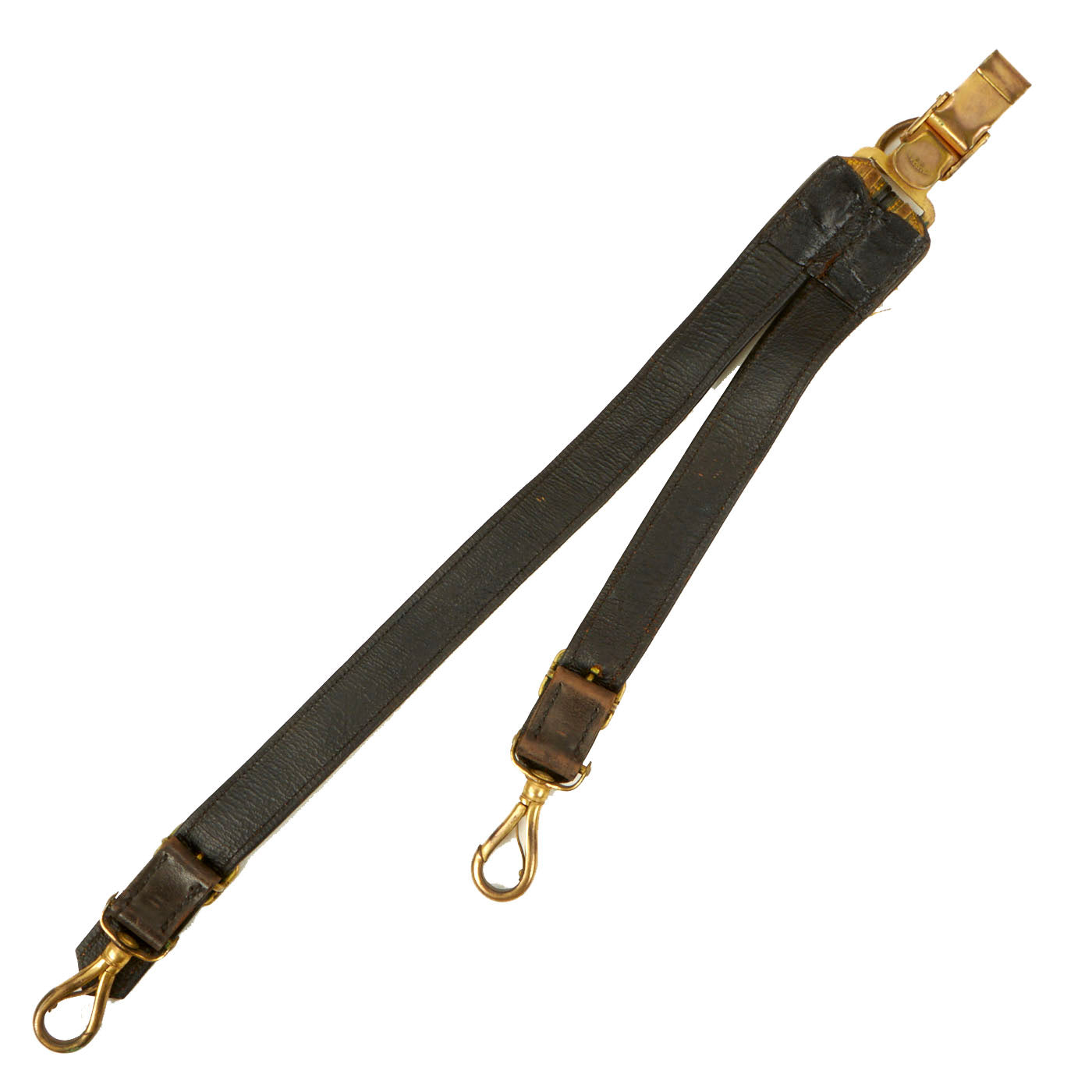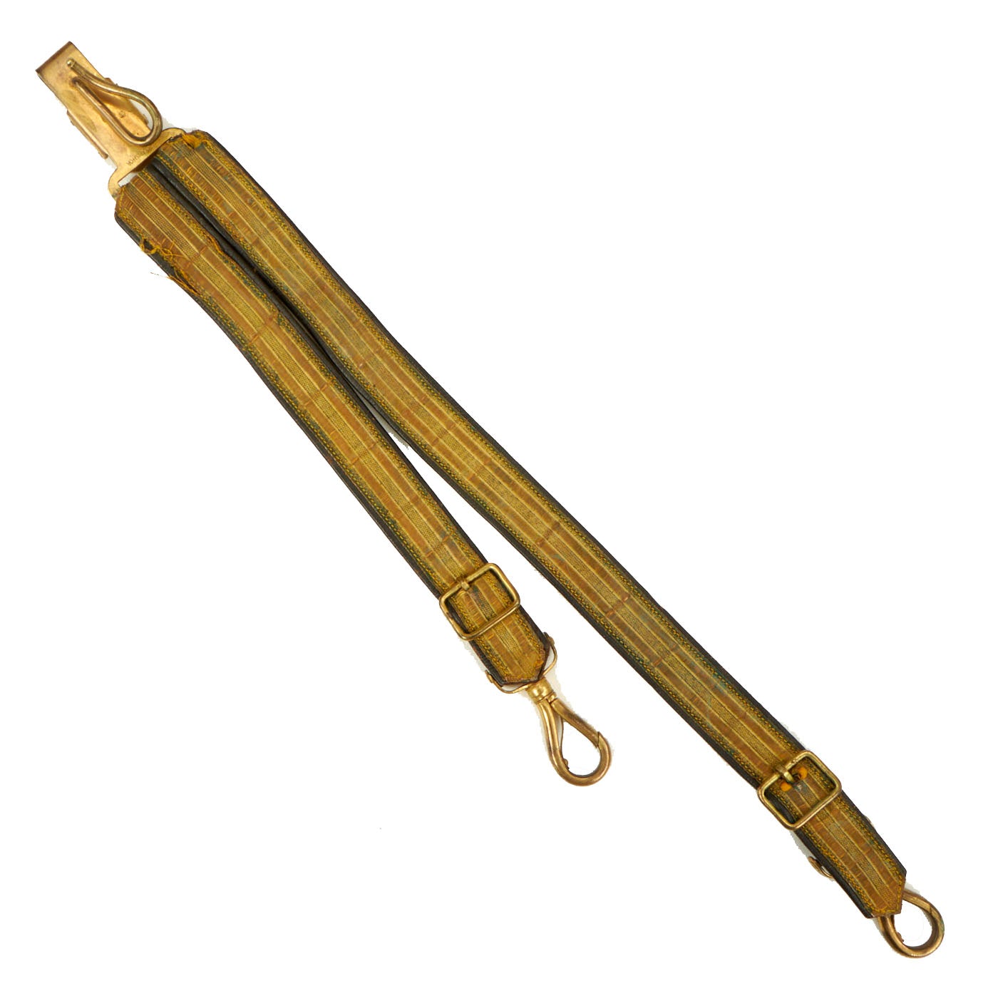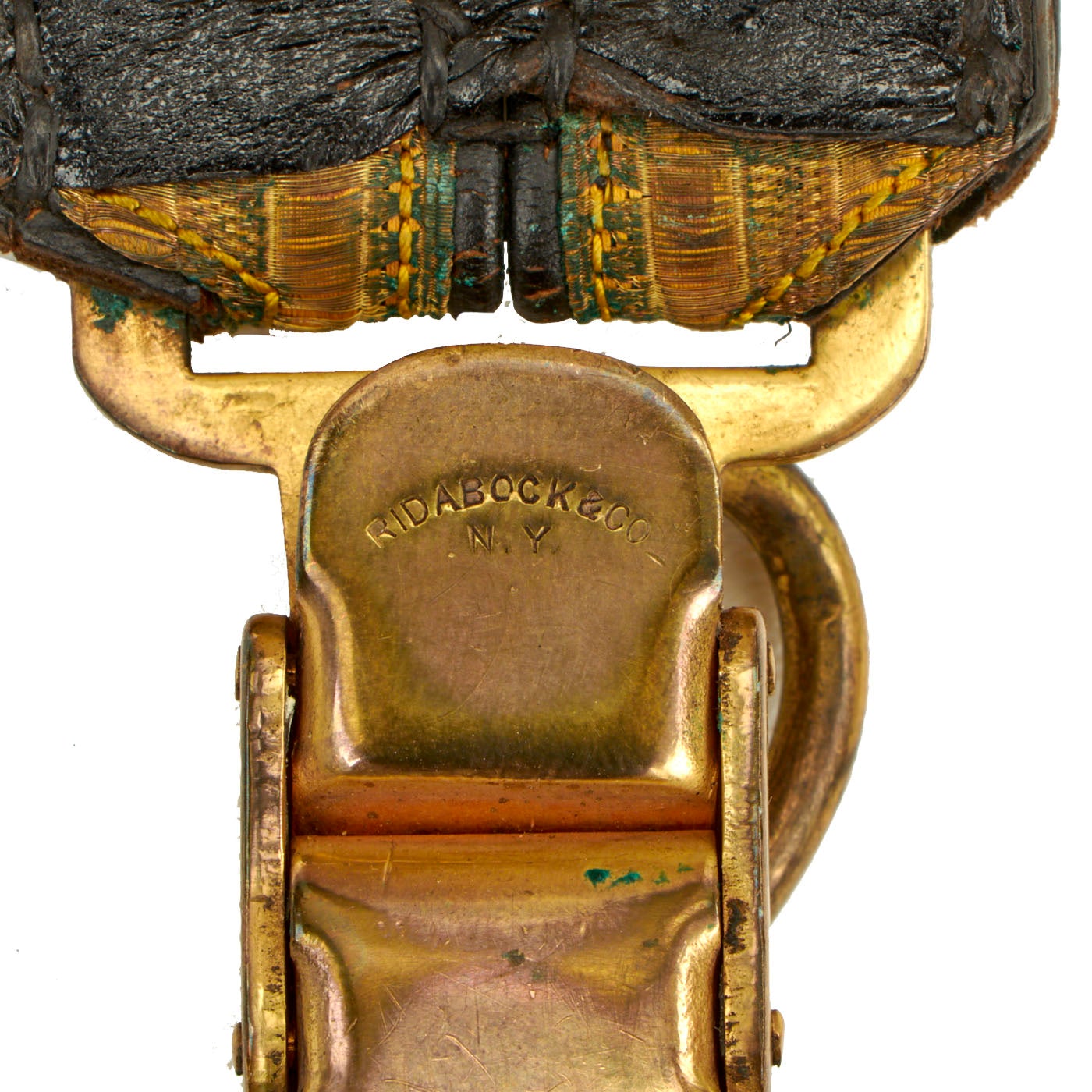 - Cavalry Saber/Sword Hanger: This hanger appears to have been used for presentation use and not field use. It is gold in color with brown leather and brass buckles and clips. The manufacturer stamp is still visible on the hanger and it is Ridabock & Co from New York. The condition is good but does show signs of wear and use.