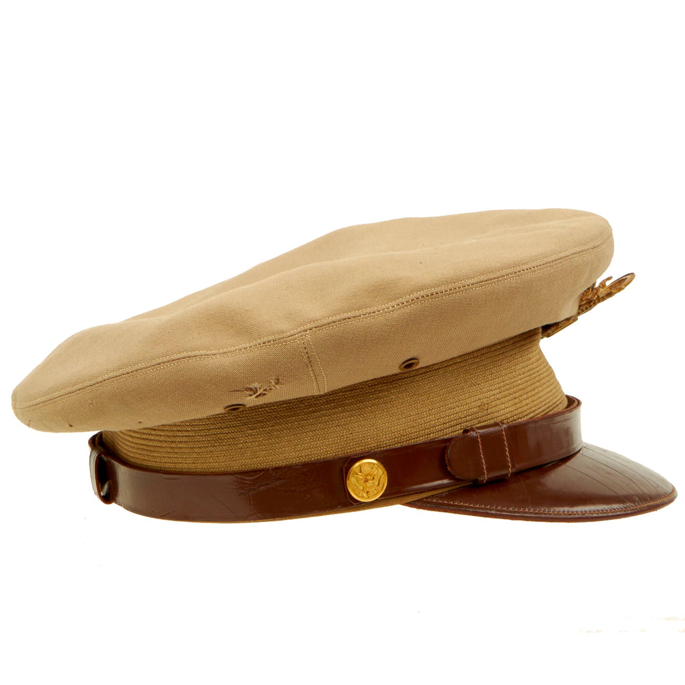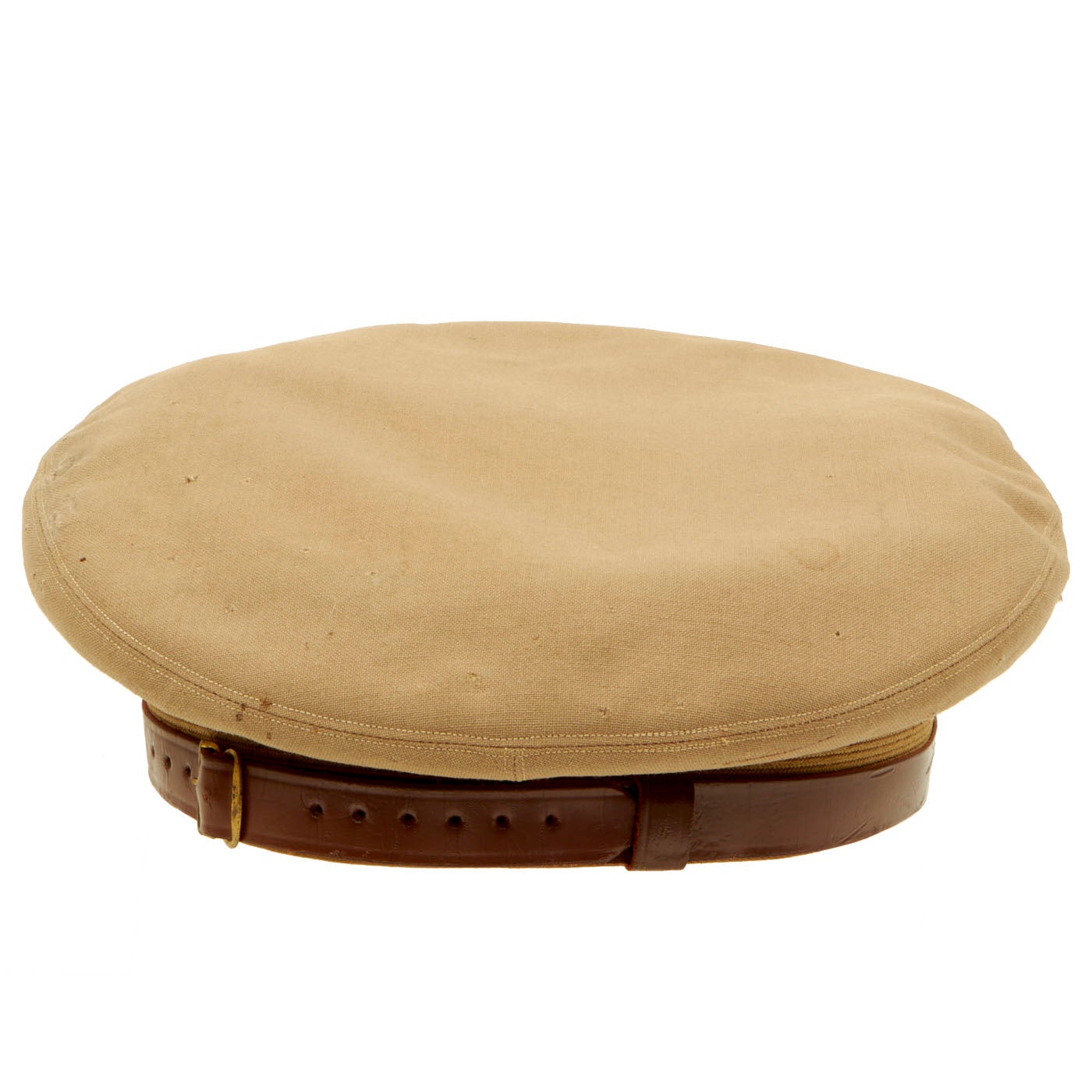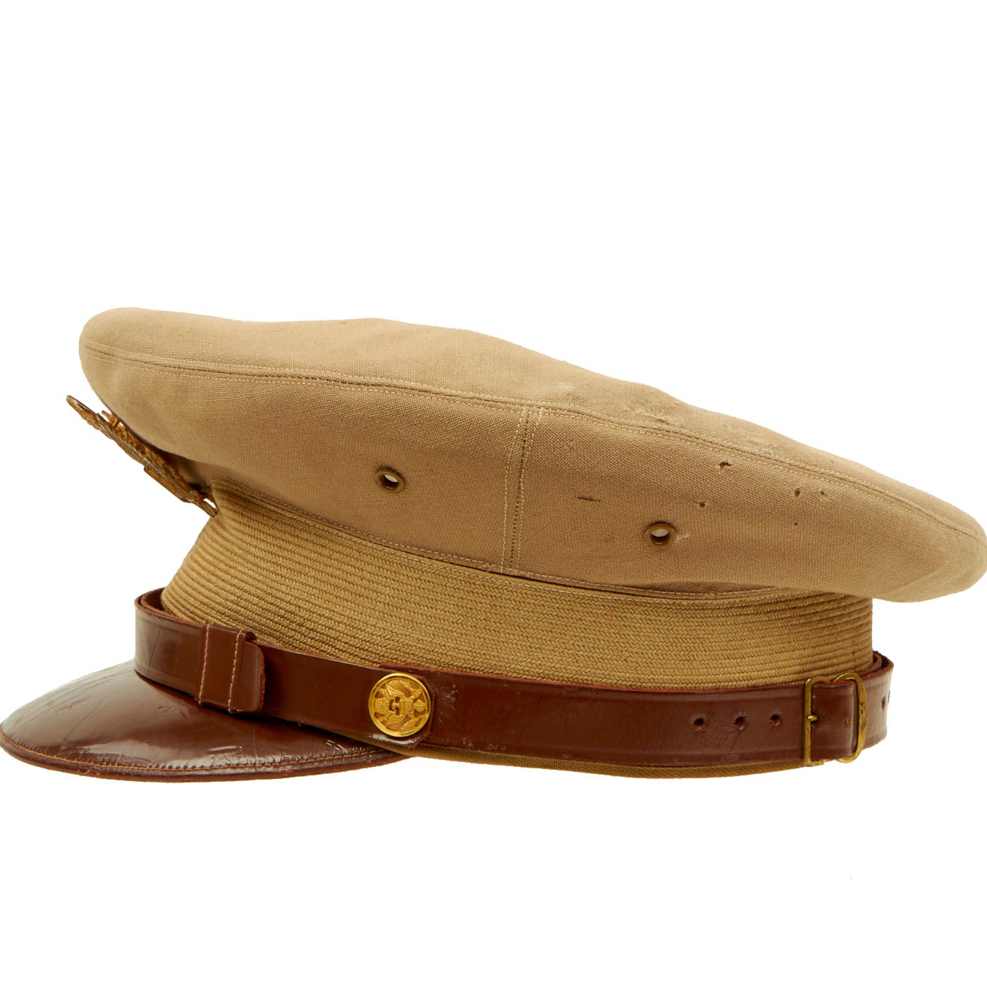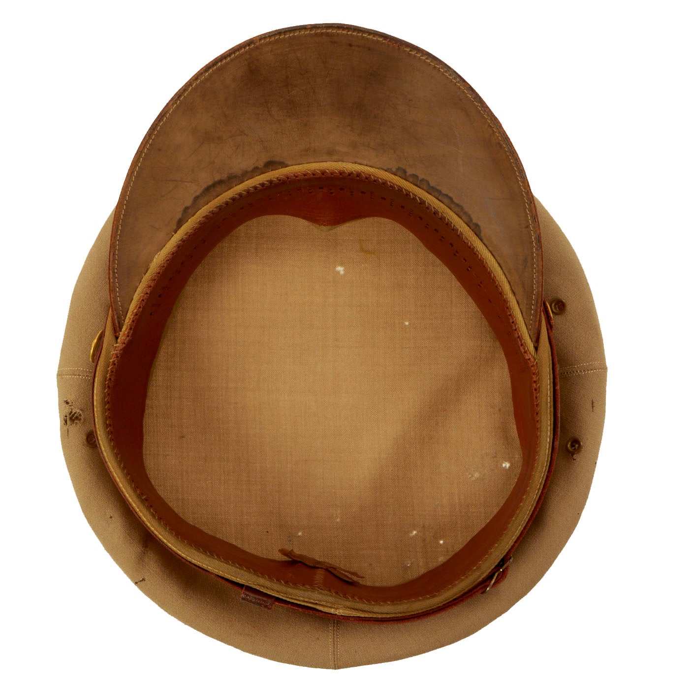 - One Khaki Peaked Visor: The visor features a large “officer’s eagle” on the front which unfortunately has the two pins broken on the back, leaving only the screw back securing it to the cover. There are minor moth marks and light staining to the fabric. The visor is complete and even has the back adjustment buckle and strap which you rarely see present on these visors still. There is minor cracking to the brim. There are no tags on the inside but the leather sweatband still has a stamp: Hygieatan/ A Certified Leather/ Antiseptically Made. The visor is approximately a size 7 ⅛.