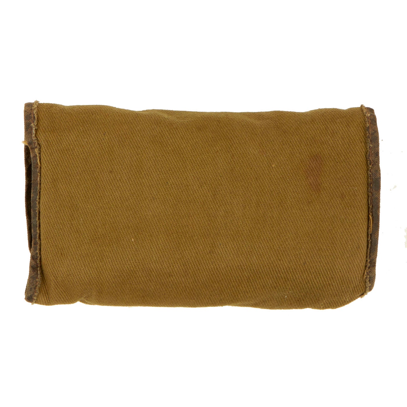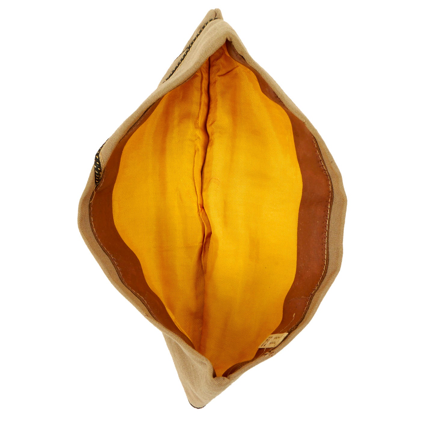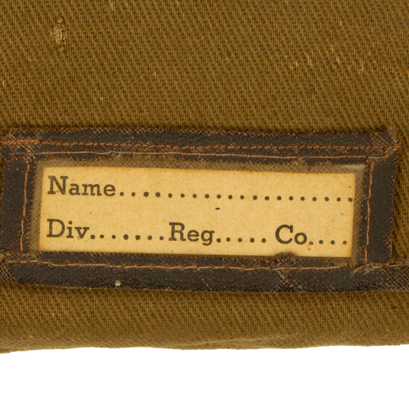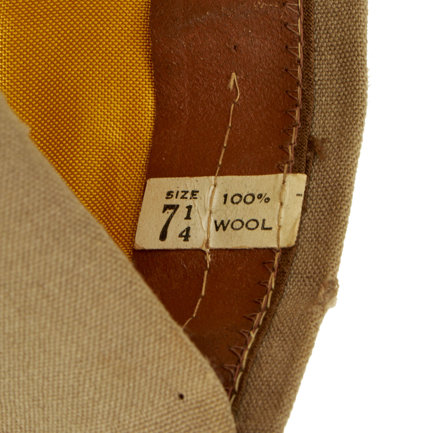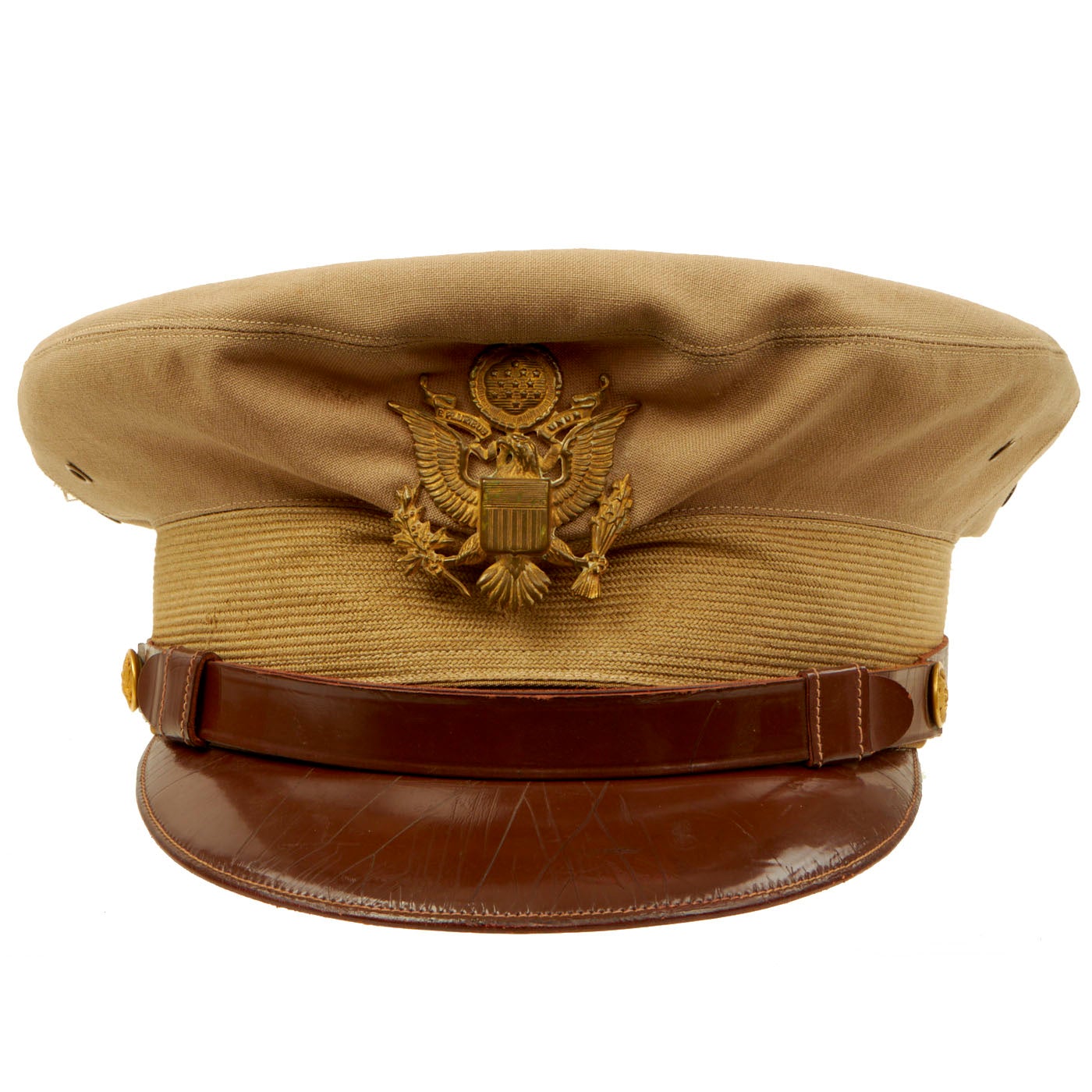 - One Khaki Peaked Visor: The visor features a large “officer’s eagle” on the front which unfortunately has the two pins broken on the back, leaving only the screw back securing it to the cover. There are minor moth marks and light staining to the fabric. The visor is complete and even has the back adjustment buckle and strap which you rarely see present on these visors still. There is minor cracking to the brim. There are no tags on the inside but the leather sweatband still has a stamp: Hygieatan/ A Certified Leather/ Antiseptically Made. The visor is approximately a size 7 ⅛.