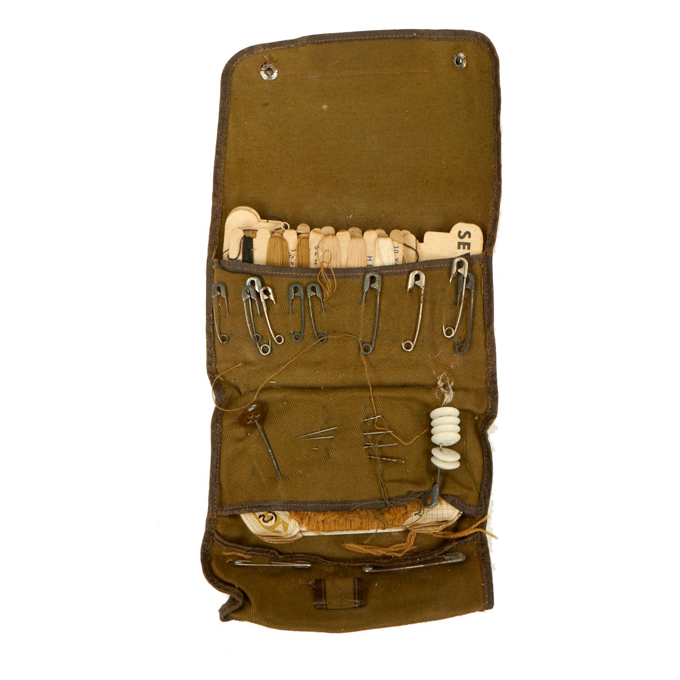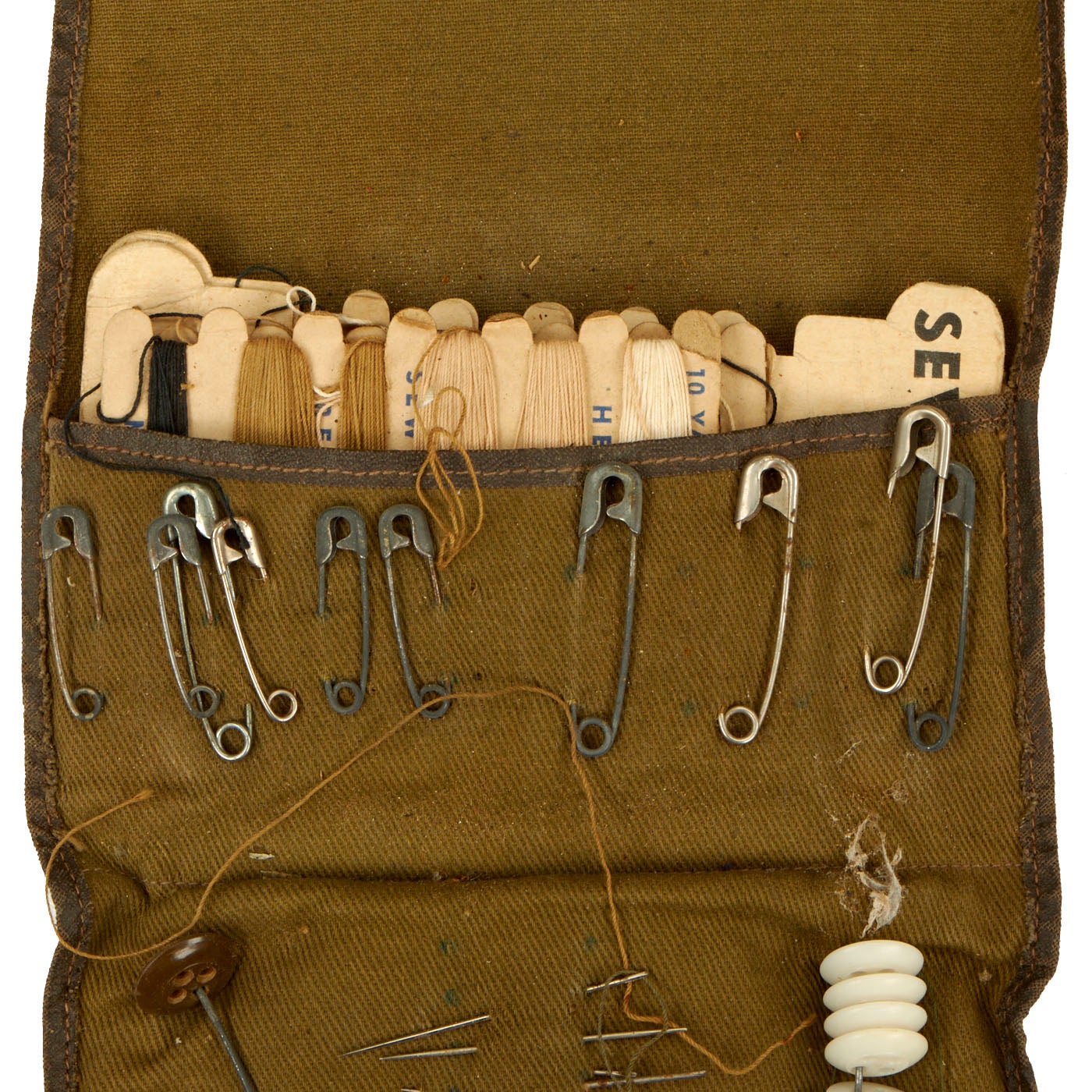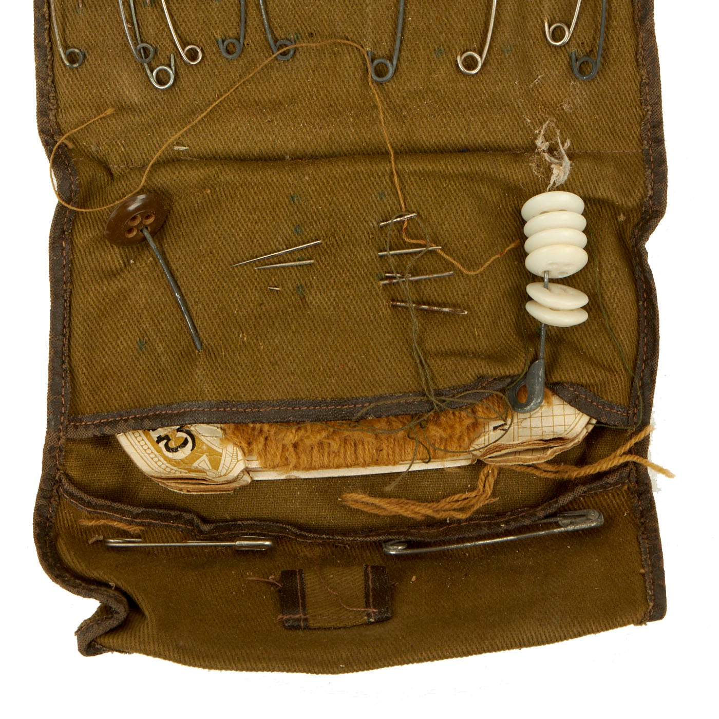 - Personal Sewing Kit: The kit appears to be a private purchase item and was manufactured by EMCO, Edwin-Magnus Co from Jamestown, New York. The kit appears to have been used extensively and there are pieces missing. The condition is good and doesn’t show any signs of being damaged.