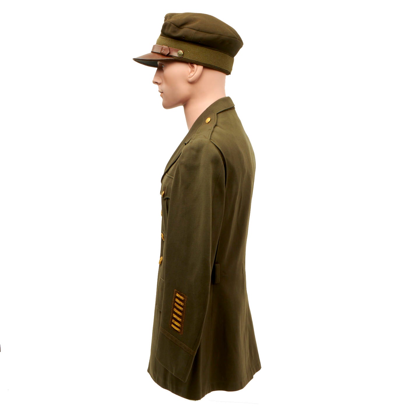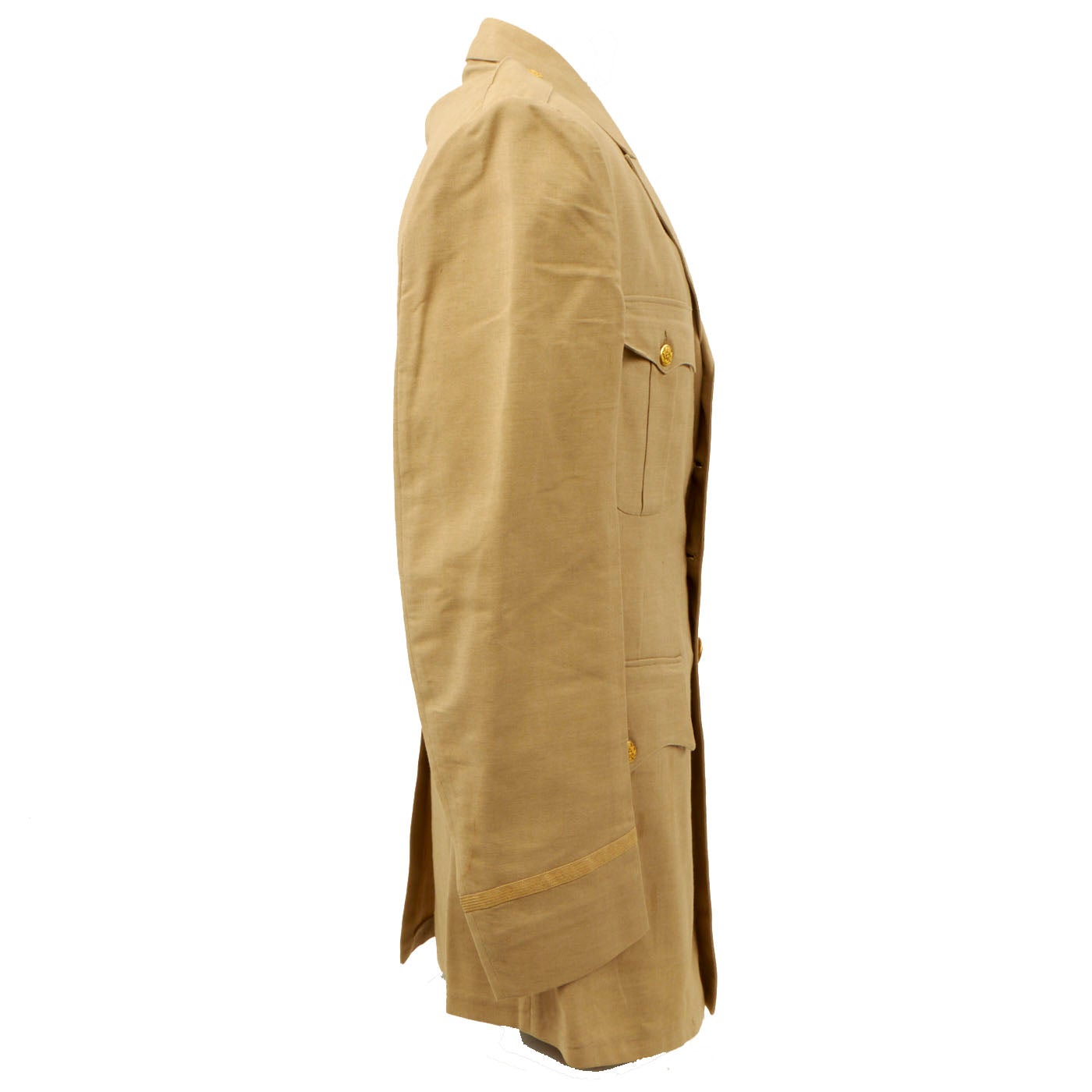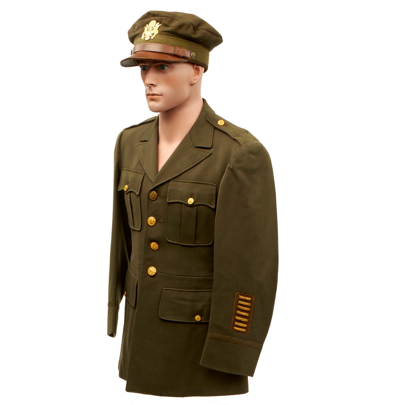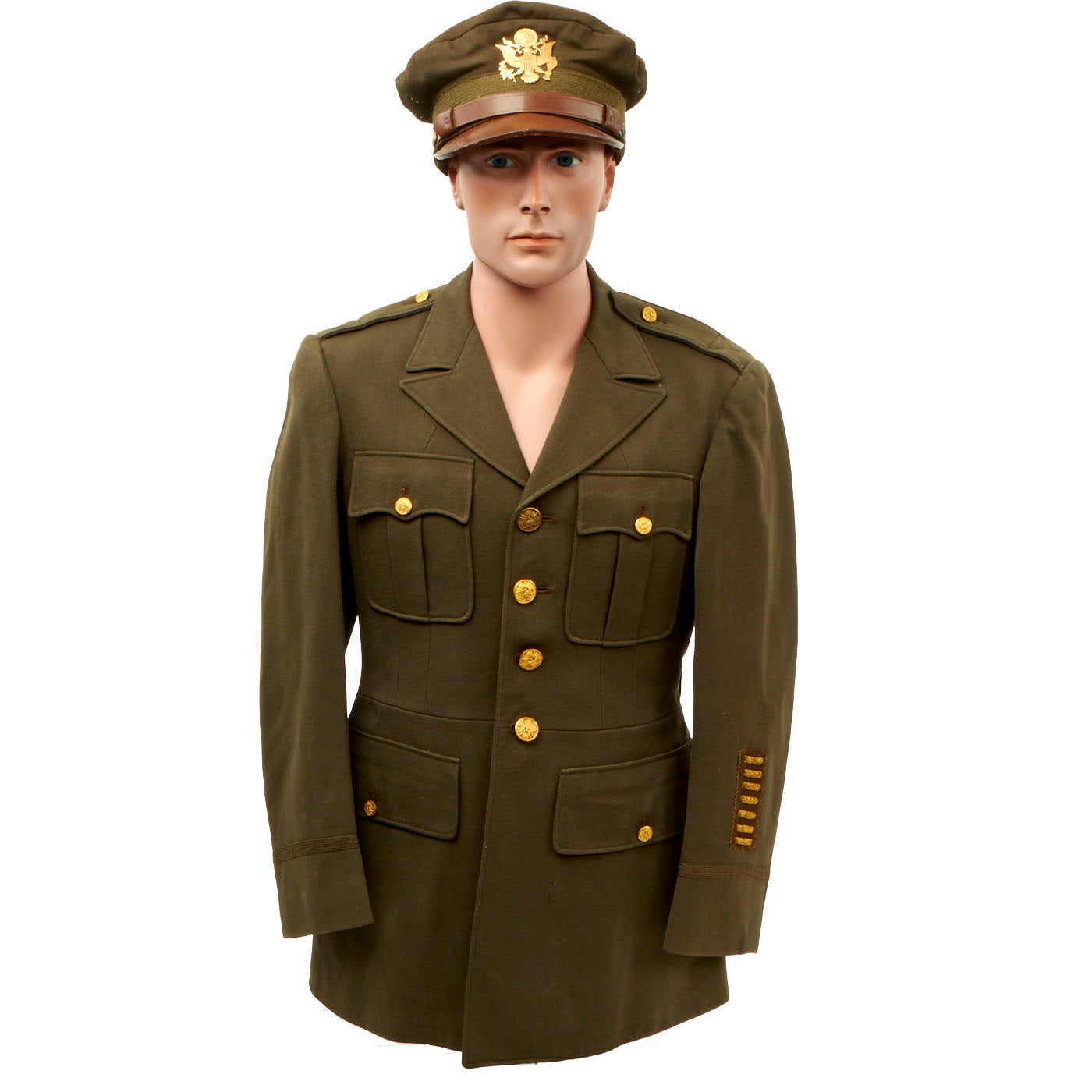 - Green Wool Service Coat: The jacket features all buttons but doesn’t have any devices or insignia present on the jacket. There are no patches except for gold bullion overseas bars showing 7 bars indicating that he spent 3 ½ years overseas. There is one tag on the inside, Regulation / Army Officer’s Uniform.