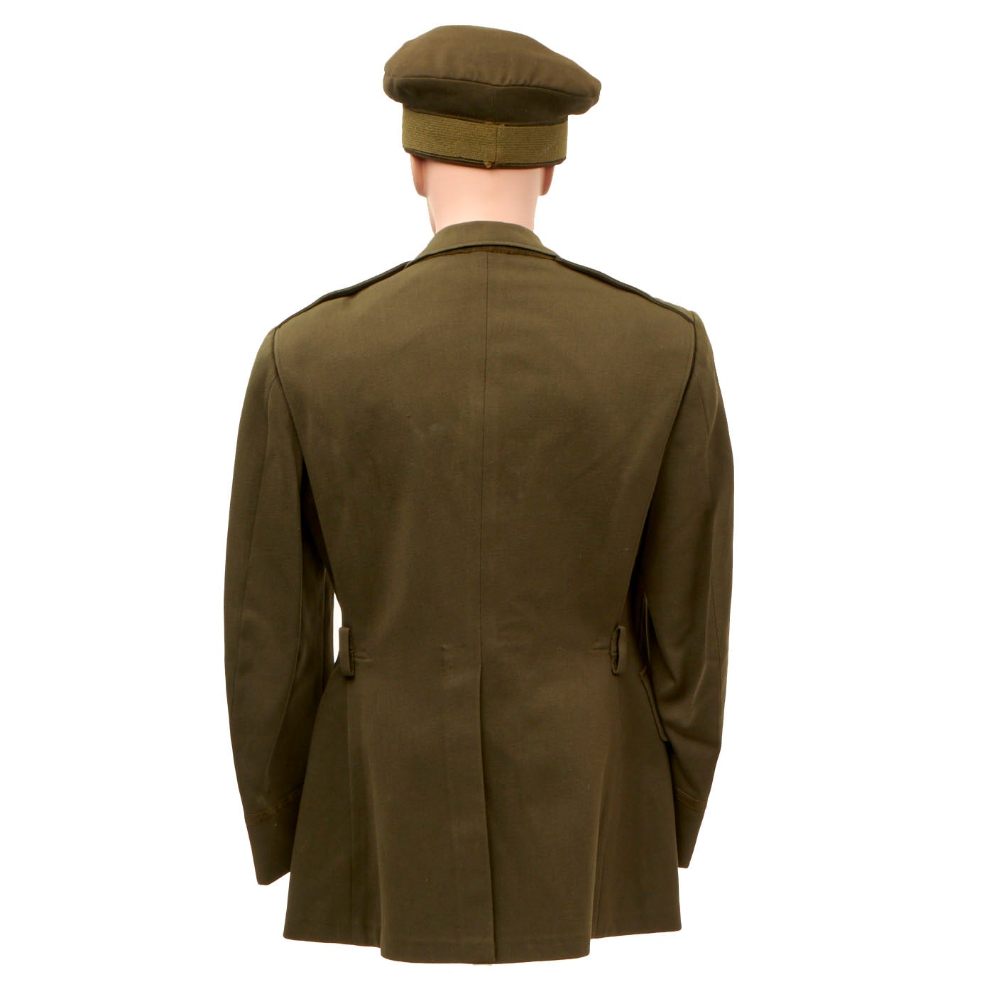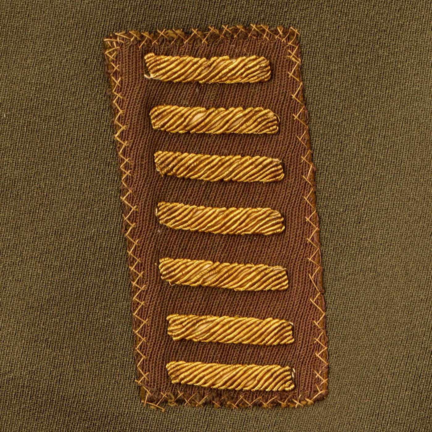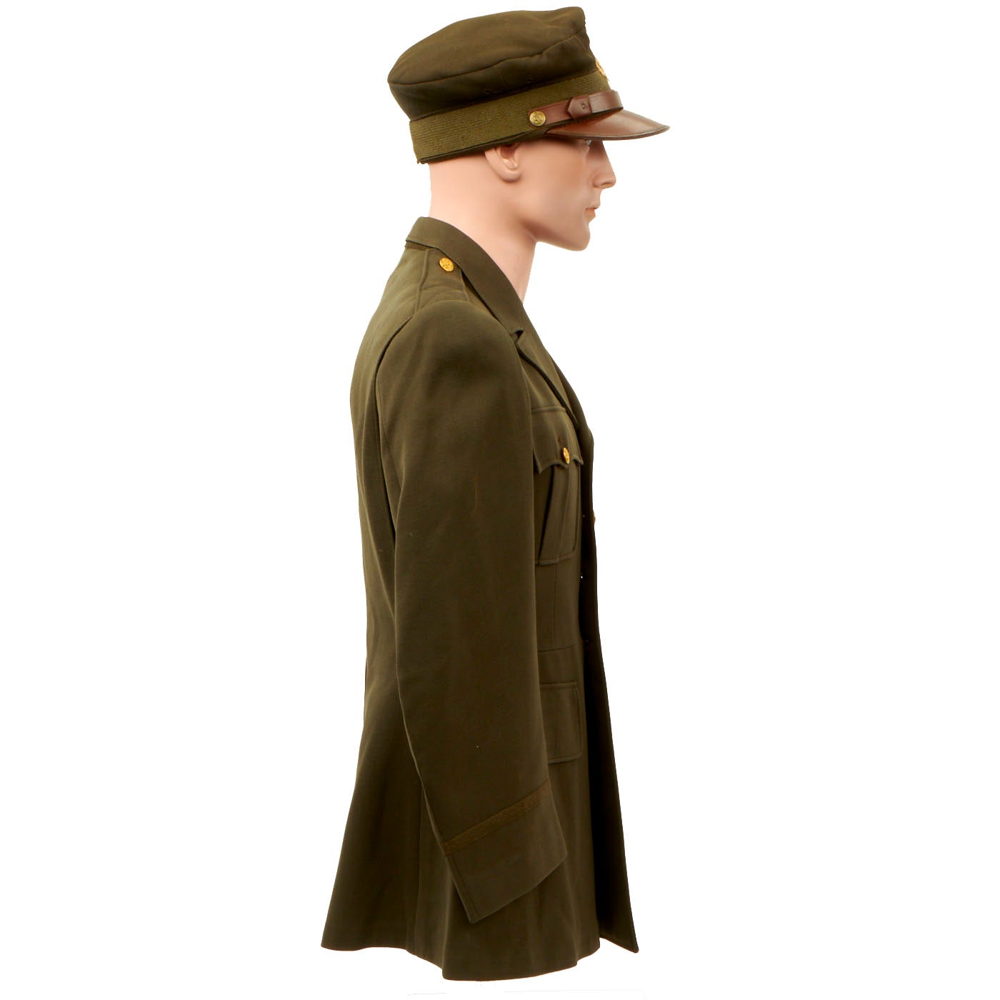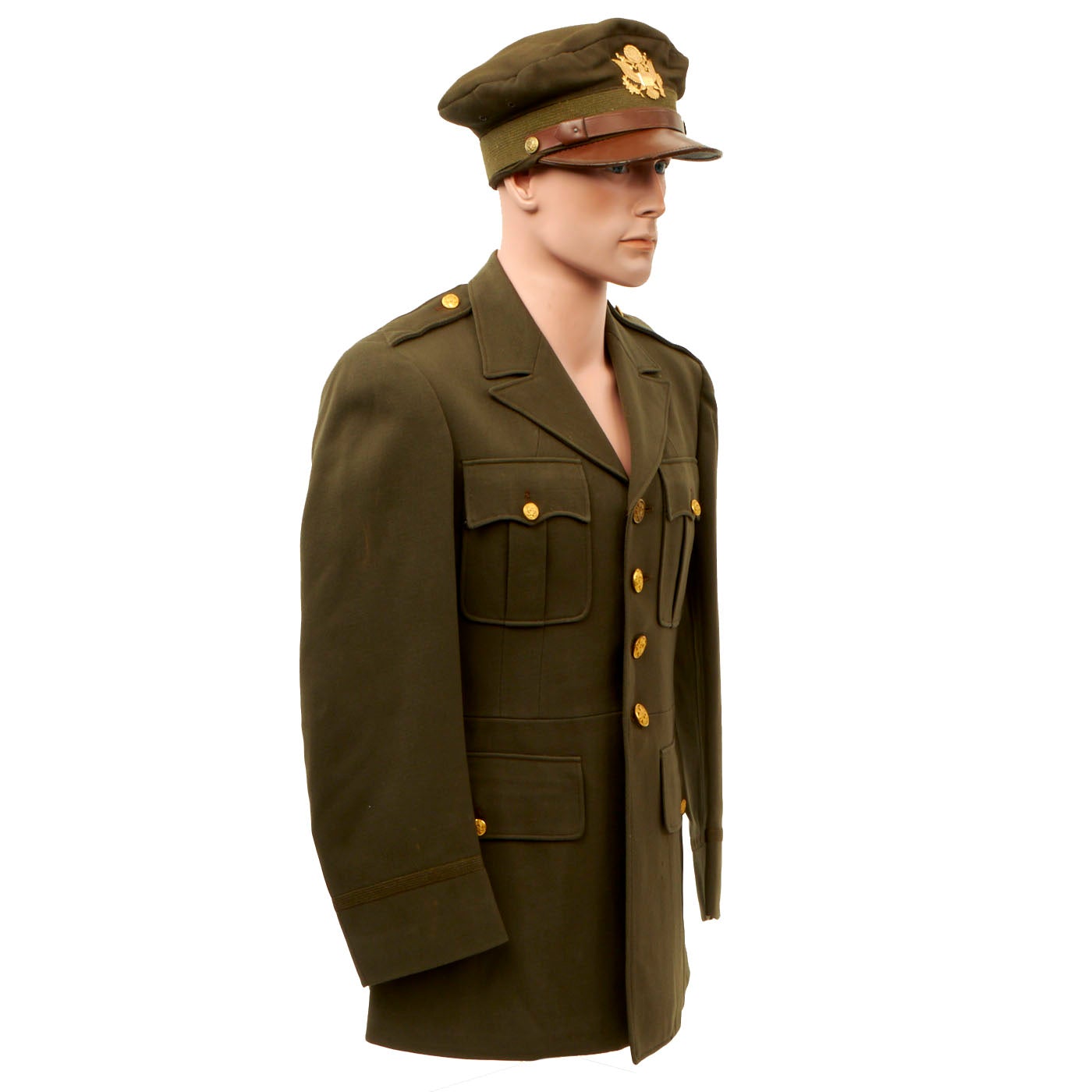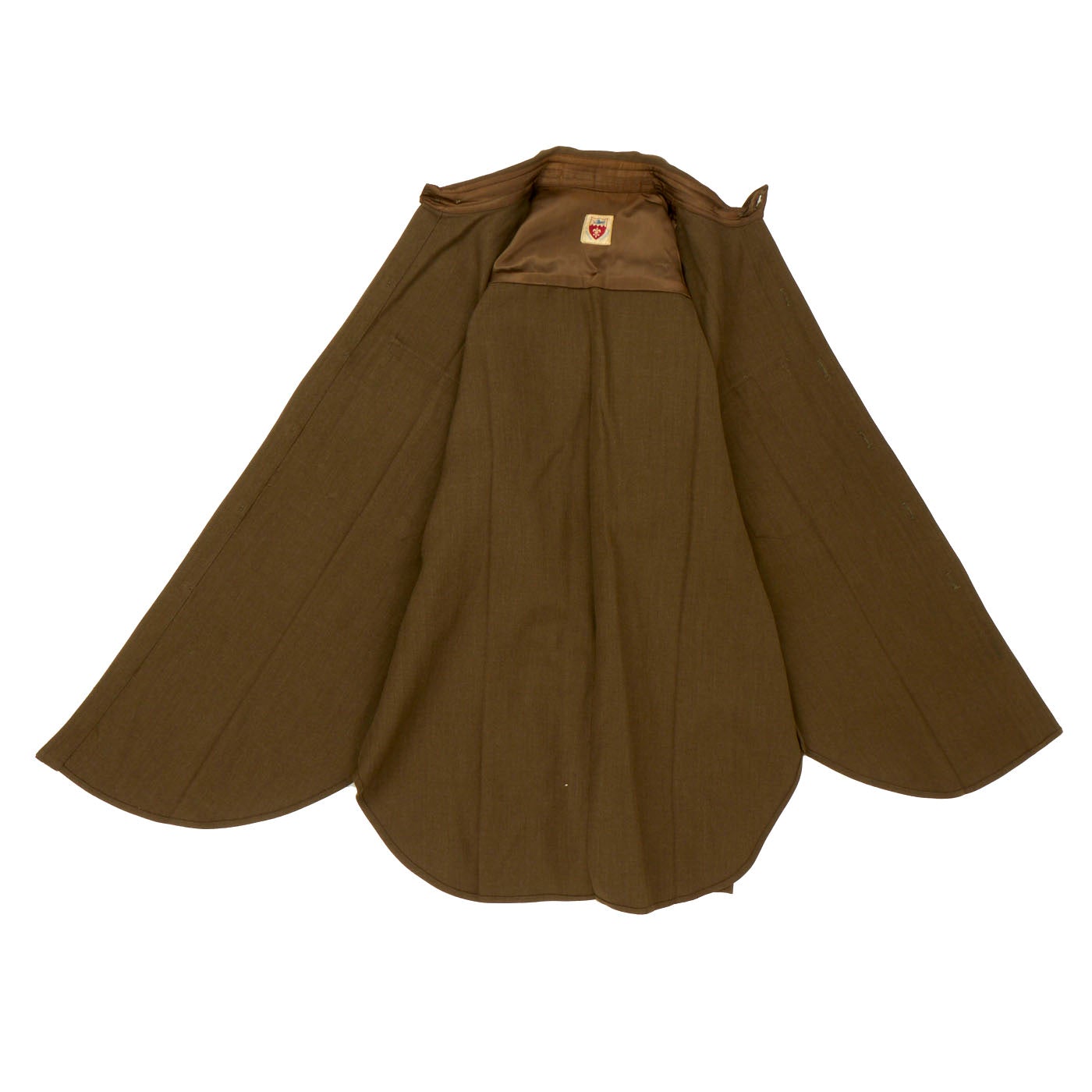 - Green Wool Service Coat: The jacket features all buttons but doesn’t have any devices or insignia present on the jacket. There are no patches except for gold bullion overseas bars showing 7 bars indicating that he spent 3 ½ years overseas. There is one tag on the inside, Regulation / Army Officer’s Uniform.