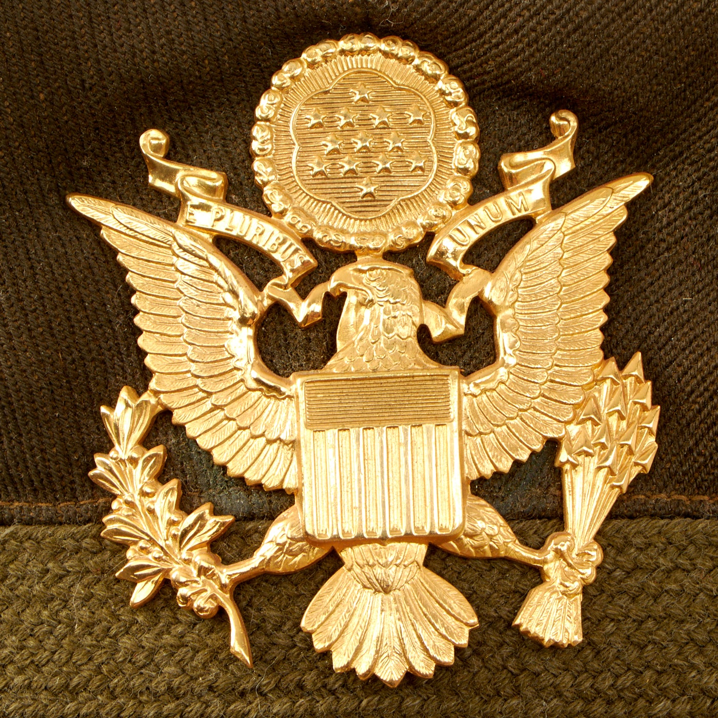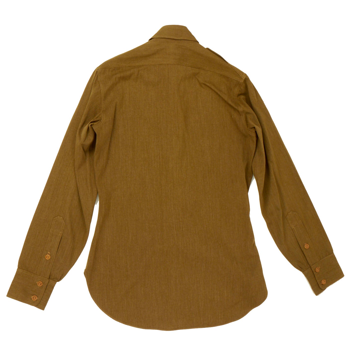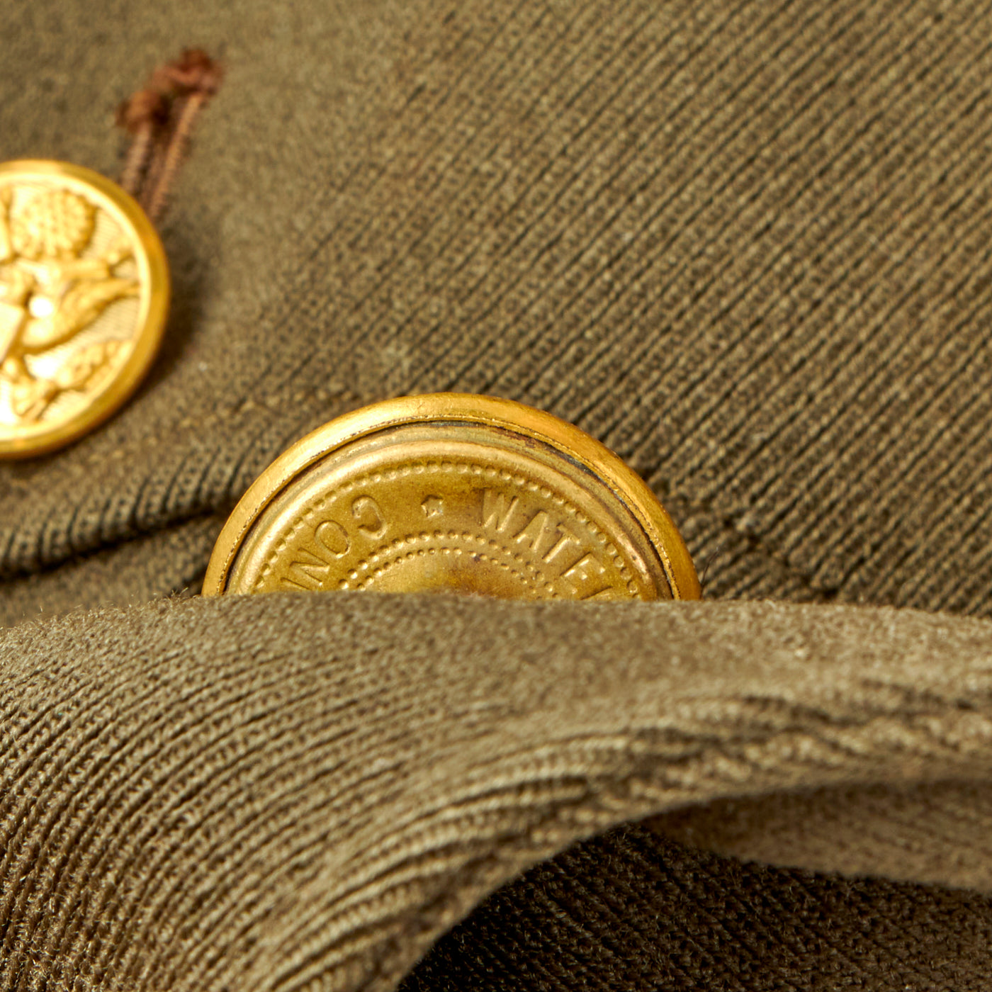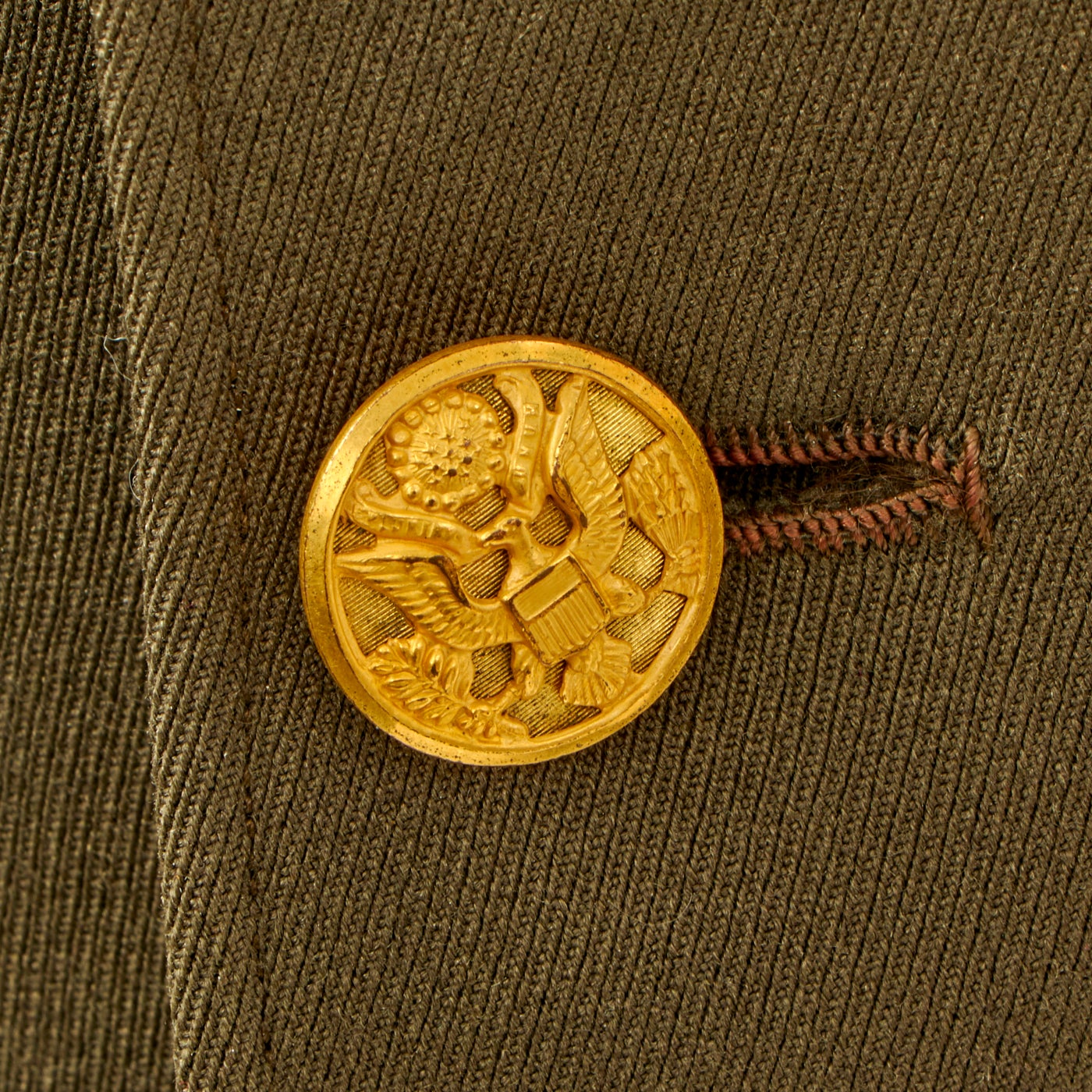 - Green Wool Service Coat: The jacket features all buttons but doesn’t have any devices or insignia present on the jacket. There are no patches except for gold bullion overseas bars showing 7 bars indicating that he spent 3 ½ years overseas. There is one tag on the inside, Regulation / Army Officer’s Uniform.
