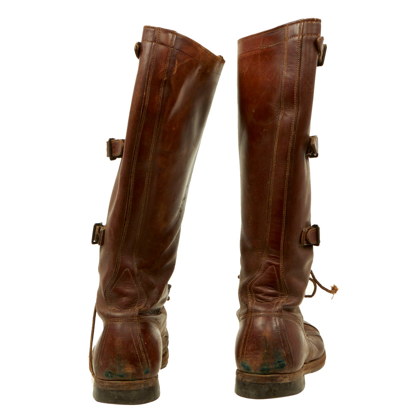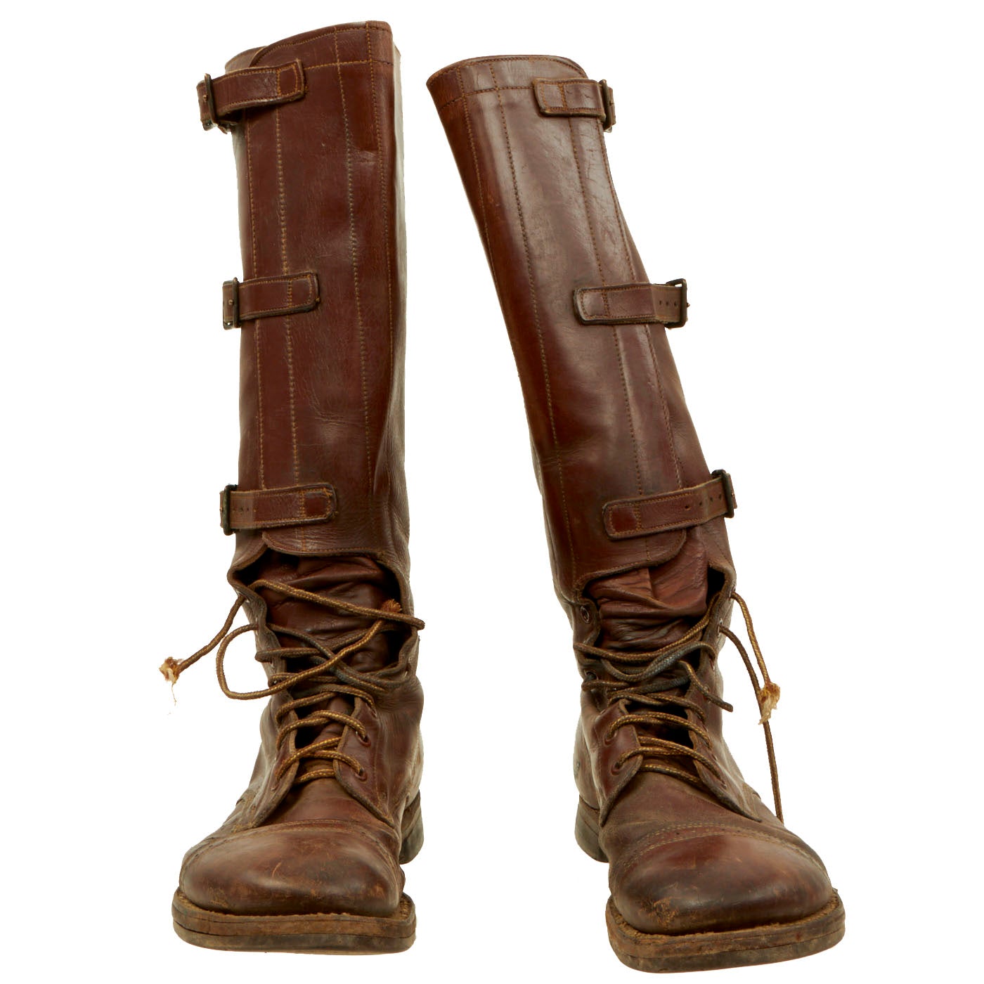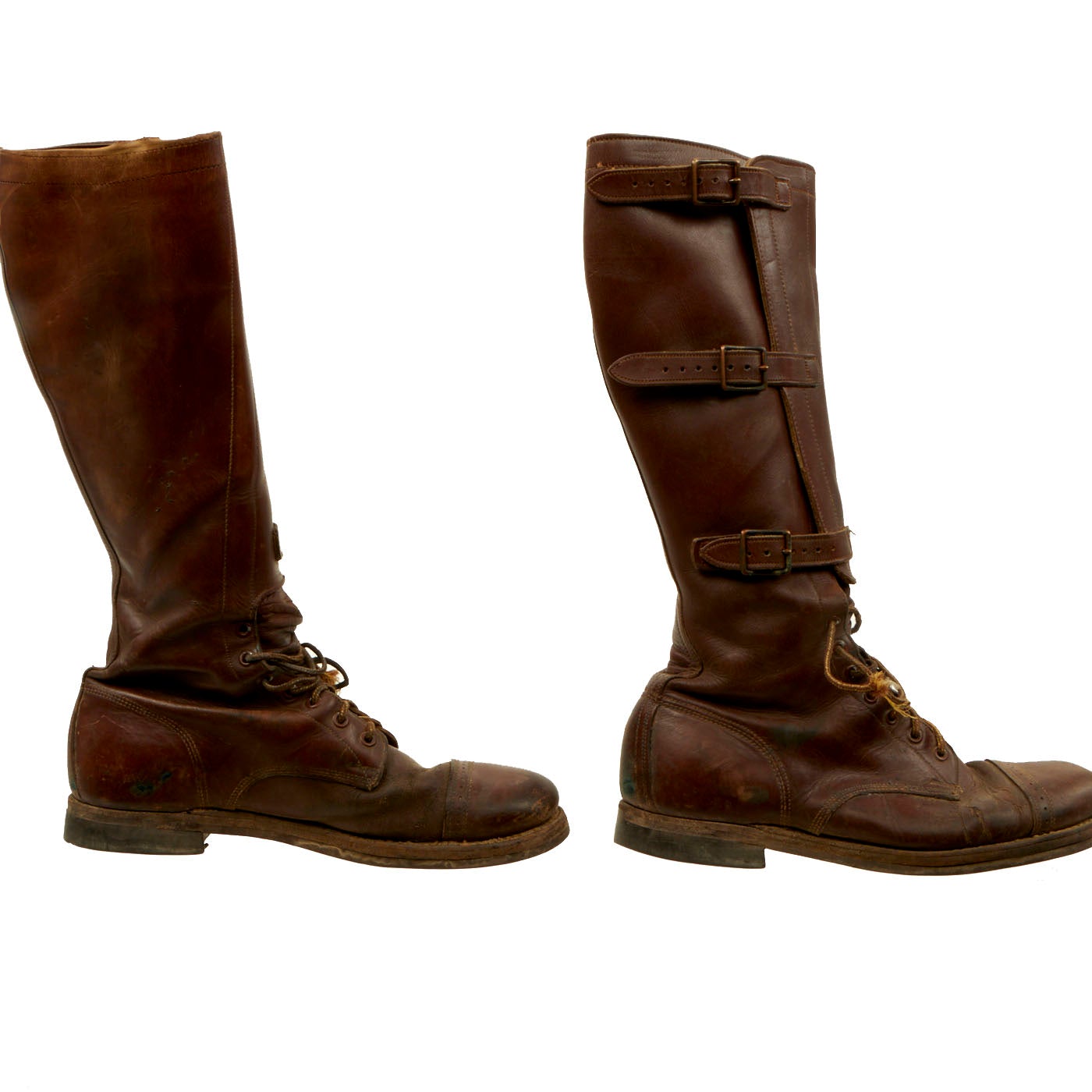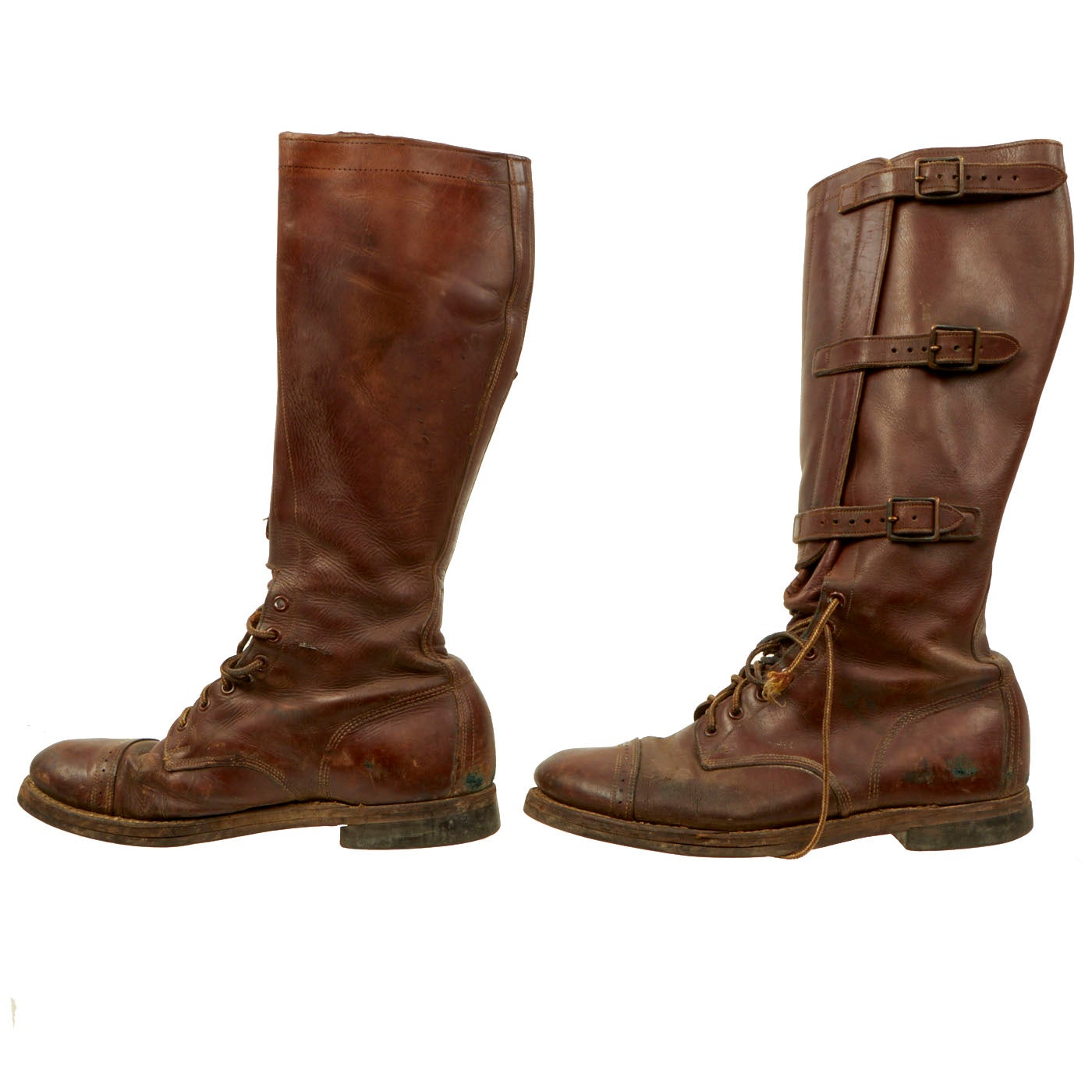 - Pair of Riding Boots: These 17” tall boots show signs of definite use and wear to them. The laces, which appear to be replacements, are broken and frayed on both boots. There is some damage and tearing to the boots but nothing major. The soles are still completely intact as well as all buckles and straps. The boots are approximately a size 10 ½.
