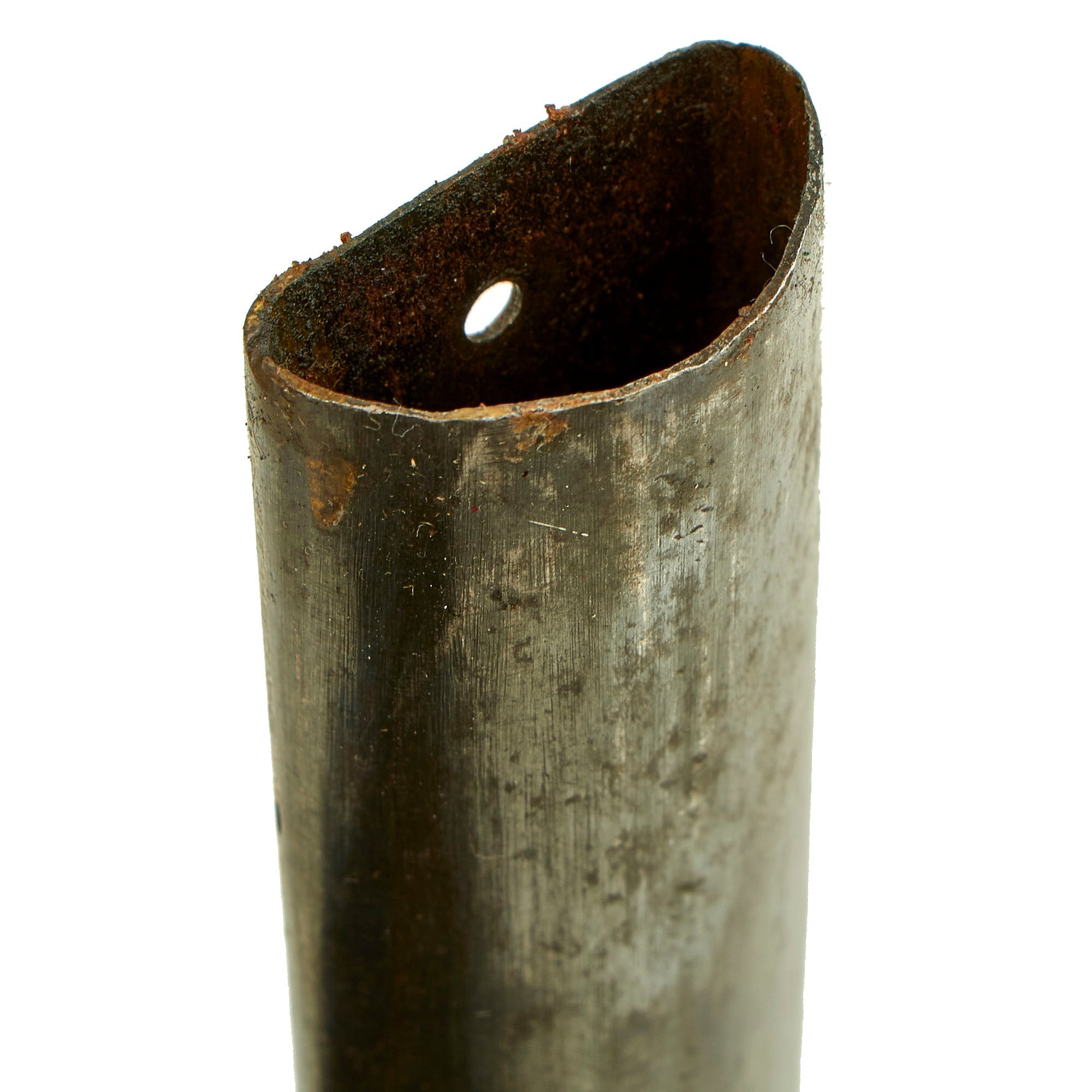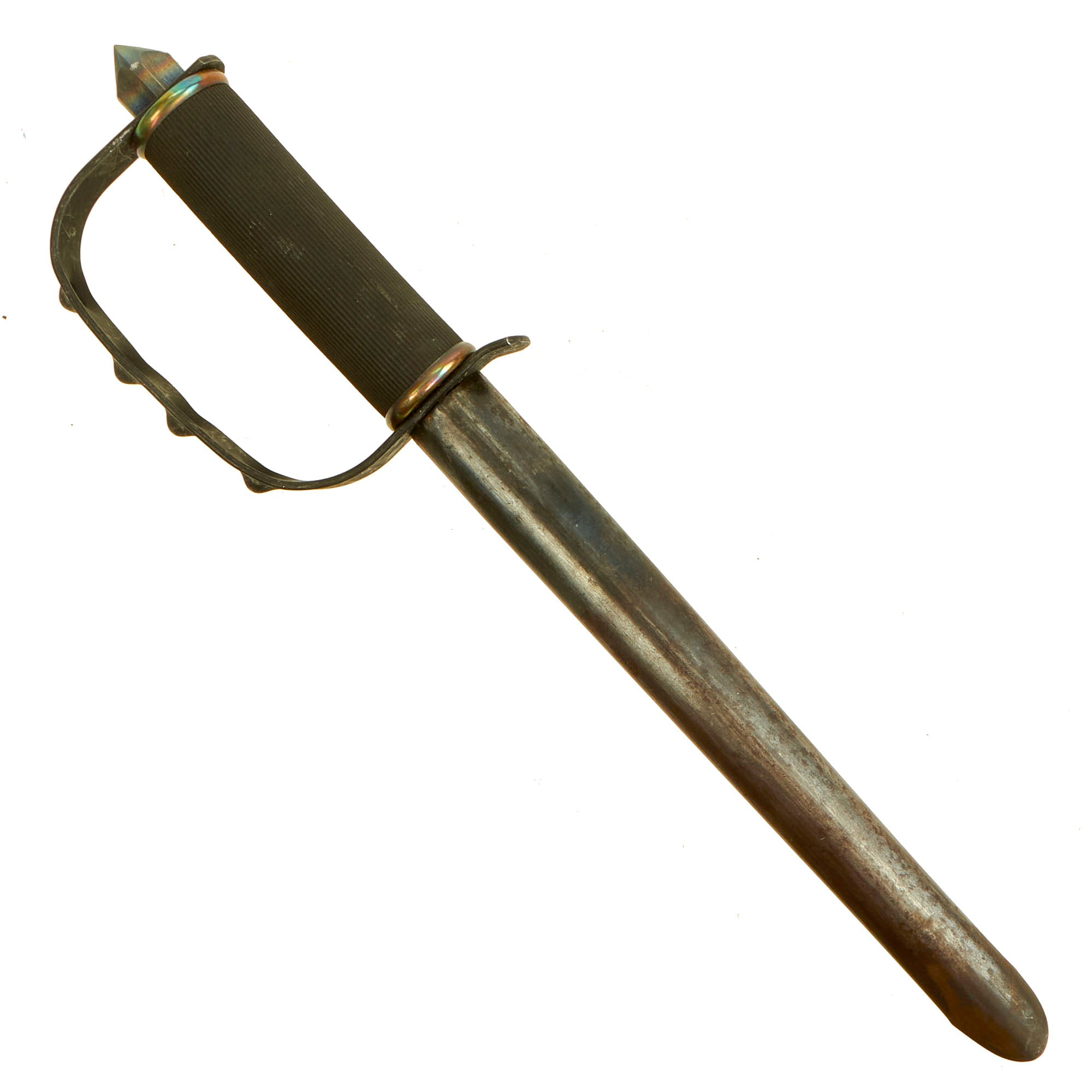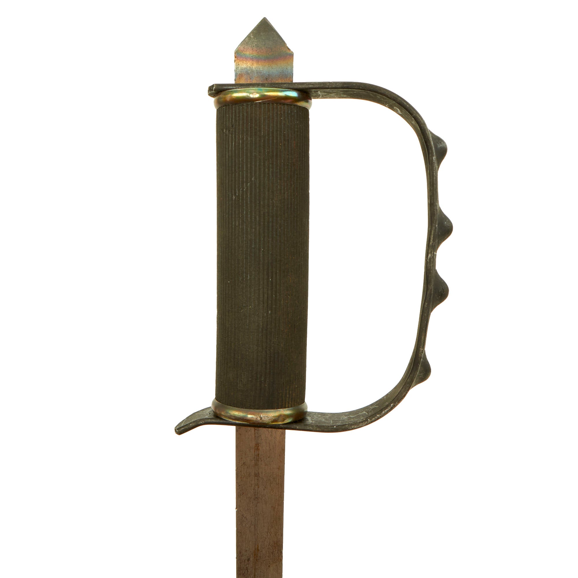 The OSS Drop Knife was manufactured in two patterns. The first, which this one is, was made from surplus US M-1873 Trapdoor rifle bayonets, and used their metal scabbard bodies as well. The second pattern, used surplus M-1913 Patton Saber blades. The knives were built using the original blades, which were cut down to size. A stamped metal, D-shaped handguard with 4 stamped spikes was attached around a hilt that utilized rubber hosing for the grip. The knives were unmarked (thus the “sterile” nomenclature), and were essentially inexpensive copies of the US M-1917 Trench Knife. The bayonet blade extended through the grip, forming the hilt, and extended out the back of the D-guard, where it was shaped into a point to form a skull crusher. The original metal scabbards were shortened and then crimped closed, and the scabbard was intended to be suspended from a leather belt frog.
