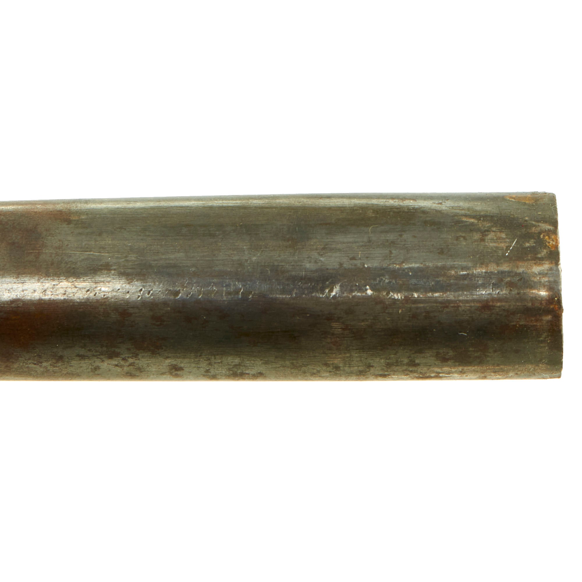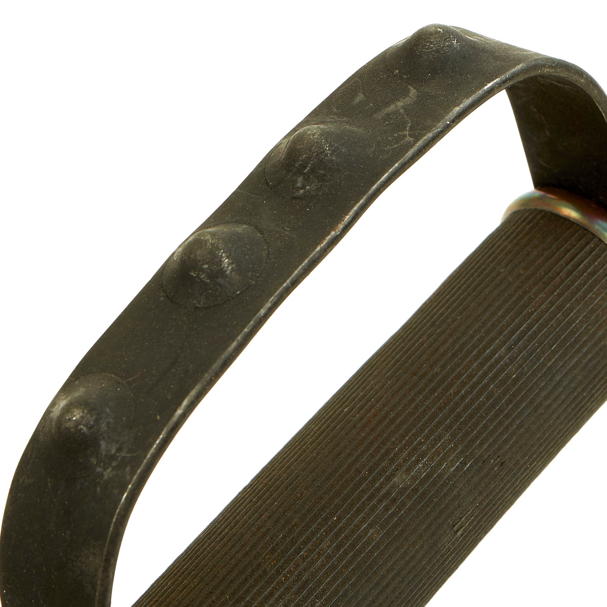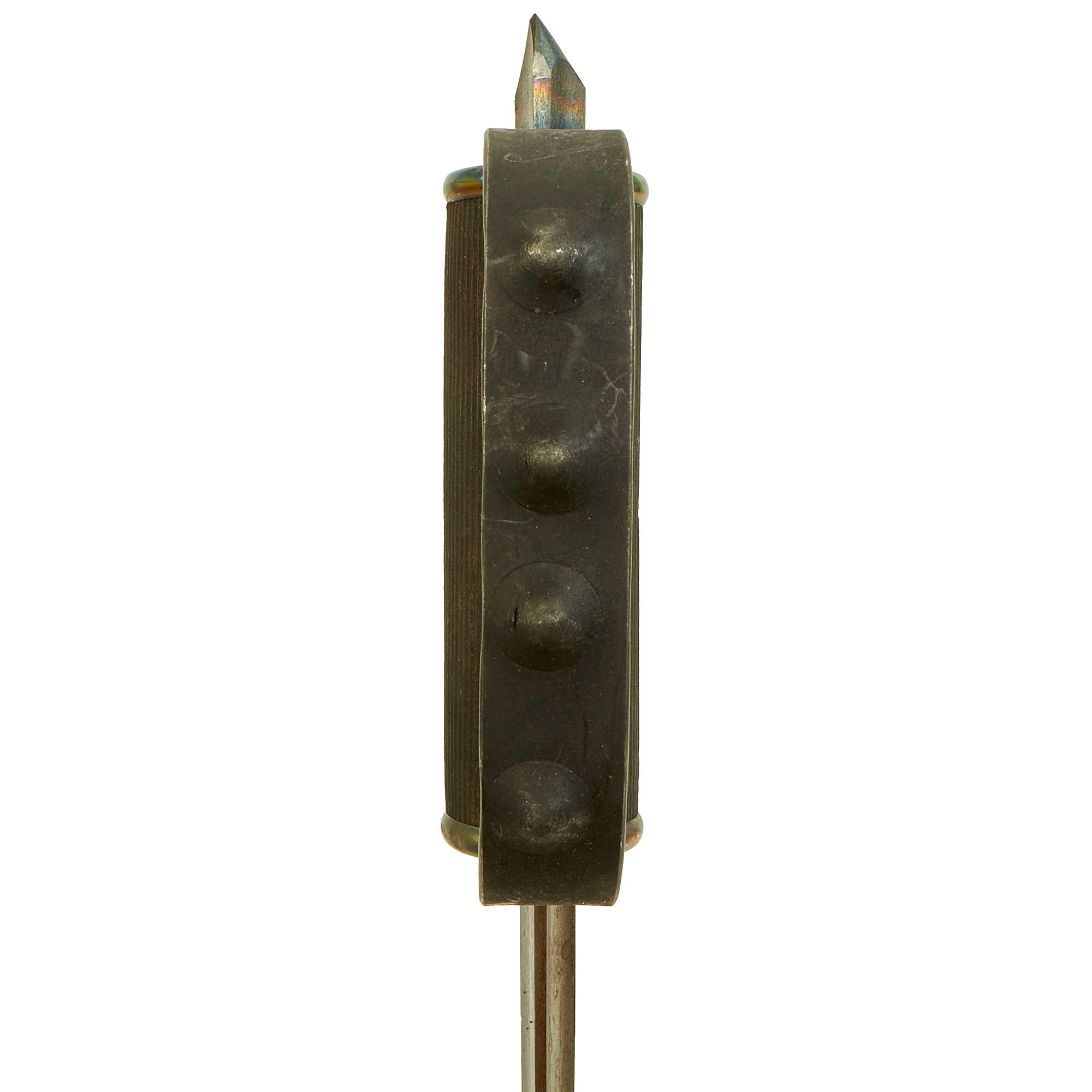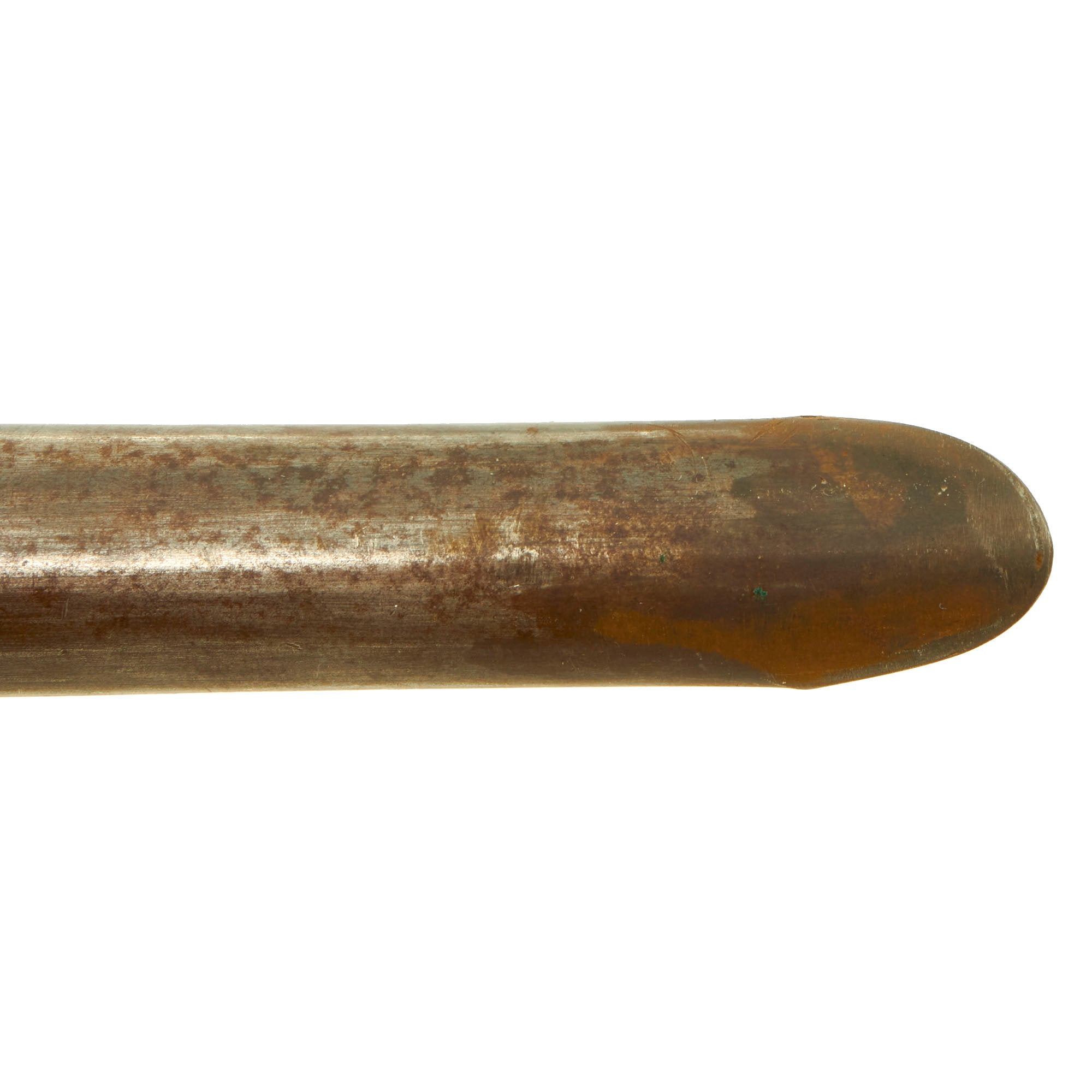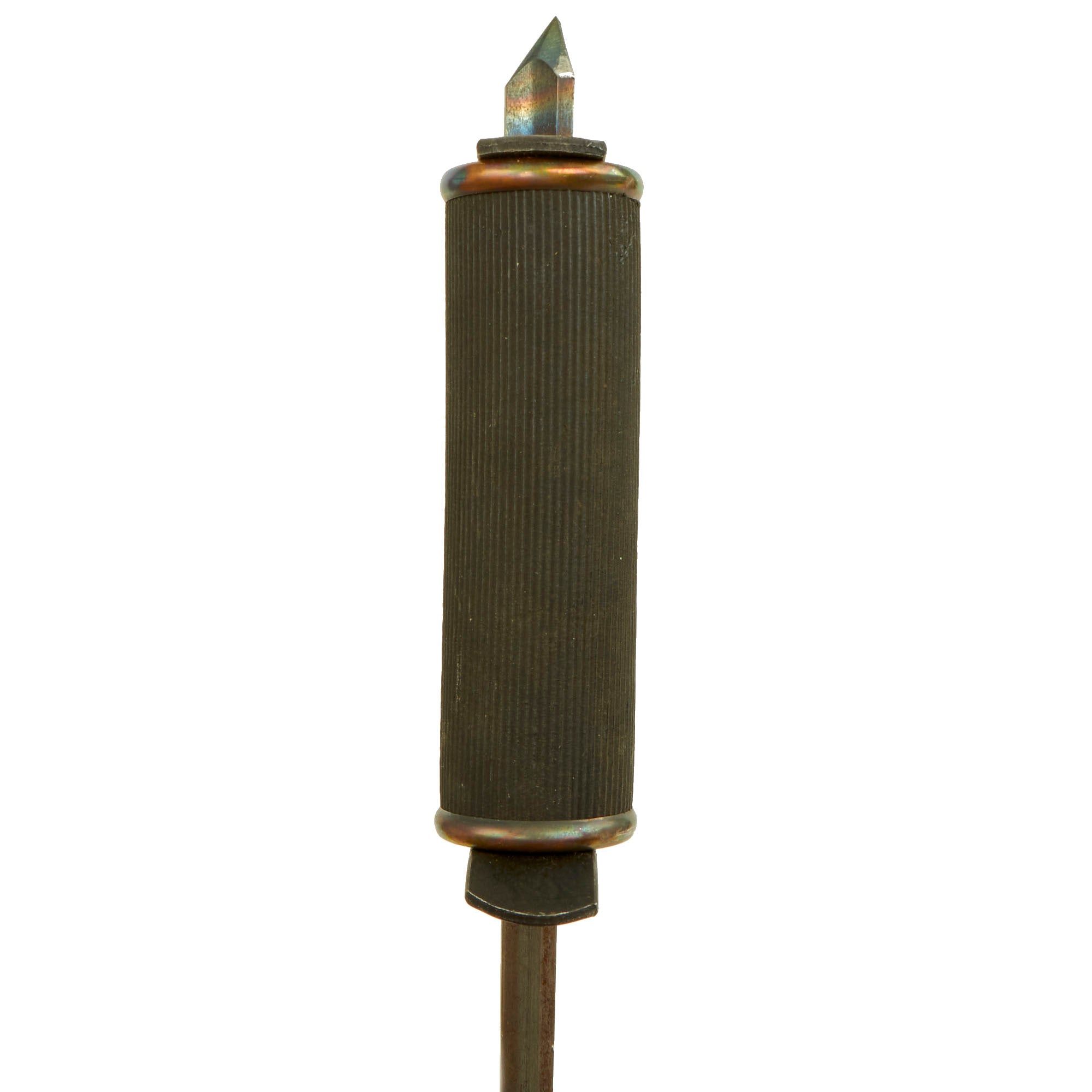 This OSS Drop Knife is in very good condition, and looks to have been made from a trapdoor bayonet that had seen service and wear. The original finish is worn, with light spotted staining and surface rust throughout. The stamped D-guard has some of its original black paint, and four “knuckle” ridges stamped into it. The guard is in fine condition, with no major damage or dents. There were many of these available as rifles were converted to take the "rod" bayonet used with the model 1888. The rubber grip is now relatively hard, due to the age, but it still has all of the texture and no cracks that we can see.
