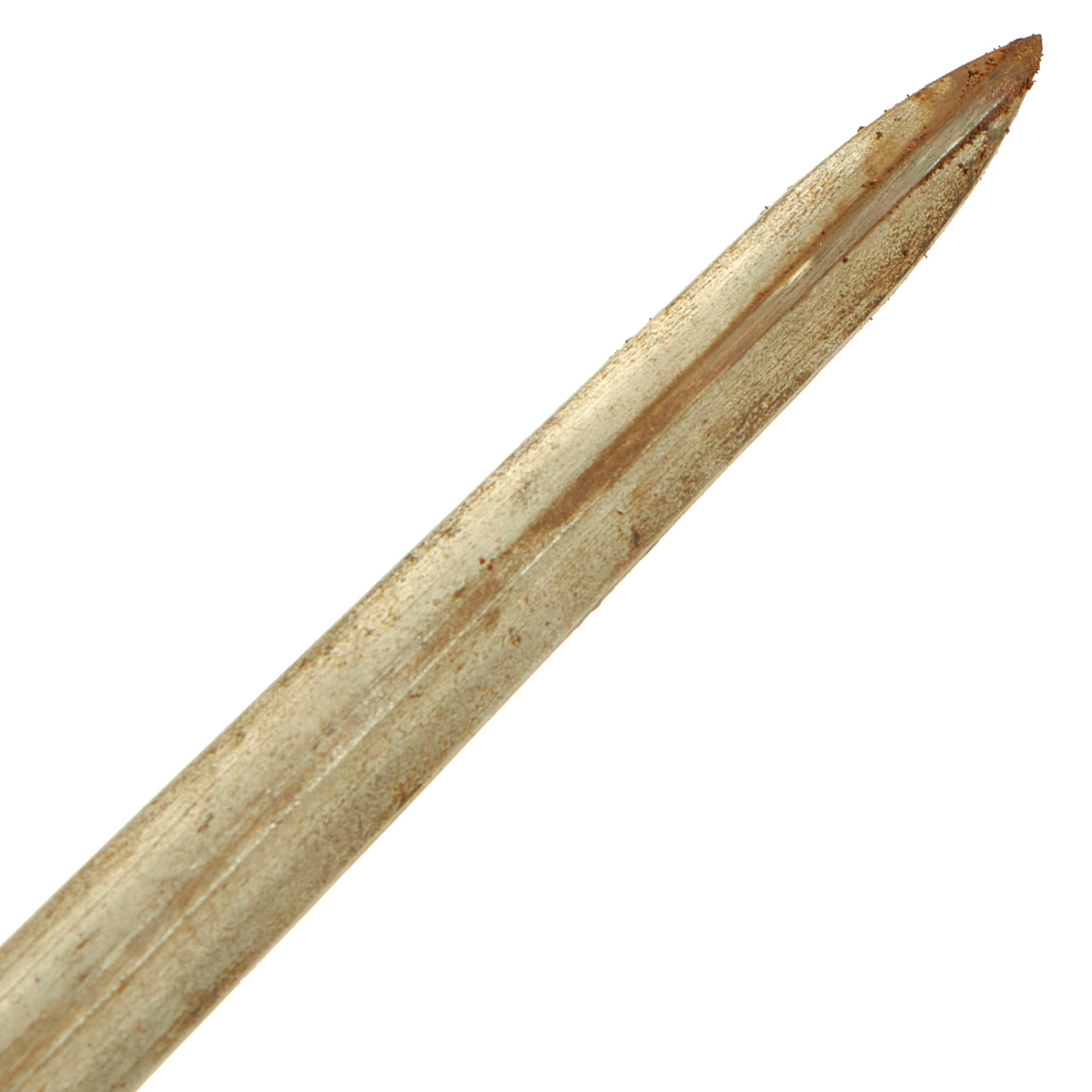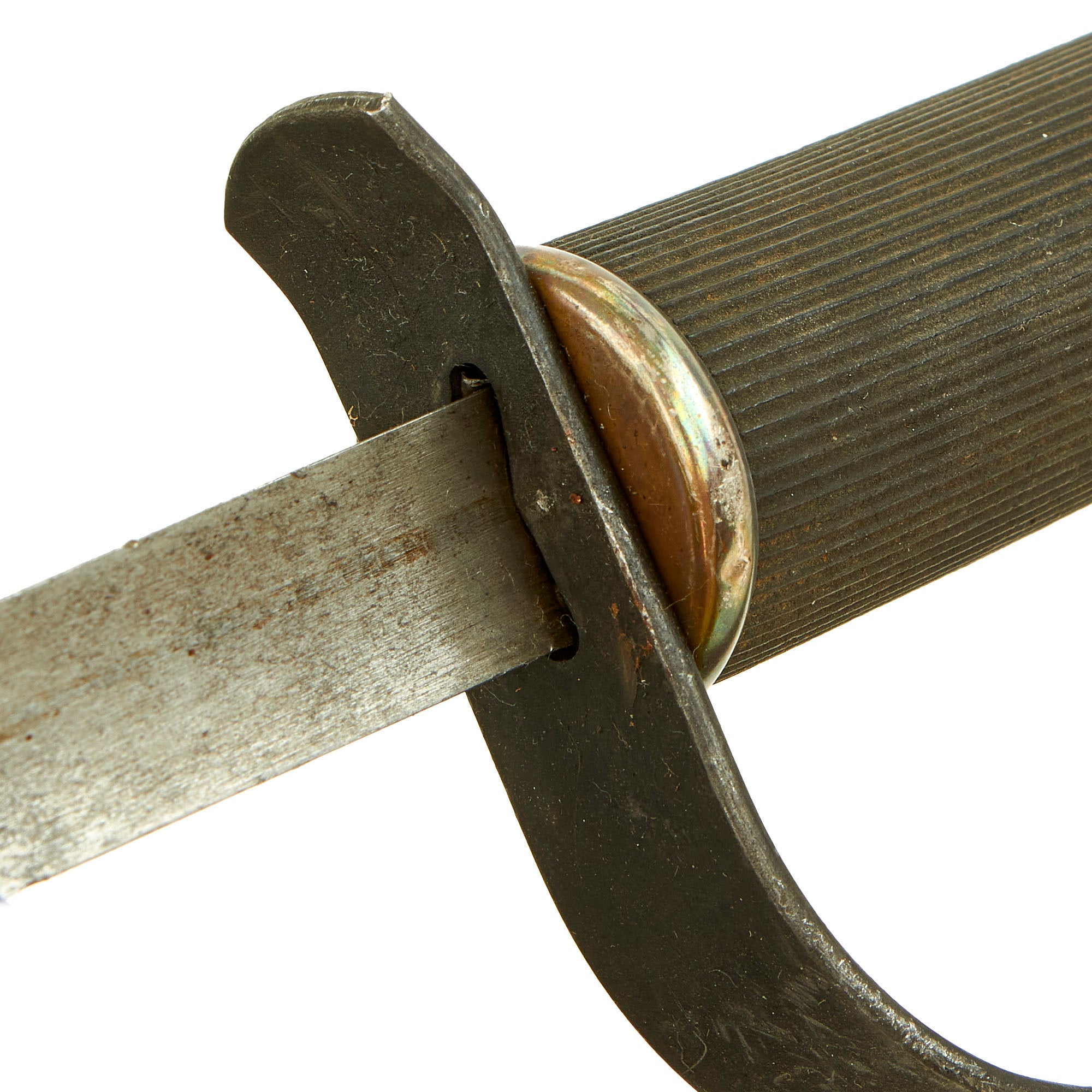 The end of the bayonet that projects through the stamped metal D-guard has been fashioned into a skull crusher, as is typical of these knives. There is even still the "rainbow" color created from heat when the blade was originally cut. The blade is 8 7/8” in length and the overall length of the knife is about 14 1/8”, from the tip of the skull crusher to the tip of the knife. These were made by hand without much measuring, so every example we have seen is a bit different in length.