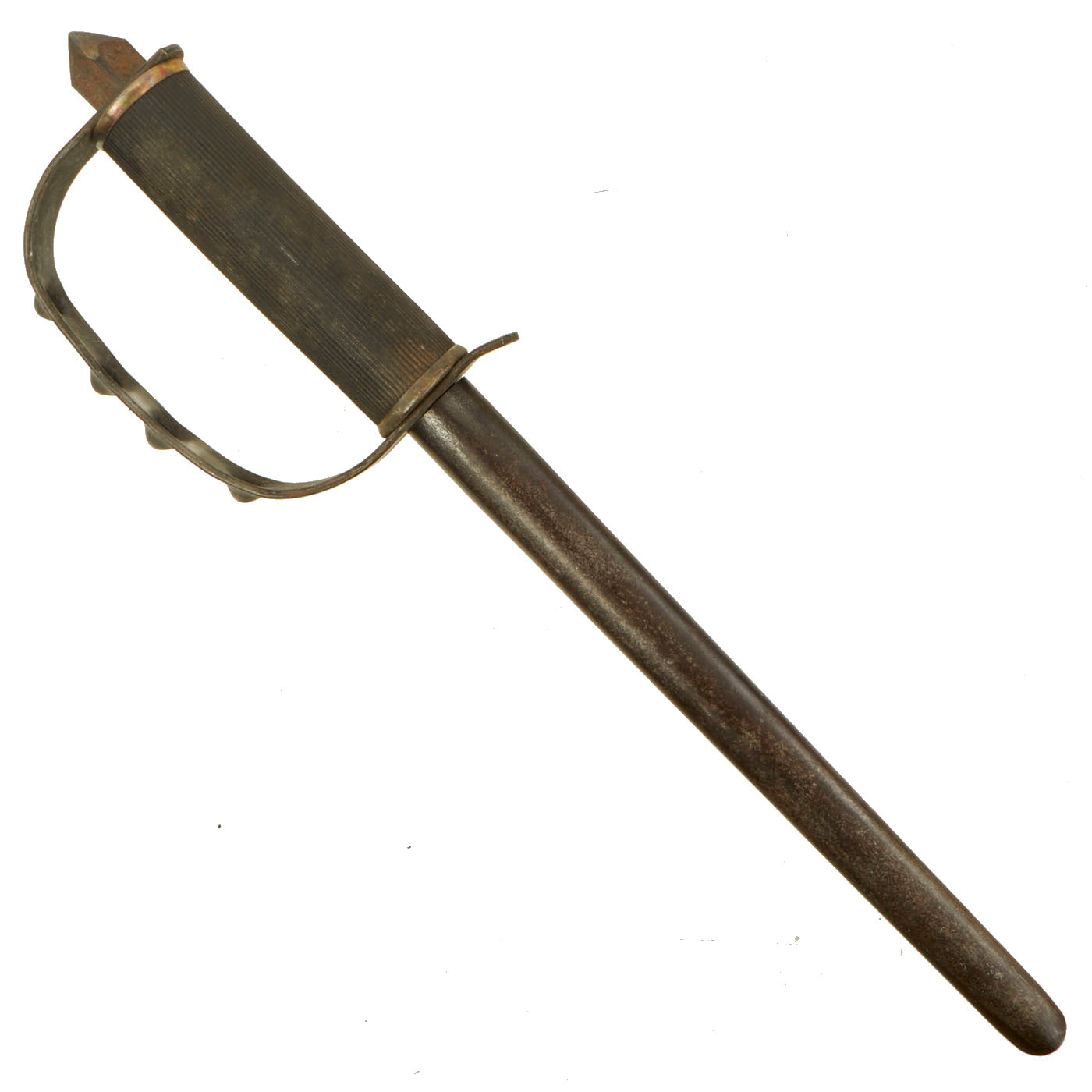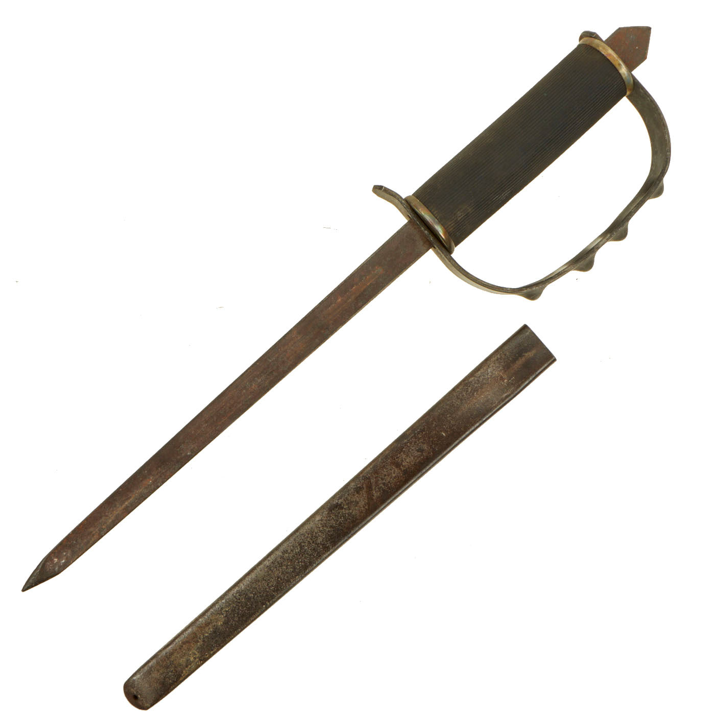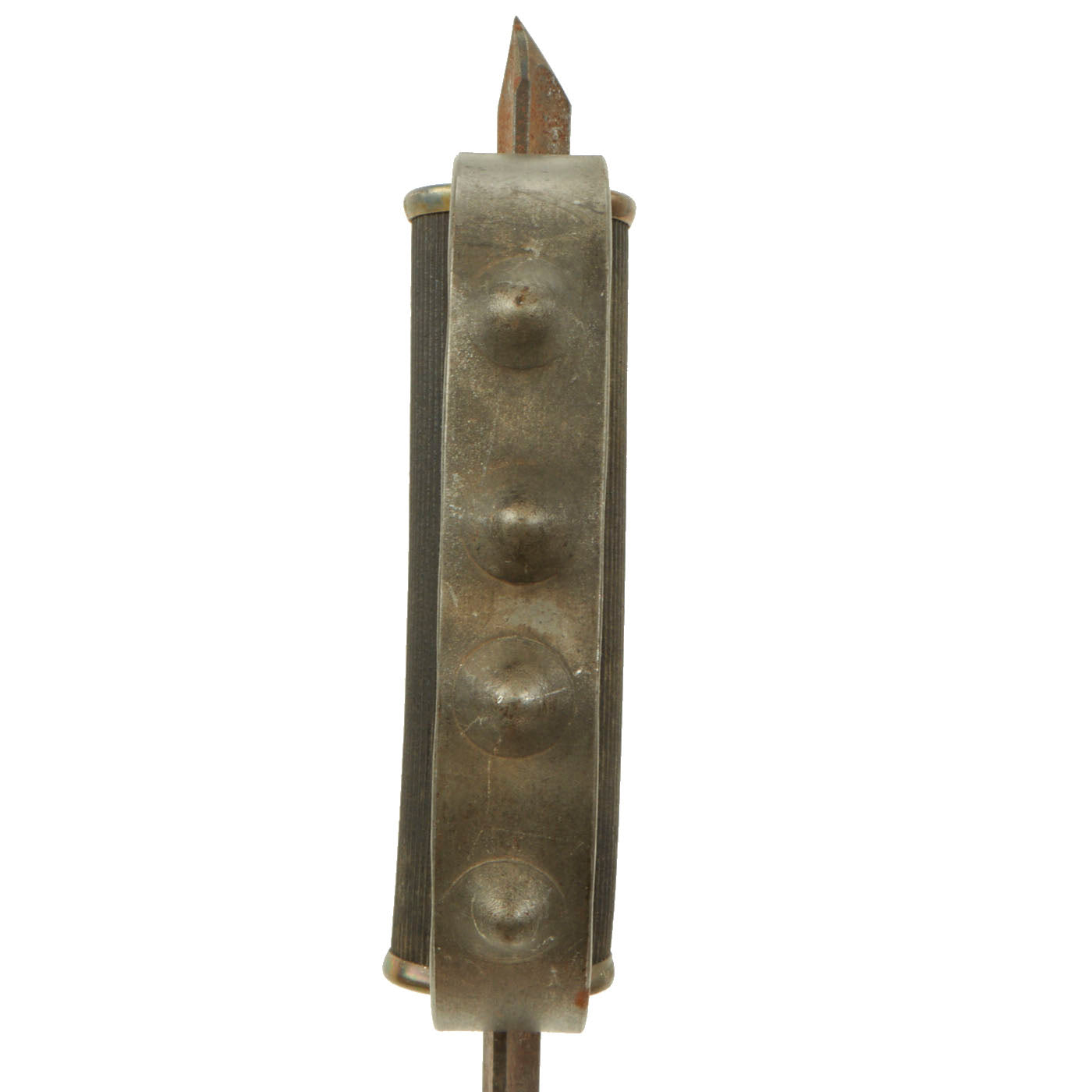 The OSS Drop Knife was manufactured in two patterns. The first, which this one is, was made from surplus US M-1873 Trapdoor rifle bayonets, and used their metal scabbard bodies as well. The second pattern, used surplus M-1913 Patton Saber blades. The knives were built using the original blades, which were cut down to size. A stamped metal, D-shaped handguard with 4 stamped spikes was attached around a hilt that utilized rubber hosing for the grip. The knives were unmarked (thus the “sterile” nomenclature), and were essentially inexpensive copies of the US M-1917 Trench Knife. The bayonet blade extended through the grip, forming the hilt, and extended out the back of the D-guard, where it was shaped into a point to form a skull crusher. The original metal scabbards were shortened and then crimped closed, and the scabbard was intended to be suspended from a leather belt frog.