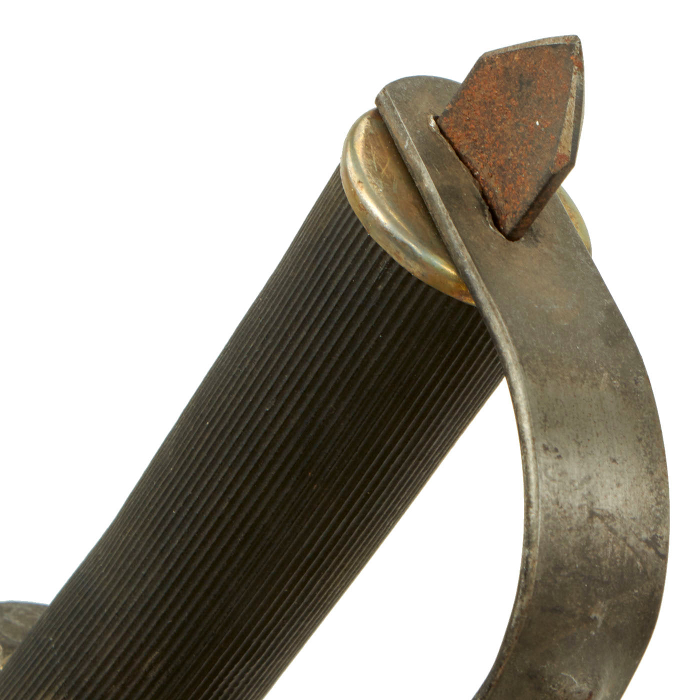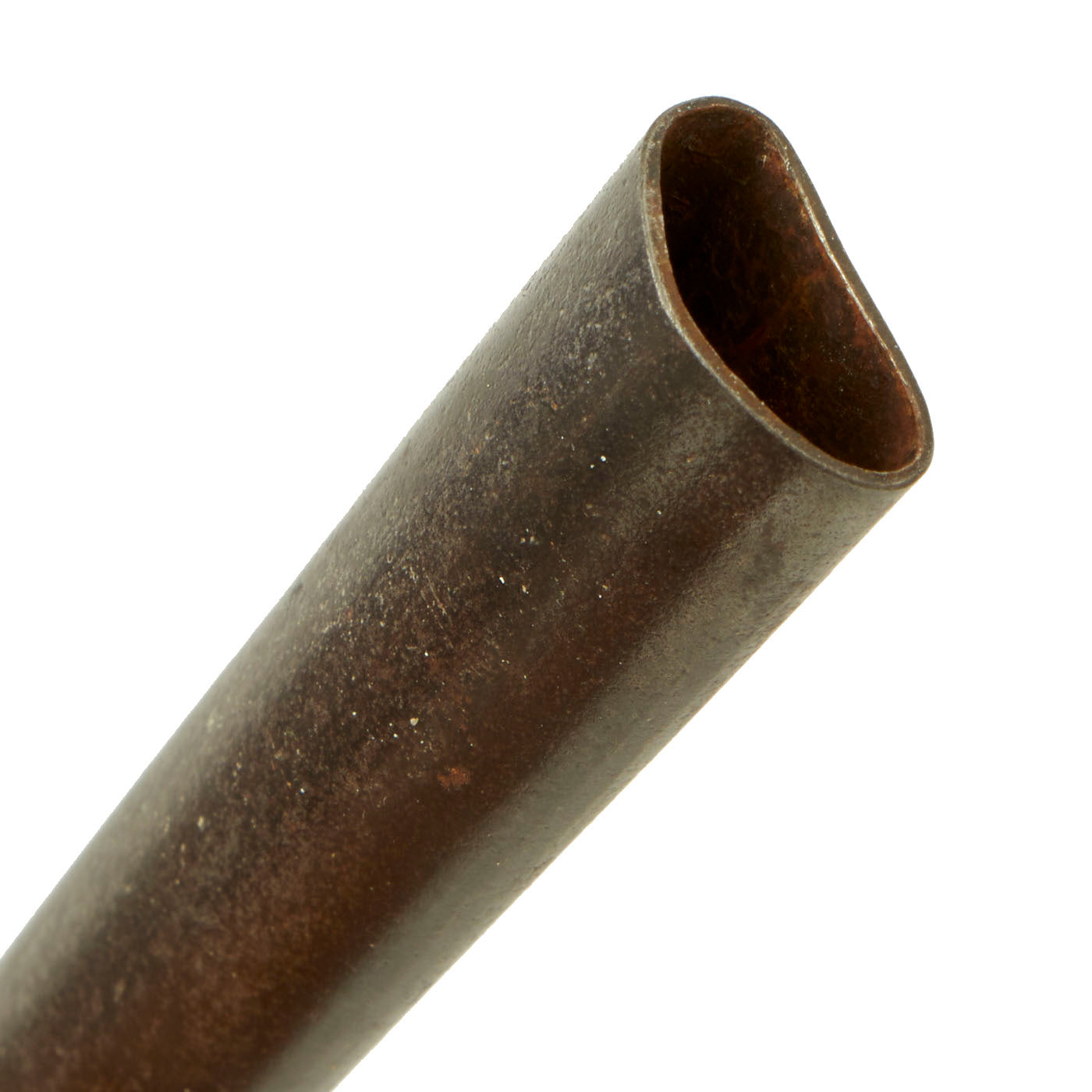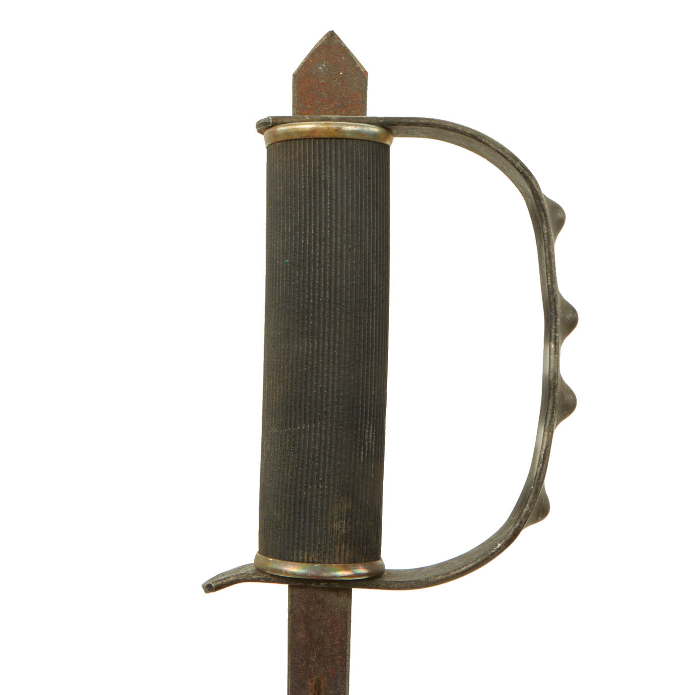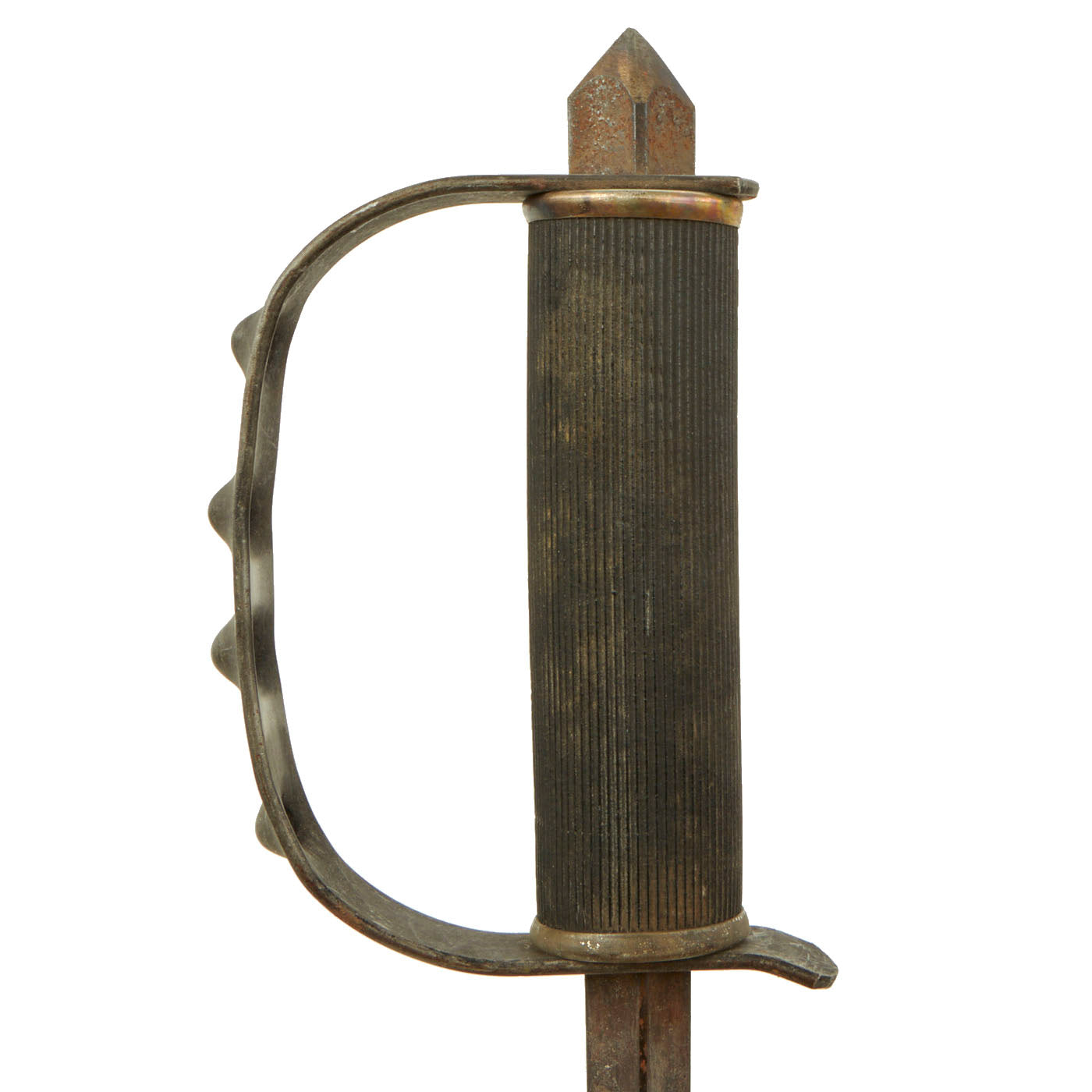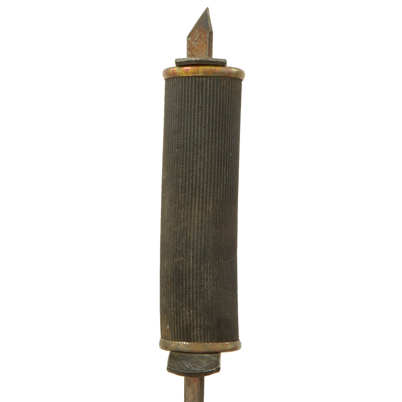 This OSS Drop Knife is in very good condition, and looks to have been made from a trapdoor bayonet that had seen service and wear. The original finish is worn, with spotted staining and surface rust throughout. The stamped D-guard has some of its original black paint, and four “knuckle” ridges stamped into it. The guard is in fine condition, with no major damage or dents. There were many of these available as rifles were converted to take the "rod" bayonet used with the model 1888. The rubber grip is now relatively hard, due to the age, but it still has all of the texture and no cracks that we can see.