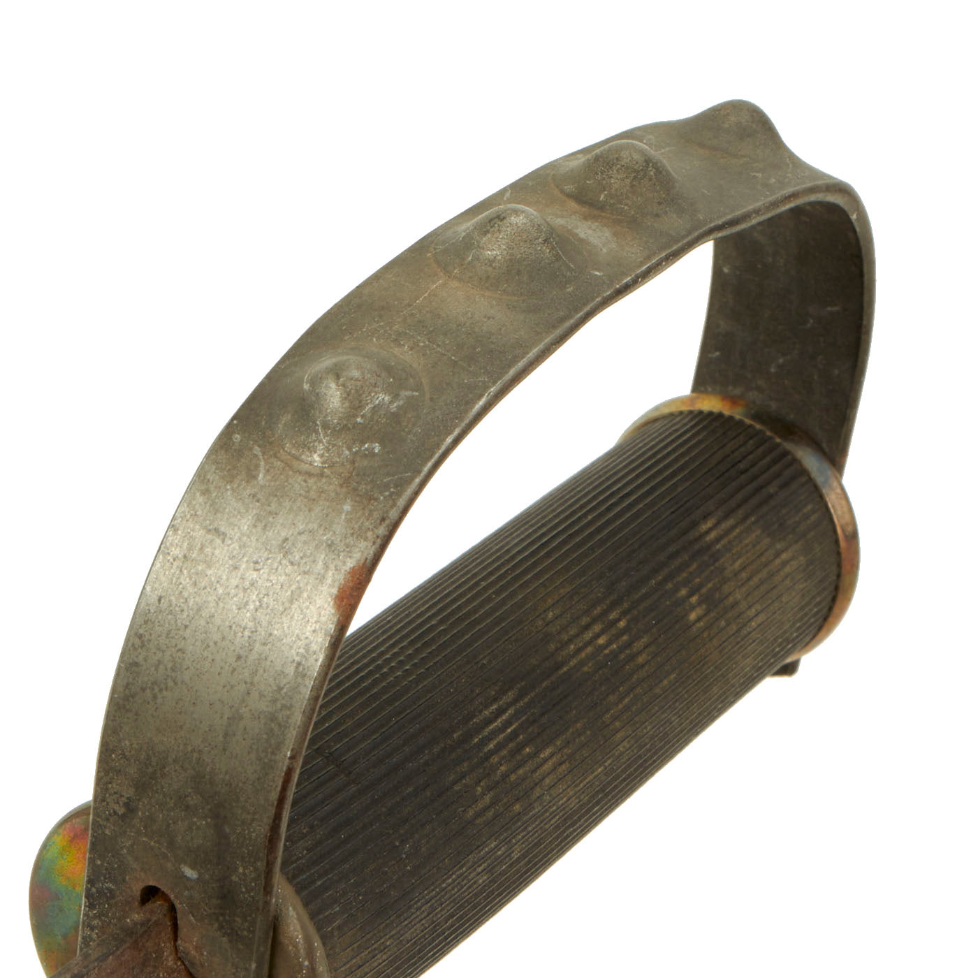 The end of the bayonet that projects through the stamped metal D-guard has been fashioned into a skull crusher, as is typical of these knives. There is even still the "rainbow" color created from heat when the blade was originally cut. The blade is 8 7/8” in length and the overall length of the knife is about 14 1/8”, from the tip of the skull crusher to the tip of the knife. These were made by hand without much measuring, so every example we have seen is a bit different in length.
