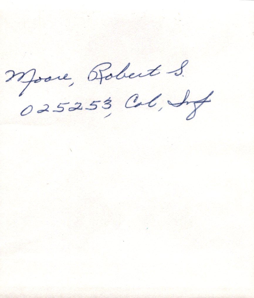 - Three 3 x 3 ½” copies of the same photo of Moore, all inscribed with his name, number, rank, and branch on the back.