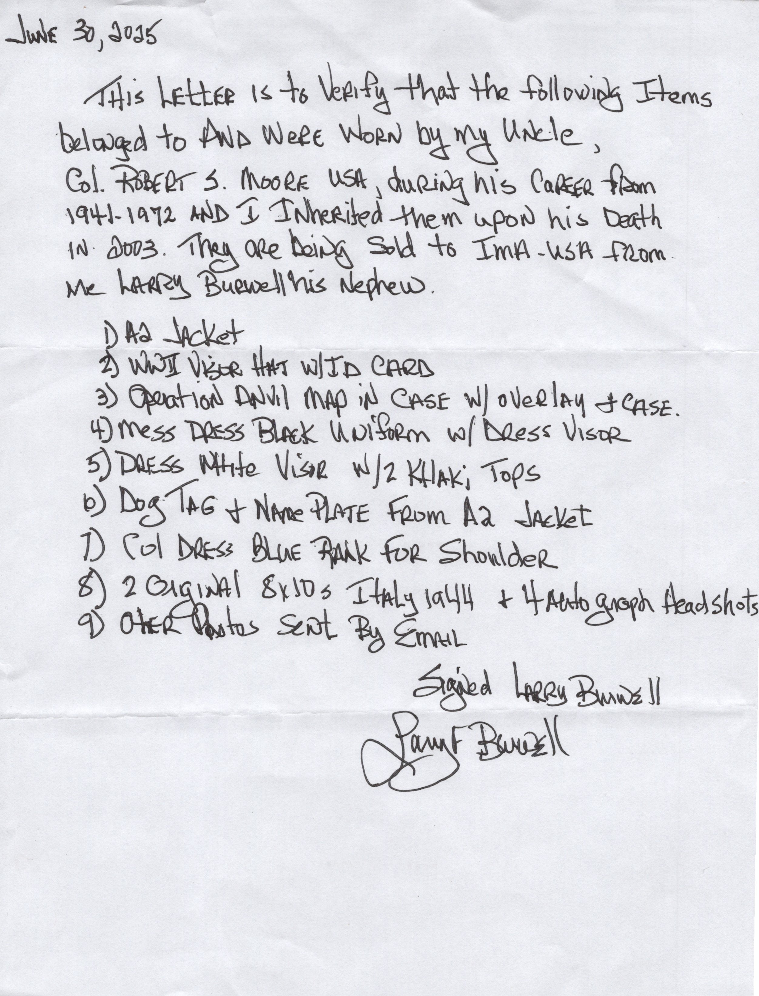 - Signed letter from Moore’s nephew detailing that the items in this group all belonged to Moore.