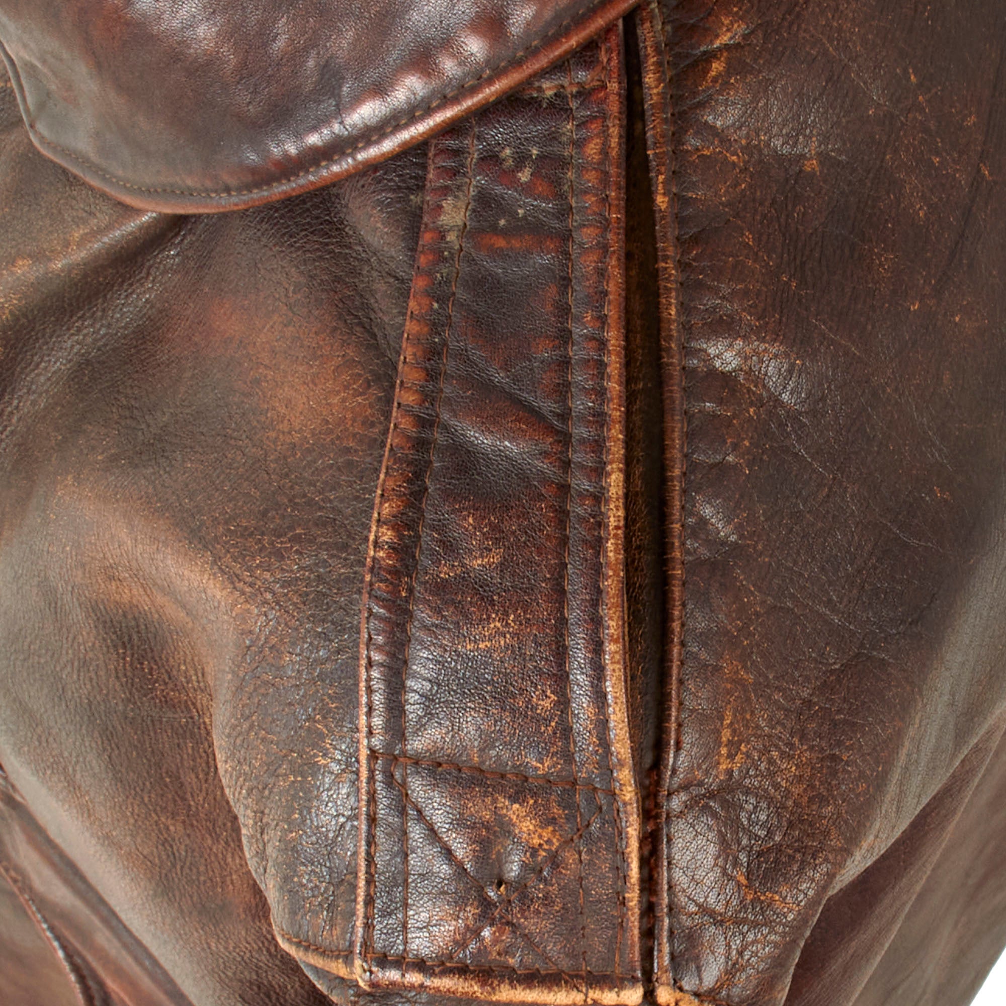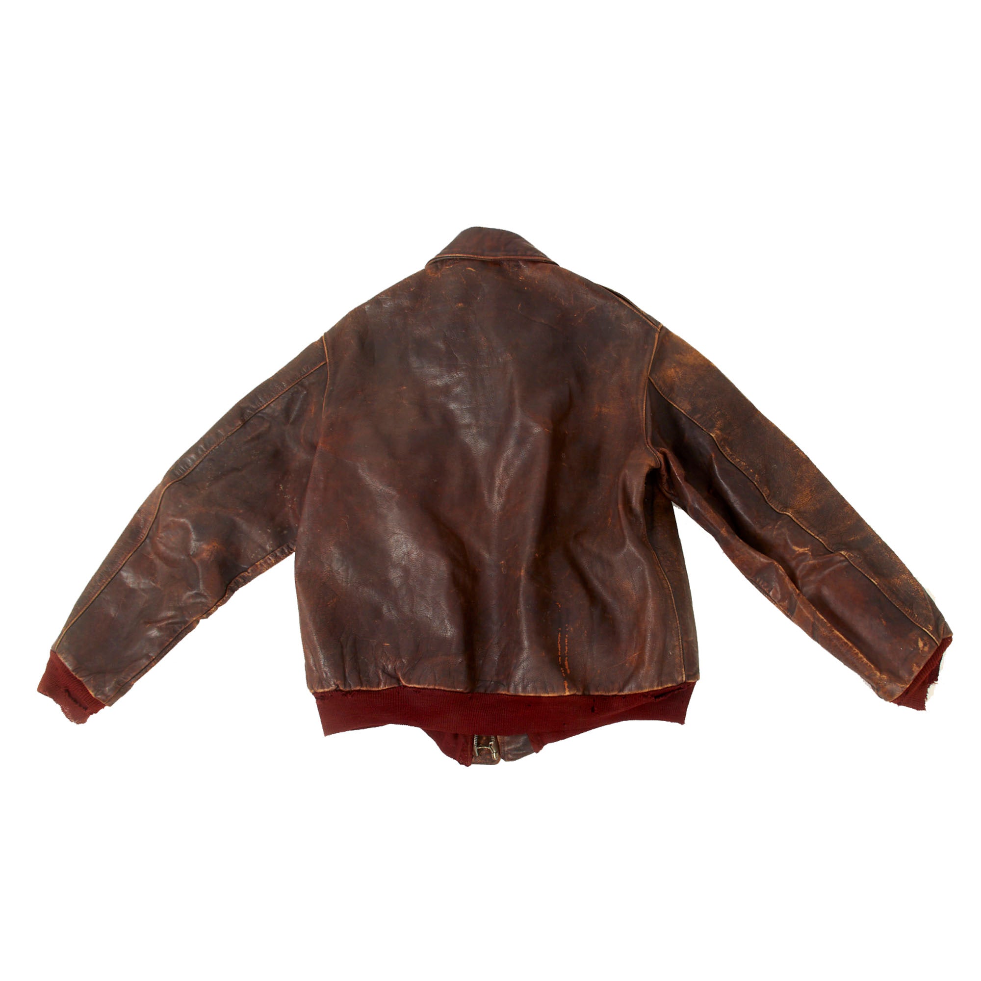 - A2 Leather Jacket worn by Moore overseas. No insignia, retains the tag, showing manufacture by Aero Leather Clothing Co. Knit cuffs and waistband are original but show heavy wear.