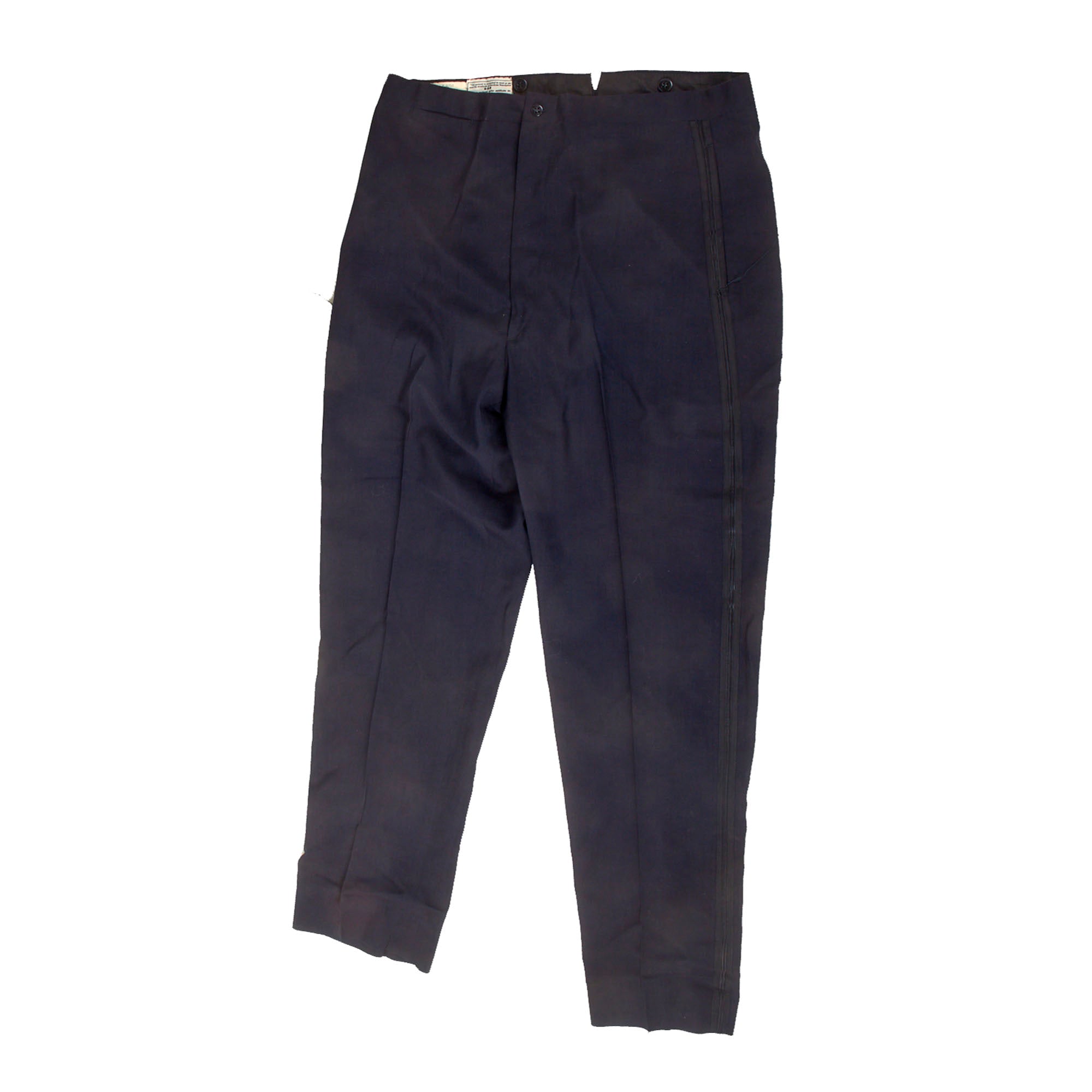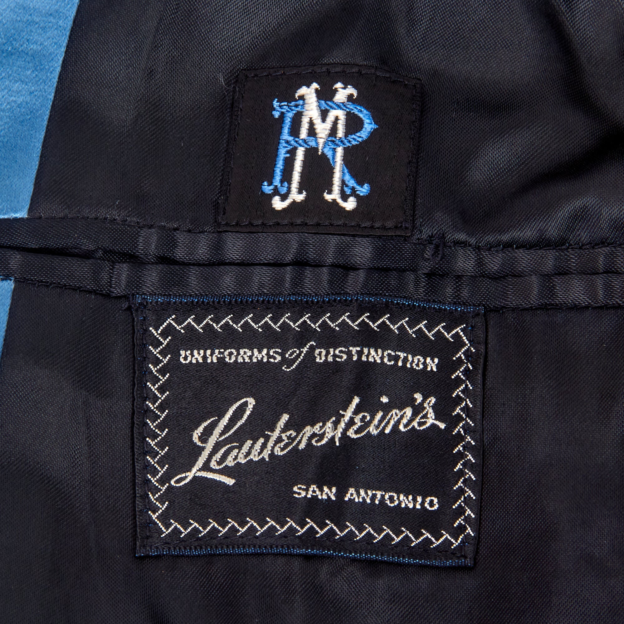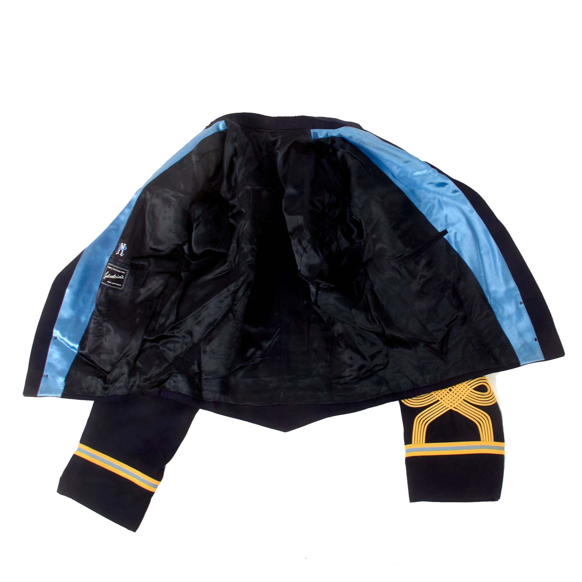 - Moore’s Officer’s mess dress jacket with braided rank for Colonel on each cuff. The interior shows RM monogrammed over the pocket, with his name written on the interior pocket name tag. The matching trousers are also included with a typed name tag COL. R. MOORE on the interior.
