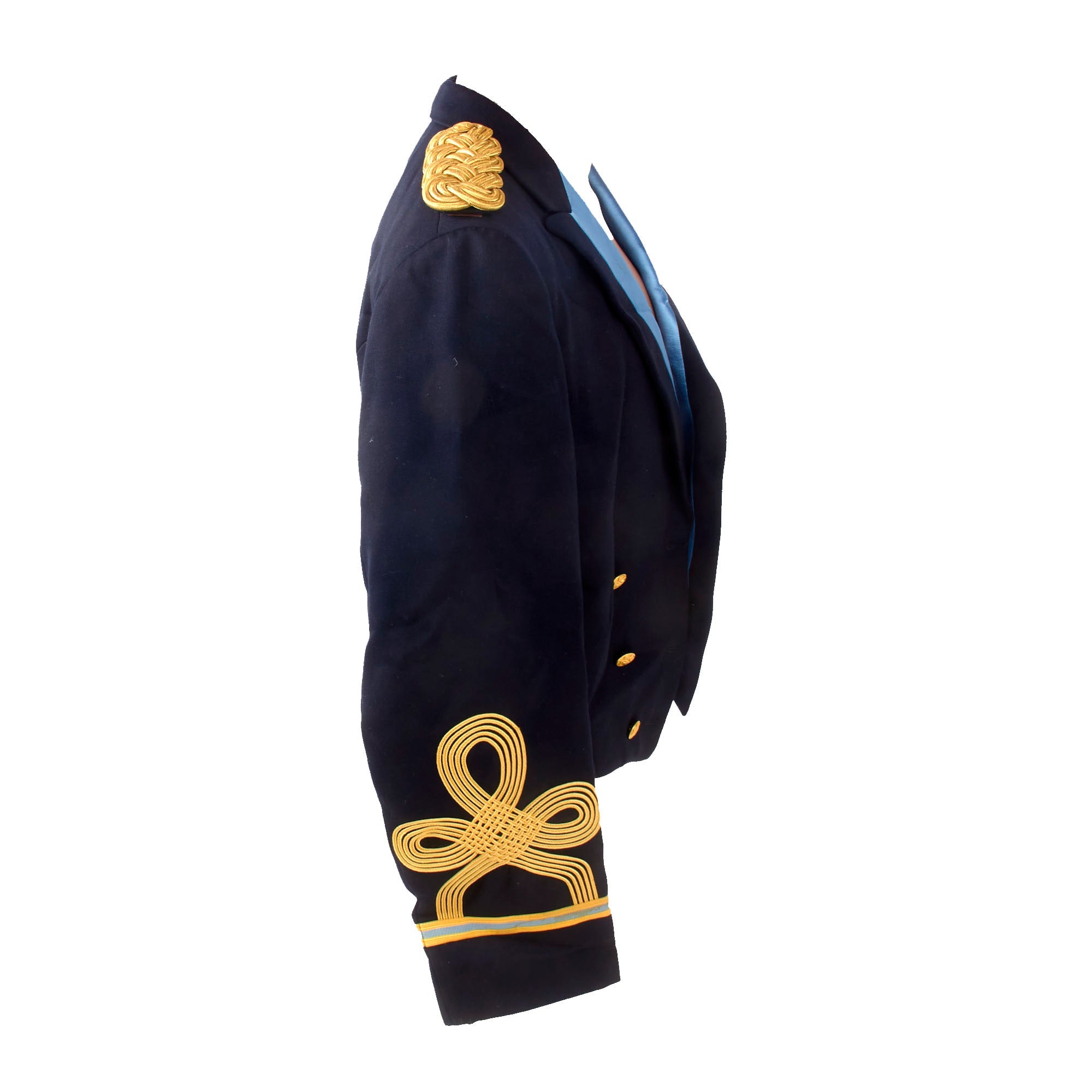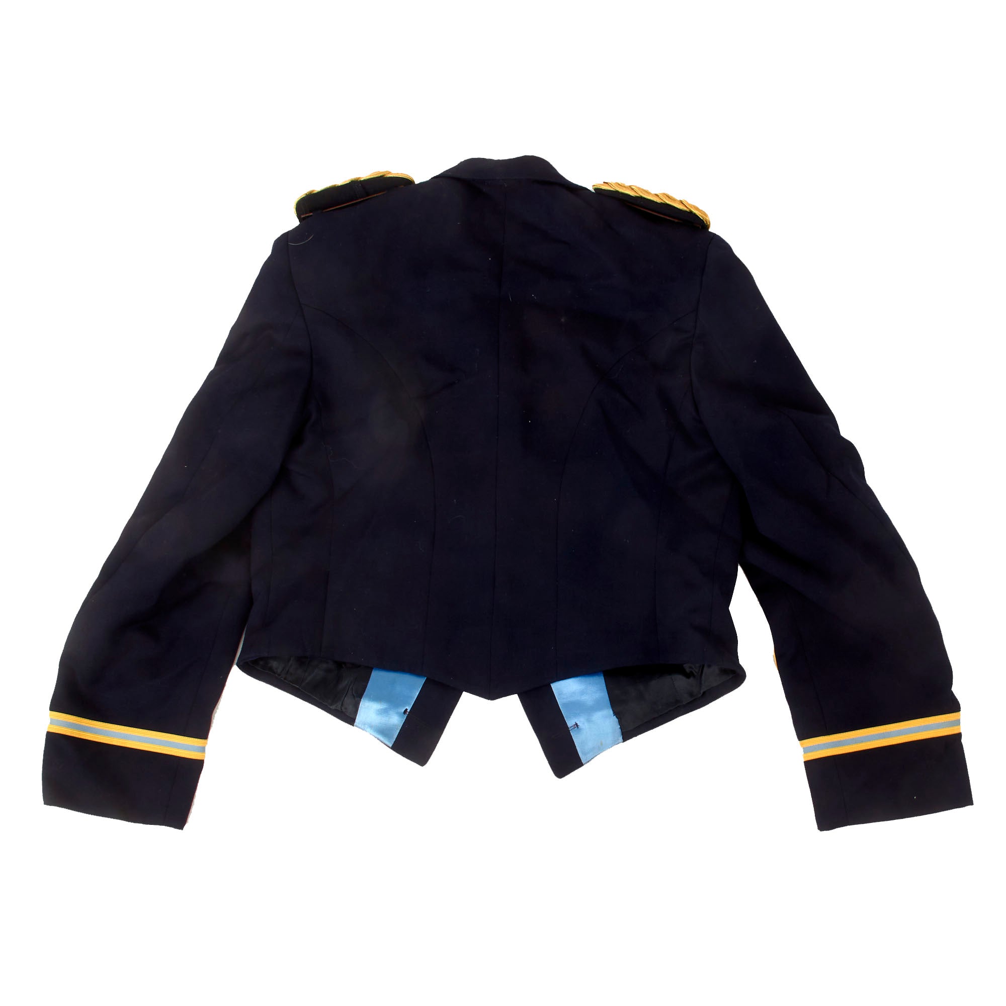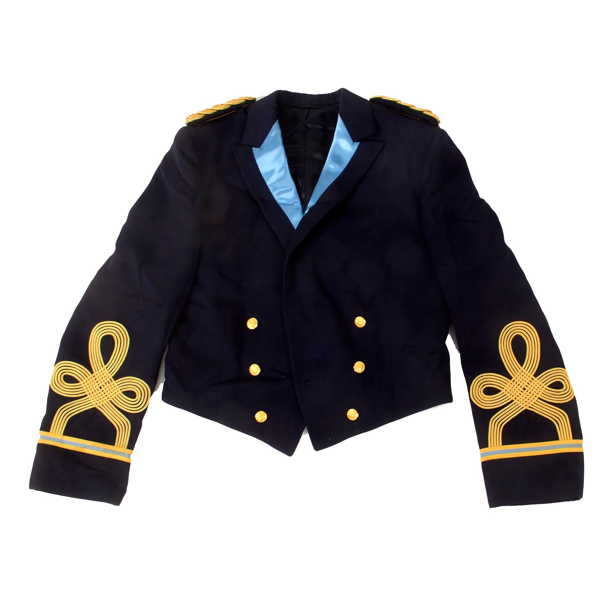 - Moore’s Officer’s mess dress jacket with braided rank for Colonel on each cuff. The interior shows RM monogrammed over the pocket, with his name written on the interior pocket name tag. The matching trousers are also included with a typed name tag COL. R. MOORE on the interior.