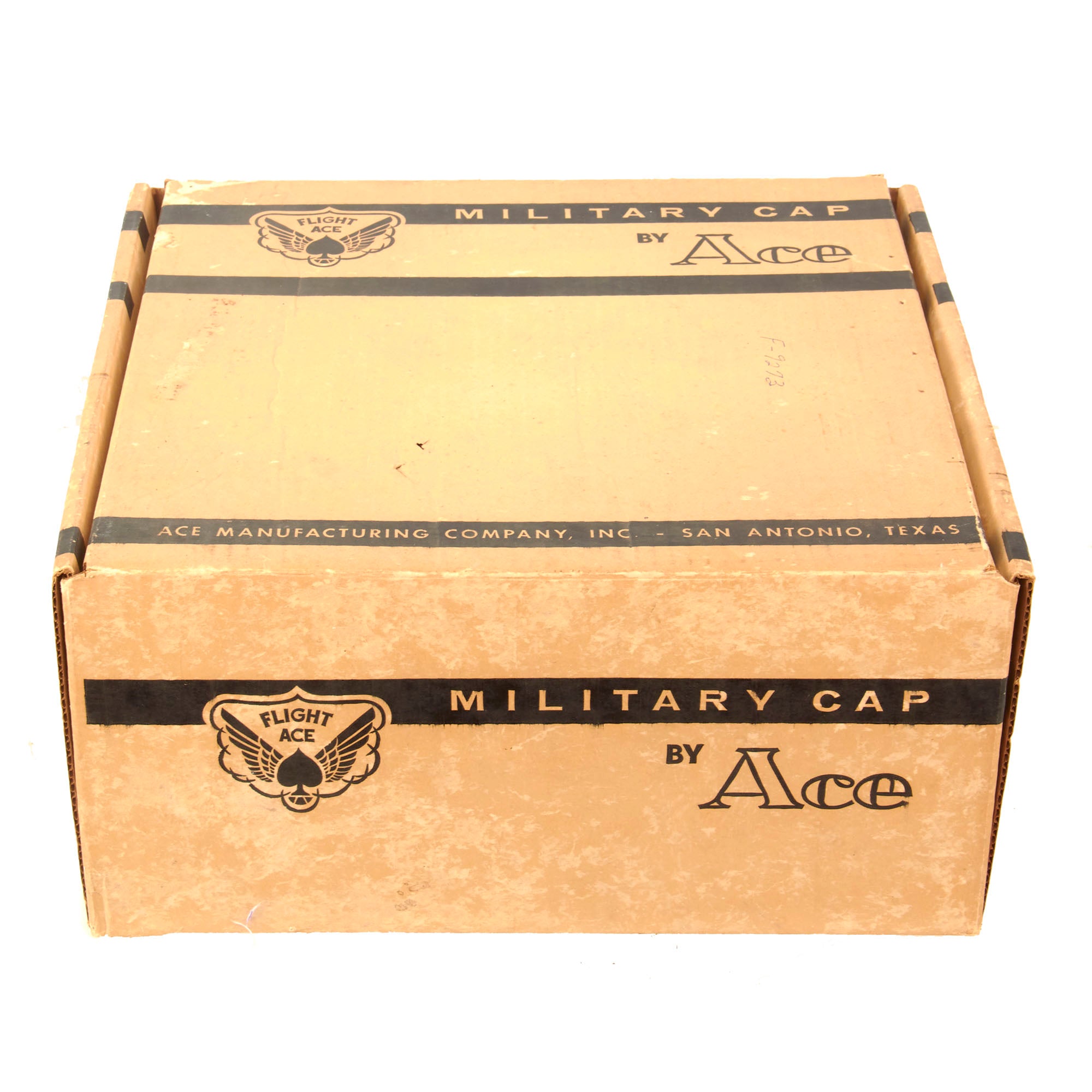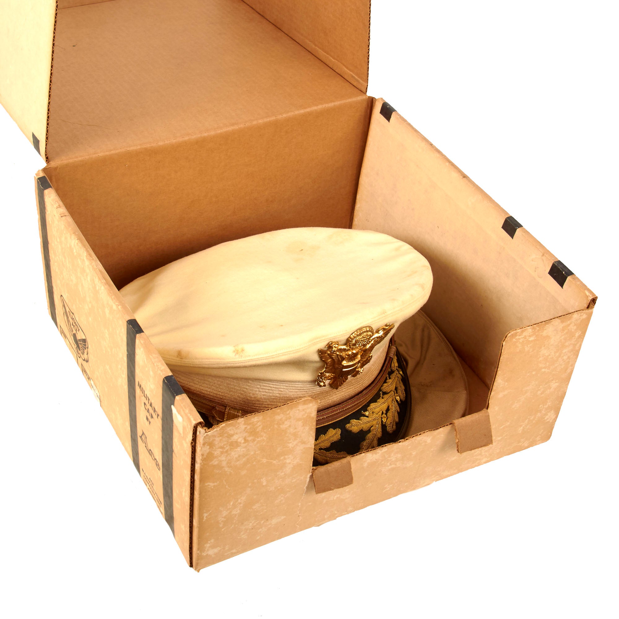 - Moore’s Flight Ace Military Cap in the Original Box with two rain covers. The cap is a lightweight white example with bullion oak leaves and acorns on the visor and a gold tape chinstrap held in by two gilt Federal eagle buttons. The cap eagle is a very gilded example, and the cap shows heavy overall wear. The interior has a name tag filled out by hand, Col. Robert S. Moore, O-25253. Size 7 ⅜. The original box measures 13 x 12 ½ x 6 ¼”. This is an outstanding set to find in the original box.