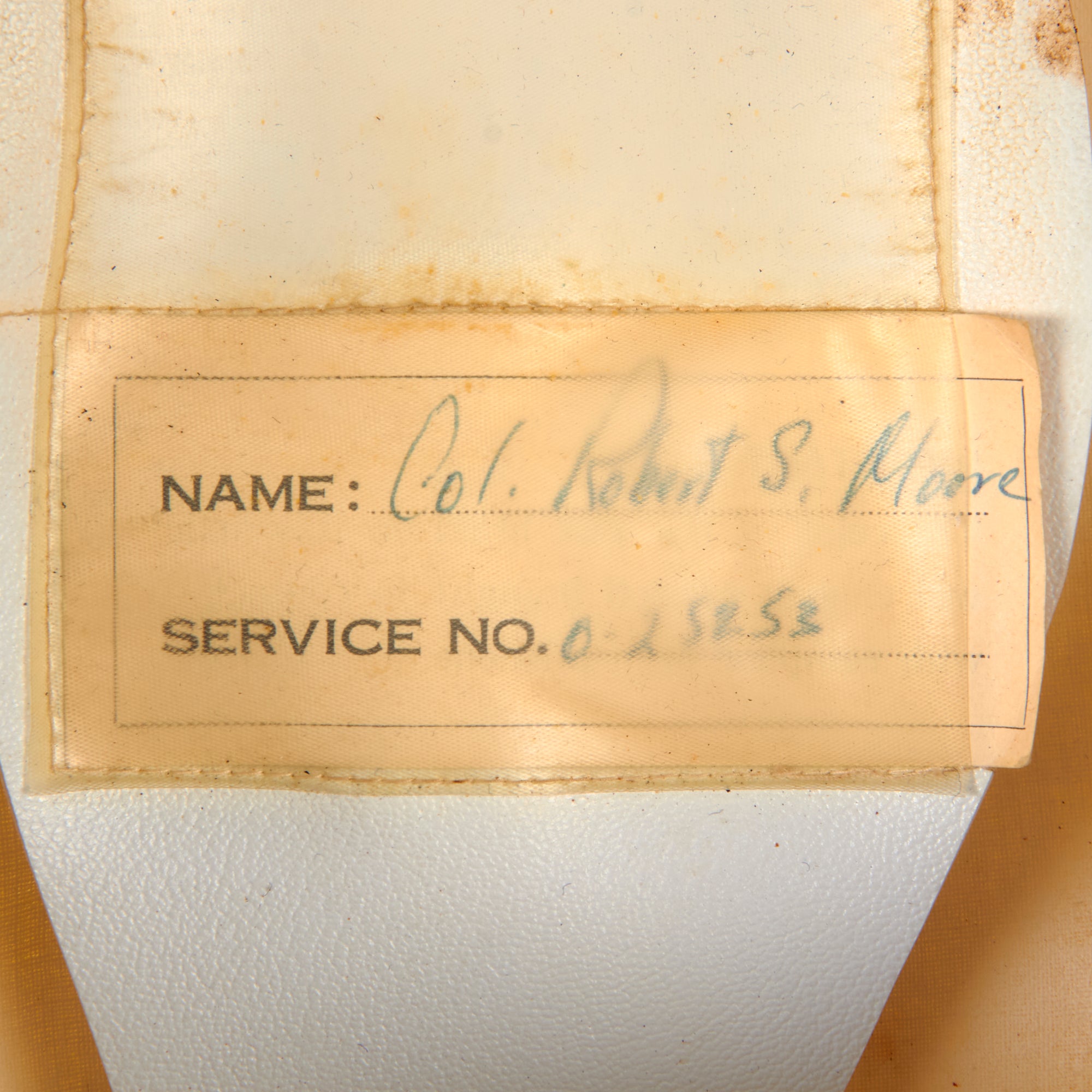 - Moore’s Winter Officer’s Visor with wrap-around chinstrap and calling card in crown, reading Robert S. Moore / Lieutenant Colonel / United States Army. Visor shows heavy wear across exterior and interior with verdigris on buttons.
