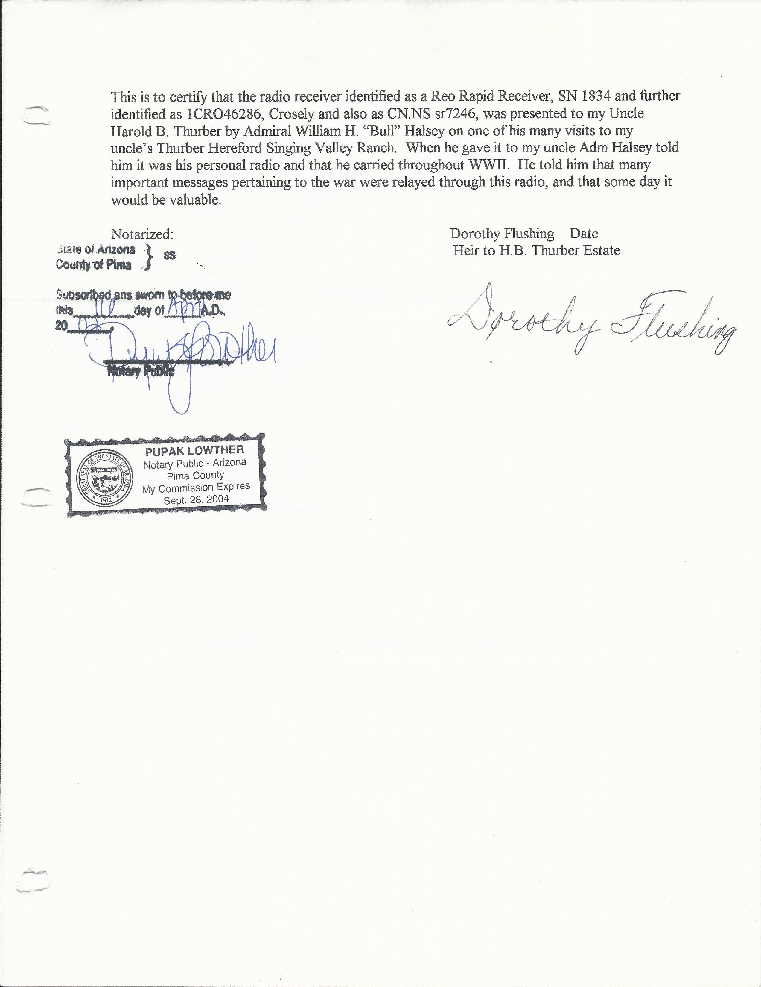 This is to certify that the radio receiver identified as a Reo Rapid Receiver, SN 1834 and further identified as 1 CR046286, Crosely and also as CN.NS sr7246, was presented to my Uncle Harold B. Thurber by Admiral William H. "Bull" Halsey on one of his many visits to my uncle's Thurber Hereford Singing Valley Ranch. When he gave it to my uncle Adm Halsey told him it was his personal radio and that he carried throughout WWII. He told him that many important messages pertaining to the war were relayed through this radio, and that some day it would be valuable.