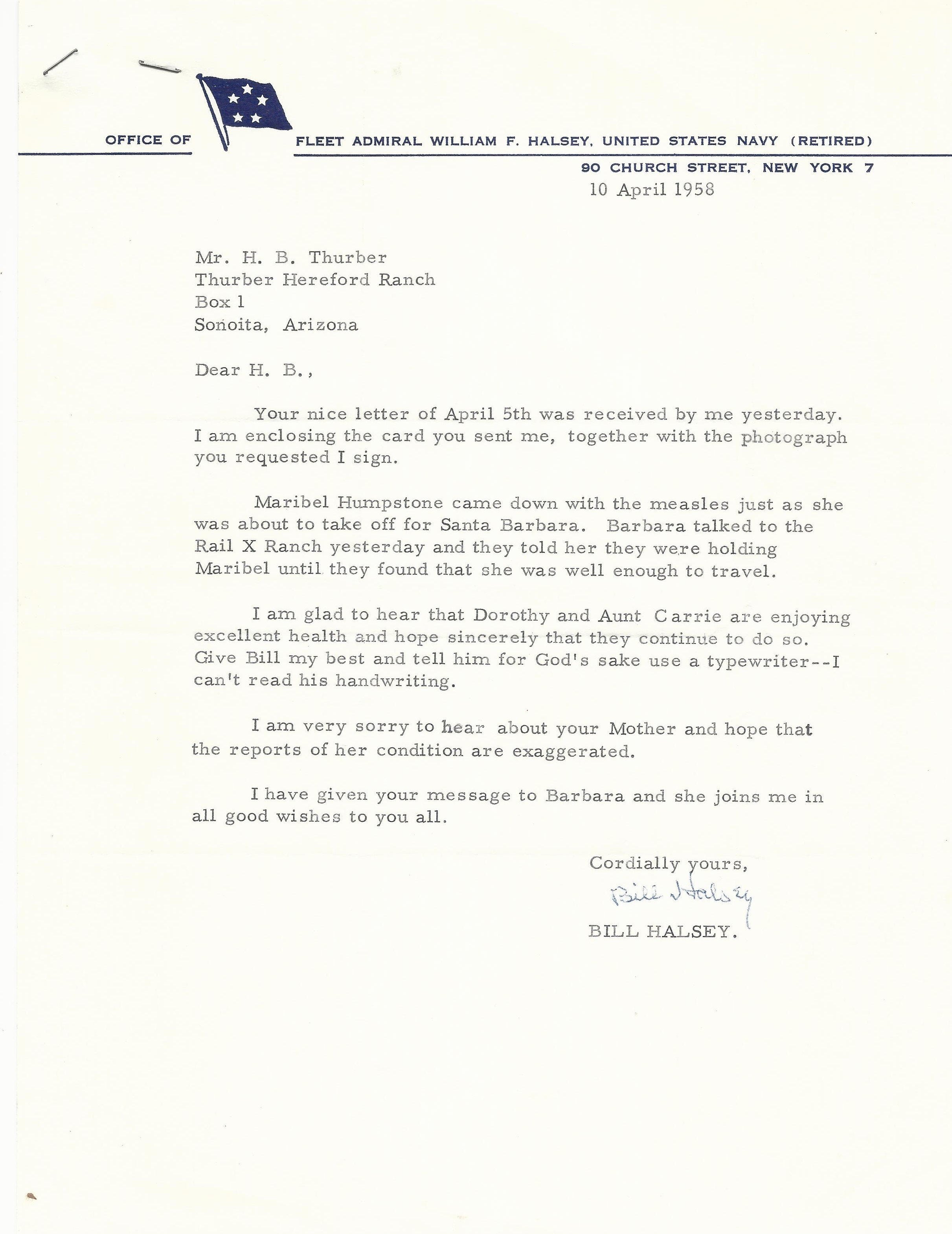 - A signed letter from Halsey to Thurber at this Hereford Ranch in Sonita, Arizona dated 10 April 1958.