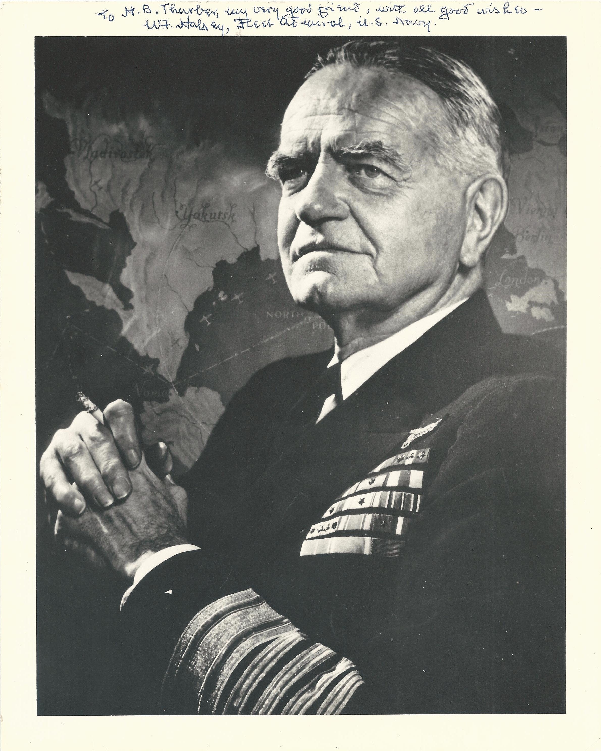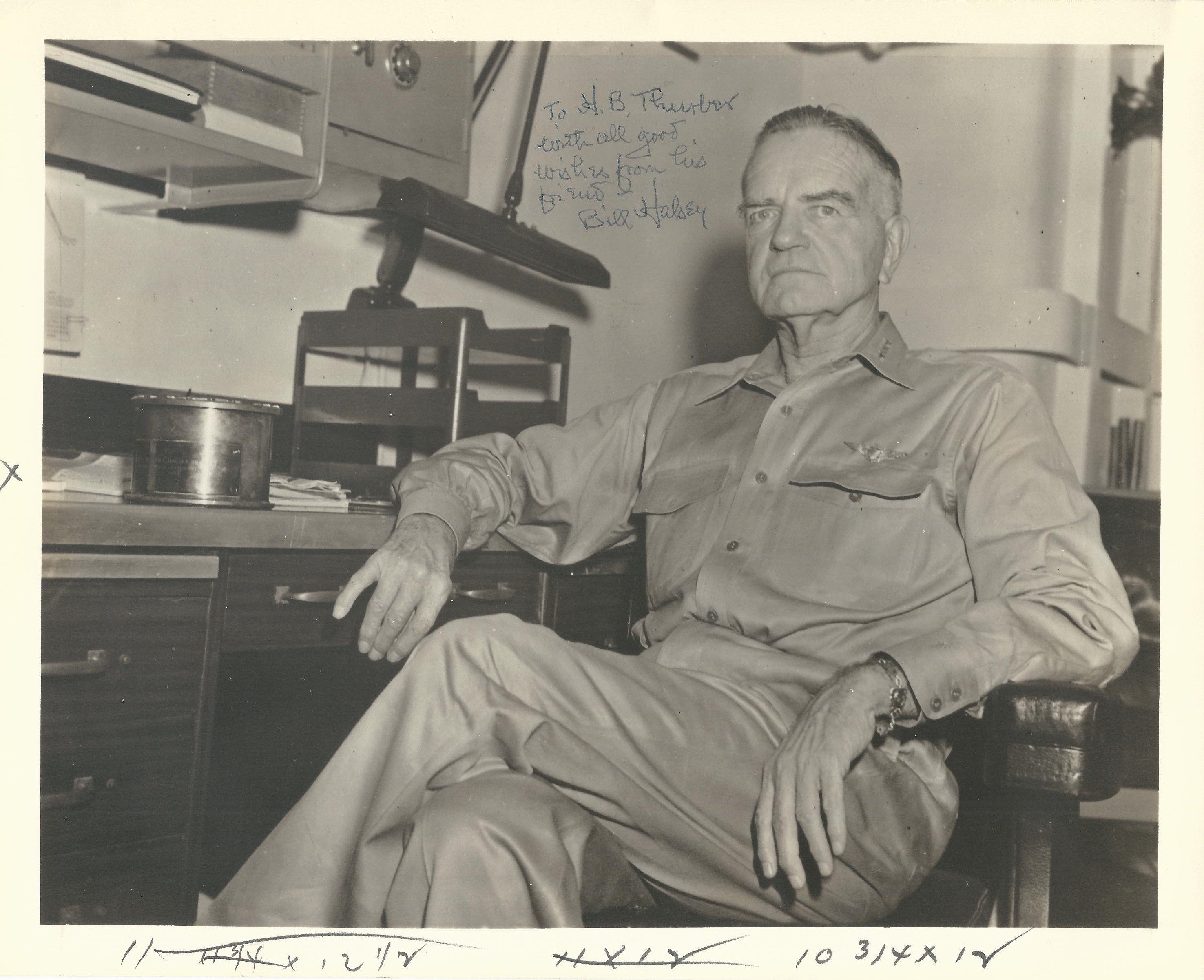 - 2 x signed photos of Admiral Halsey both made out to "My good friend" H.B. Thurber signed by Halsey.