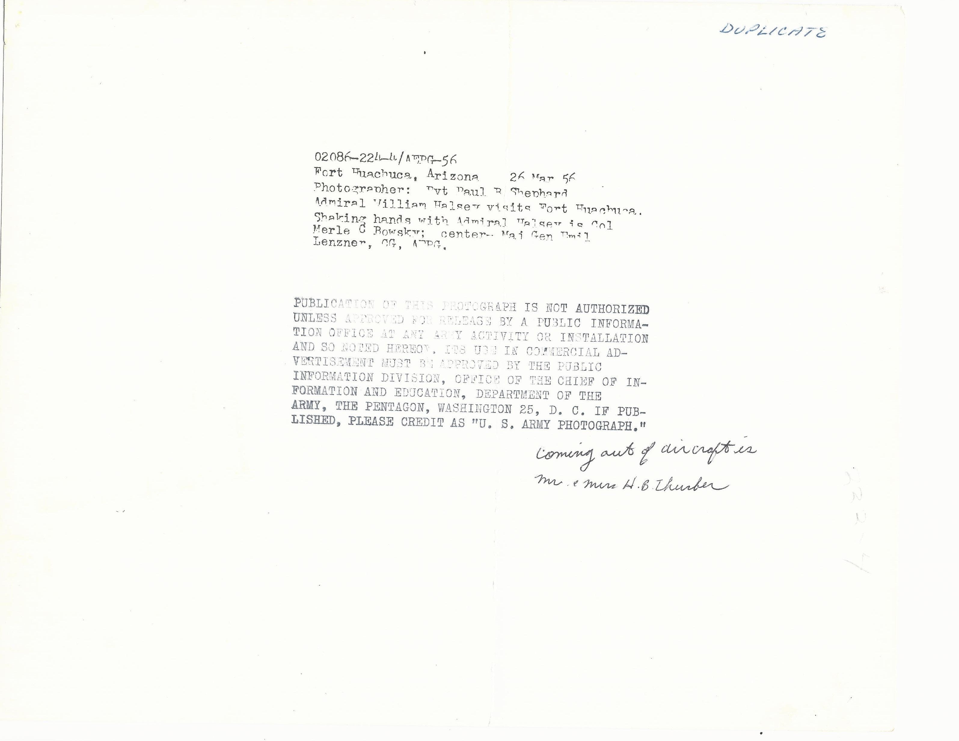 - 6 x Original Official Public Information Office 8' x 10" photos of Admiral Halsey with Harold Thurber (wearing the cowboy hat).