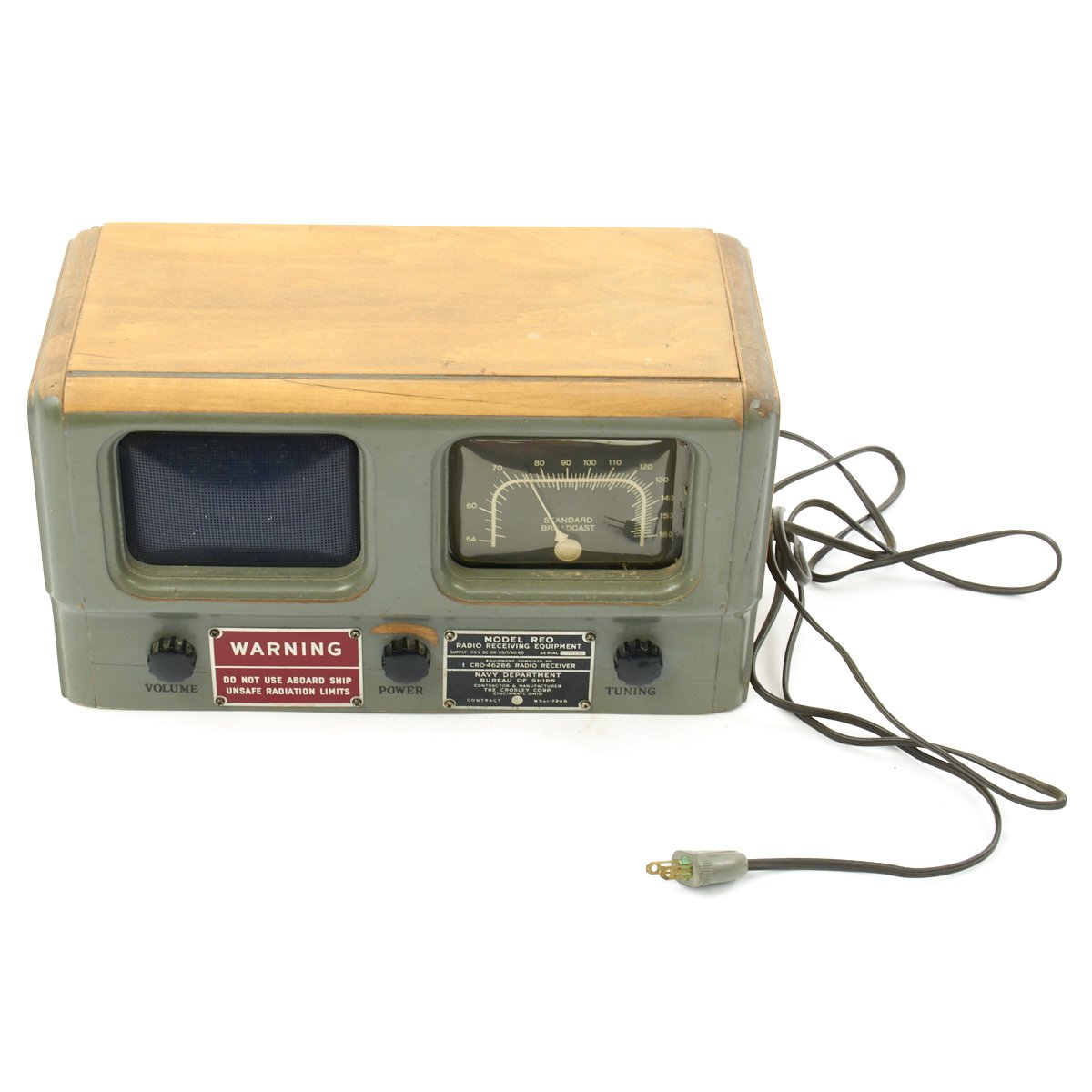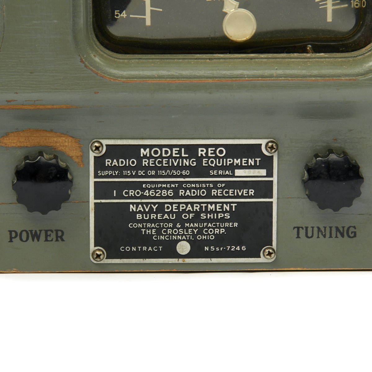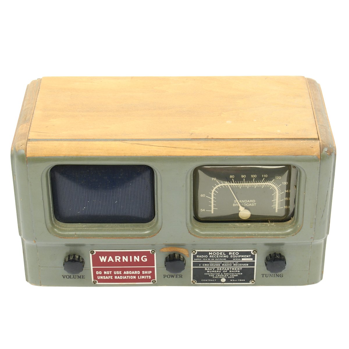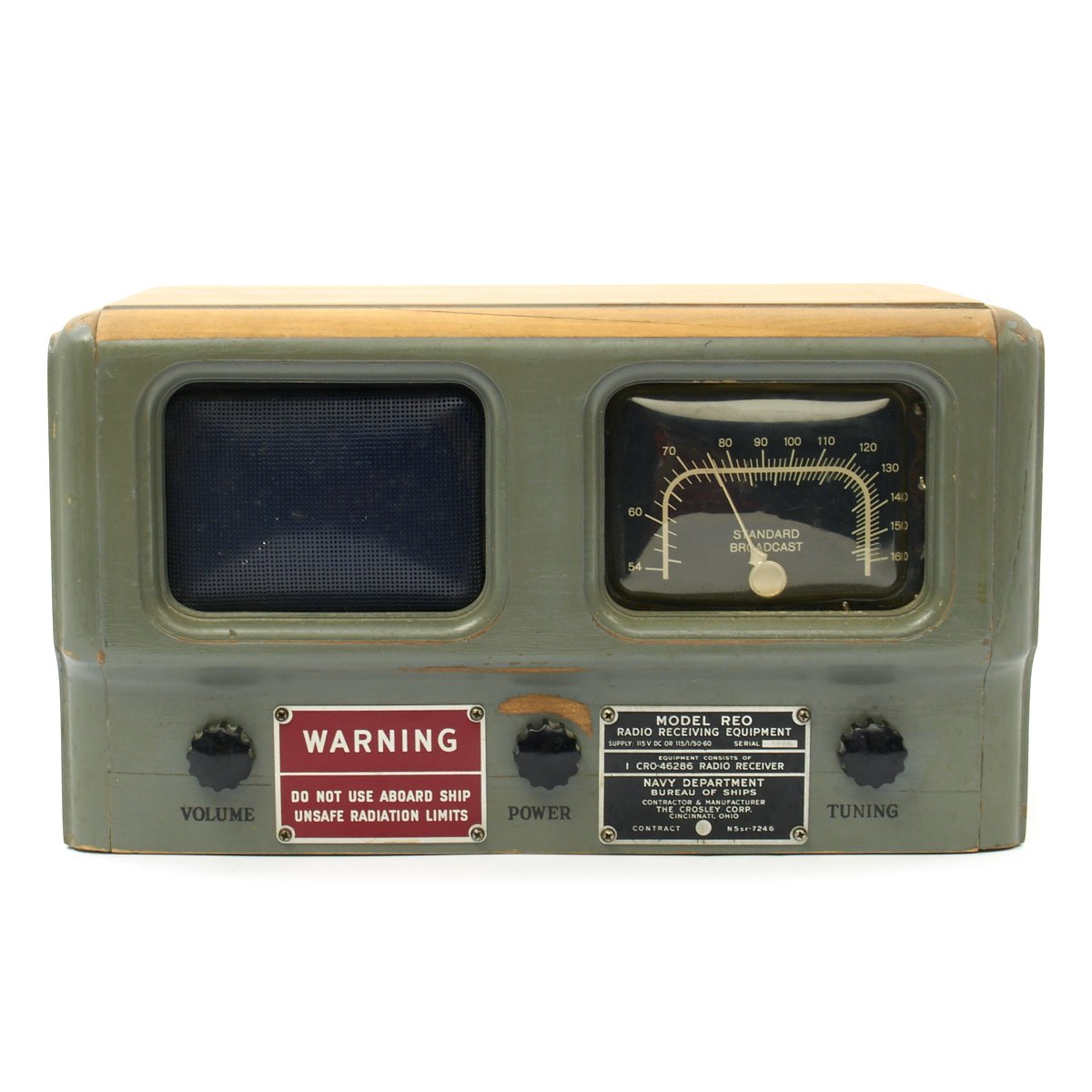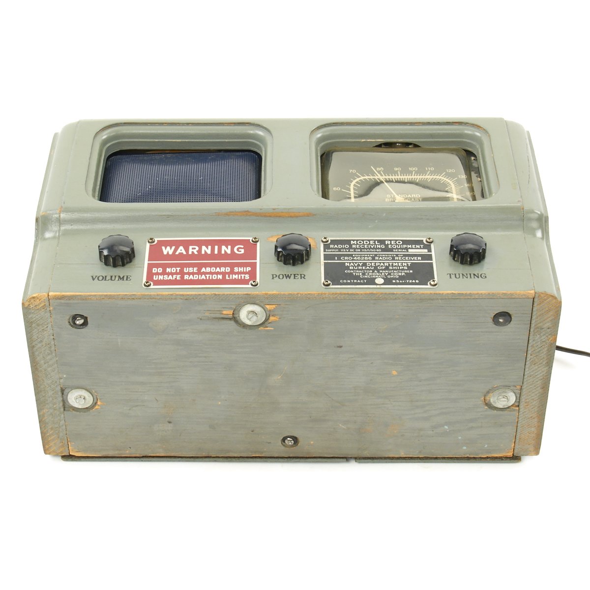 Original Item: One-of-a-kind. This a rare late WW2 tube radio that was made for the U.S Navy by Crosley contract N5SR-7246 (May 1945). This was called a Morale radio intended for the listening pleasure of sailors on land only. The red warning tag states that it was not safe to use aboard ship. This is a model REO that is AM band only. With a wire antenna hooked up I was able to receive multiple stations, many of them distant. The radio measures approximately 14 x 7 x 8". The overall condition is excellent. We plugged it in and it does seem to function!